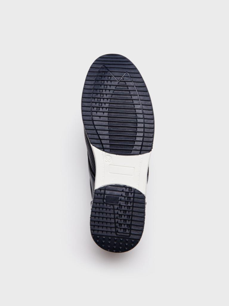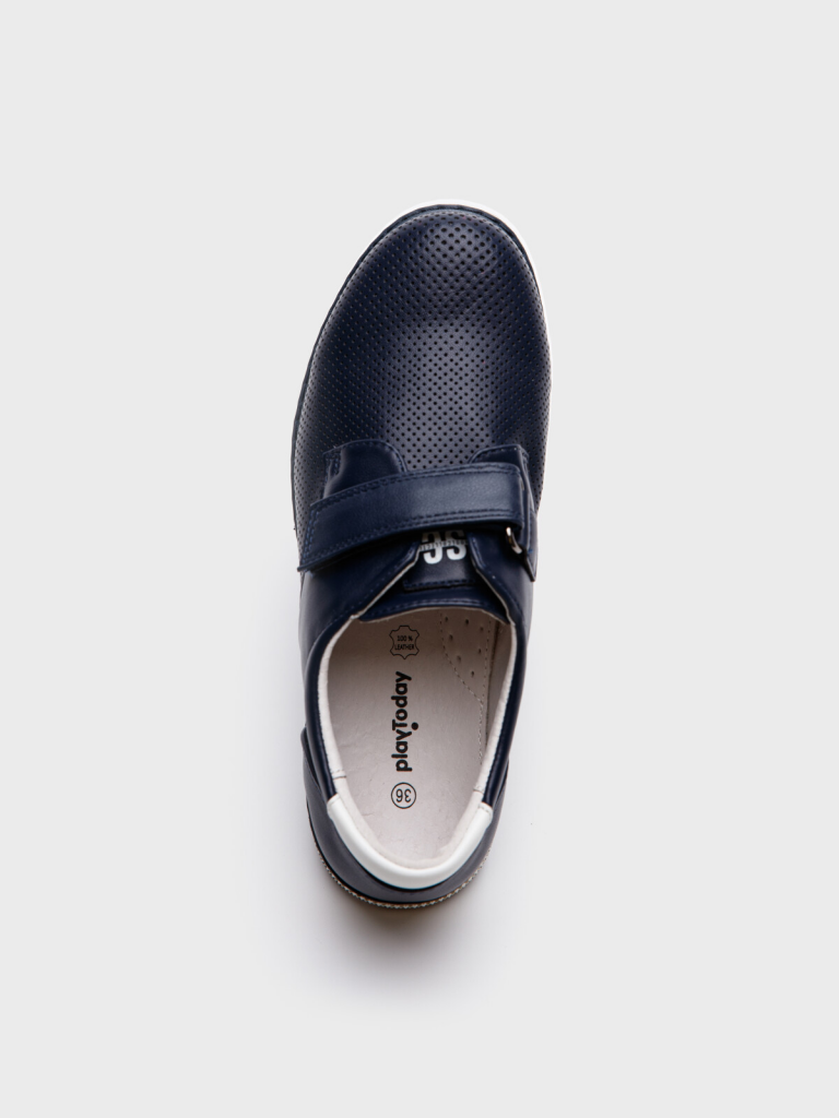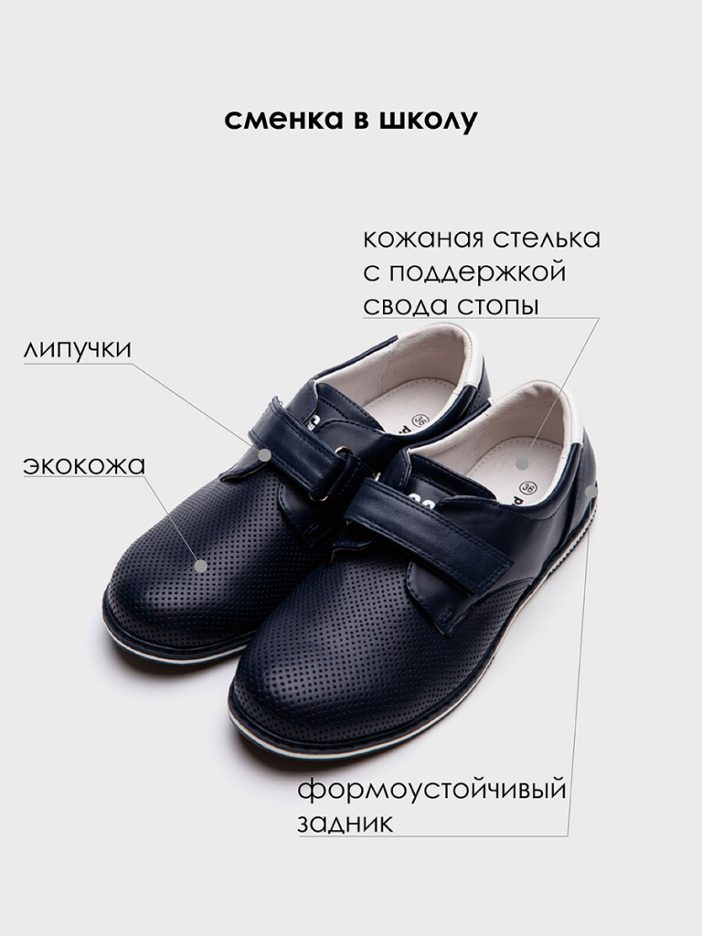 Модные полуботинки для мальчика подростка. Верх обуви выполнен из искусственной кожи, обладающей высокими эксплуатационными свойствами. Добавление перфорации делает обувь более воздухопроницаемой. Подкладка выполнена из натуральной кожи. Кожаная стелька с анатомическим элементом обеспечивает правильную нагрузку на стопу. Формоустойчивый задник поддерживает стопу в правильном положении. Удобная застежка-липучка дают возможность регулировать обувь на любой подъем. Подошва не скользит и устойчива к истиранию. Туфли для мальчика школьника отлично подойдут как сменка в школу, так и для и для прогулок: весна, лето, осень.
