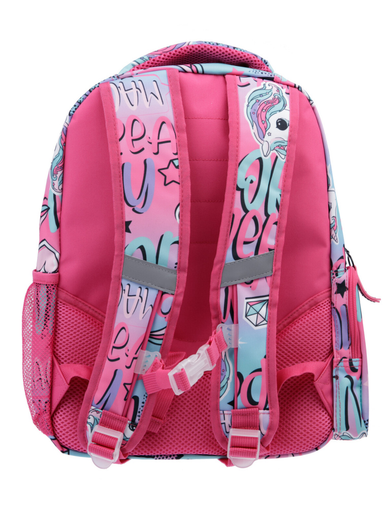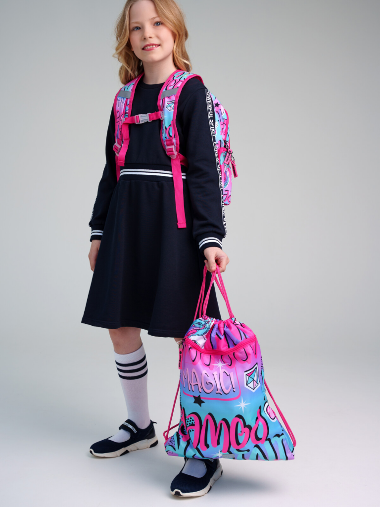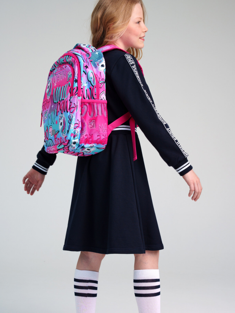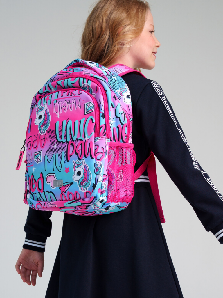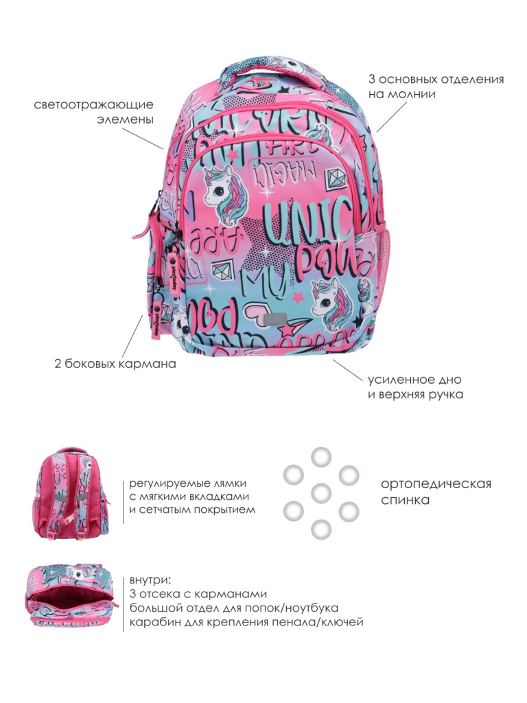 Рюкзак текстильный для девочки. 38*29*19 см. Широкие регулируемые лямки с мягкими вкладками и сетчатым покрытием. Ортопедическая спинка. 3 основных отделения на молнии. 2 боковых кармана: сетчатый и на молнии. Внутри рюкзака: 1 отсек - карман на молнии, открытые карманы для канцелярии. 2 отсек - без карманов, 3 отсек - карман для папок, карман на молнии, 2 кармана без замка, карабин для крепления пенала/ключей. Усиленная спинка, дно и верхняя ручка. Светоотражающие элементы на переднем кармане и плечевых ремнях.