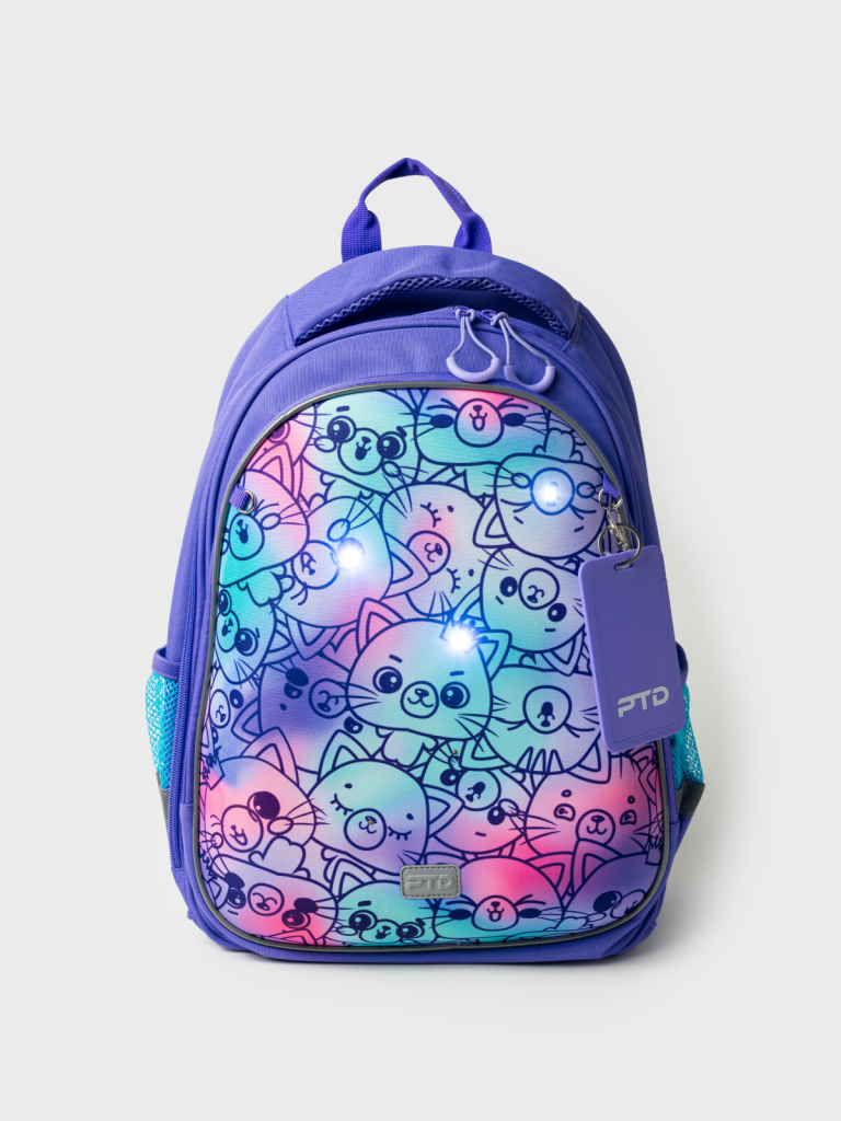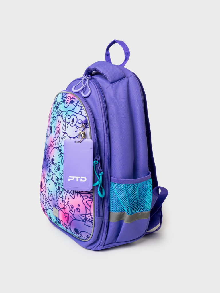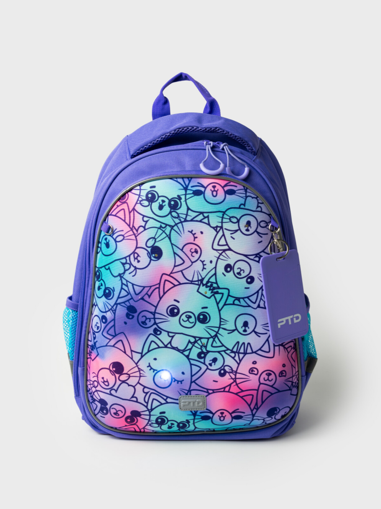 Уникальность дизайна ранца заключается в использовании светодиодных лампочек на передней панели. Формоустойчивый рюкзак с ортопедической спинкой для девочки школьницы. Конструкция ортопедической вентилируемой спинки обеспечивает максимальный комфорт и позволяет снизить нагрузку на спину школьников и дошкольников. Широкие мягкие вентилируемые лямки регулируются по высоте, что делает рюкзак идеальным как для первоклассника, так и для детей из средней школы. Спереди лямки можно закрепить на застежку, чтобы они не спадали. Дно имеет уплотнение. Снизу дна имеются резиновые ножки, чтобы низ рюкзака не пачкался. Рюкзак имеет два основных отделения на молнии. Внутри имеется несколько отделений и кармашков для систематизации школьных принадлежностей. По бокам есть карманы. У рюкзака есть две ручки: одна - мягкая вентилируемая ручка для ношения в руках, вторая маленькая - для того, чтобы рюкзак можно было вешать на вешалку. Модель выполнена из водонепроницаемой ткани. Рюкзак имеет светоотражающие детали на лямках, по бокам, на переднем отделении, чтобы ребенка было хорошо видно в темноте со всех сторон. В подарок идет пластиковый чехол для пропуска на растягивающейся пружине. Пружина дает возможность спокойно приложить пропуск к турникету не снимая рюкзак. Рюкзак в школу можно дополнить мешком для обуви и пеналом в том же дизайне. Размер рюкзака: 30*39*19 см. Вес рюкзака: 830 гр
