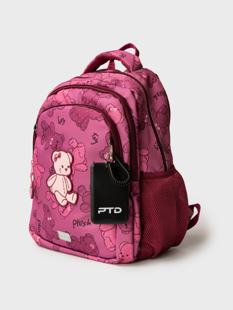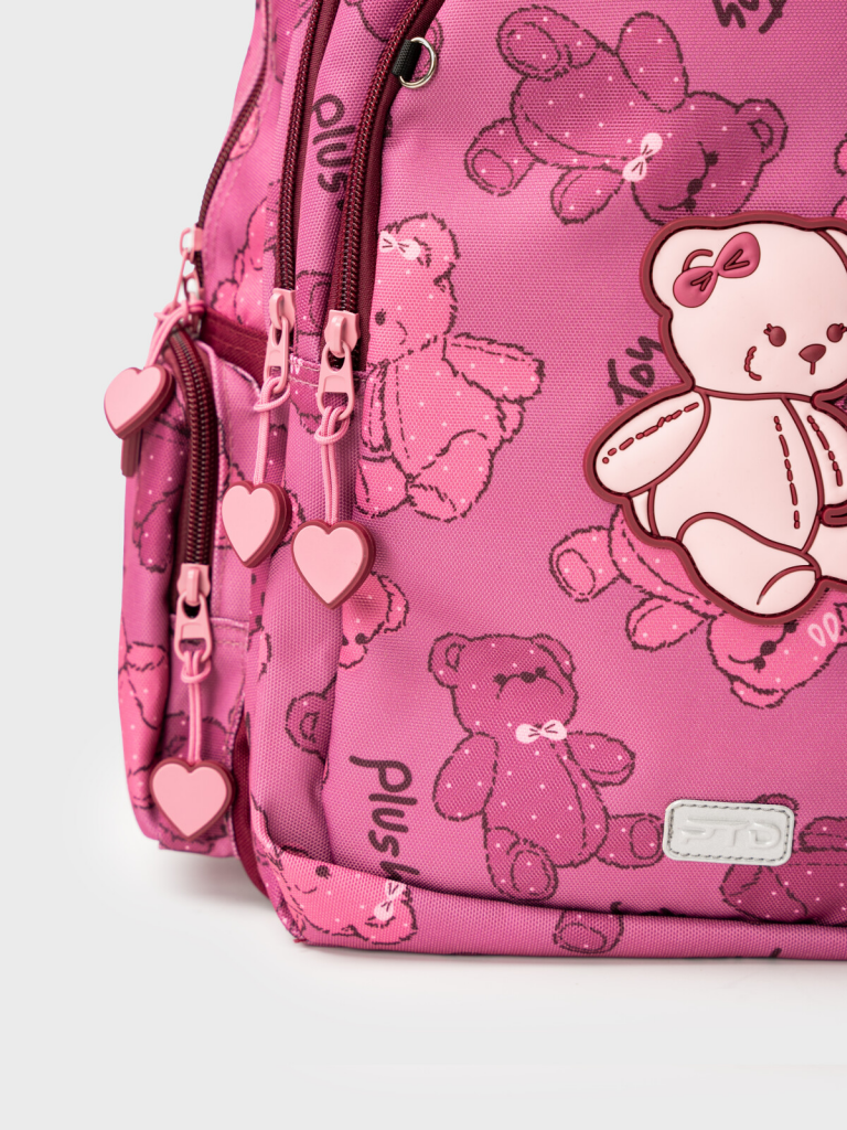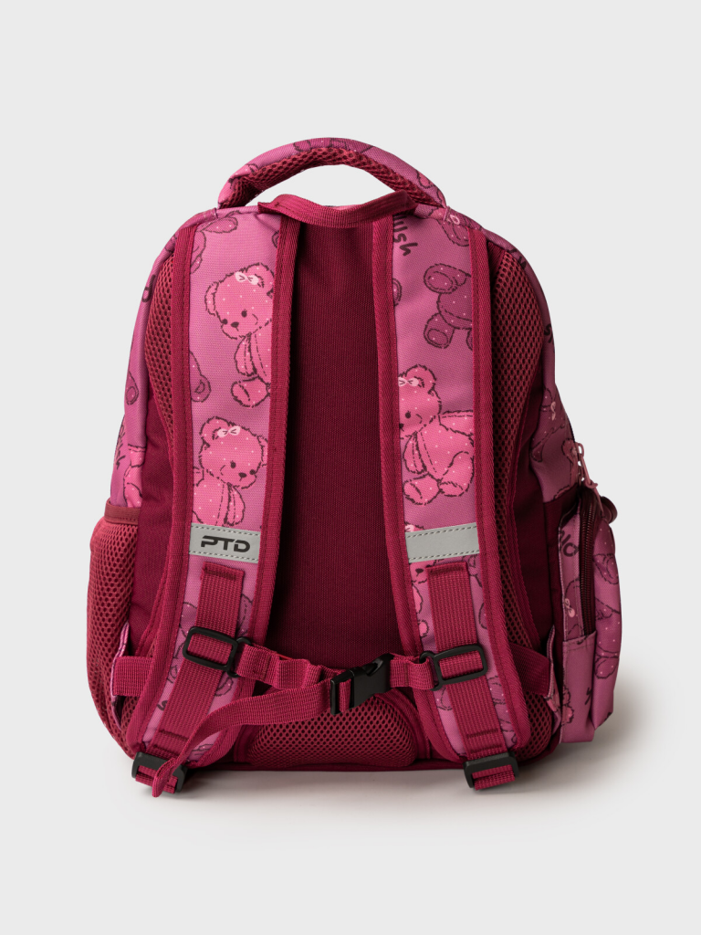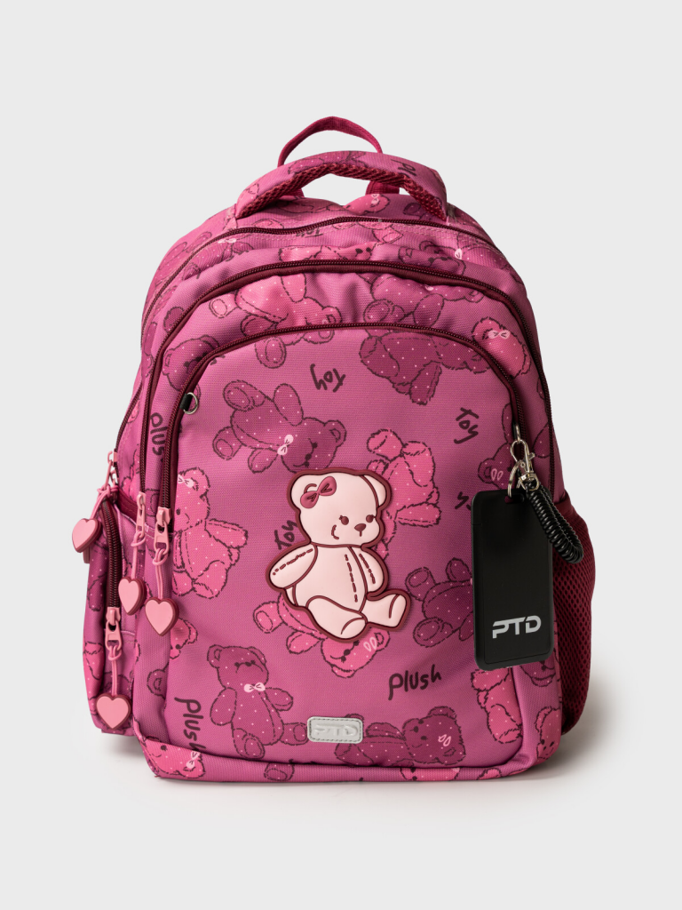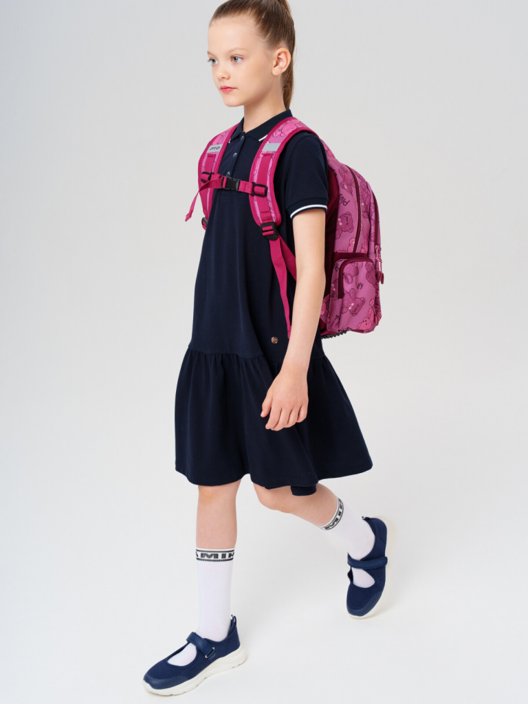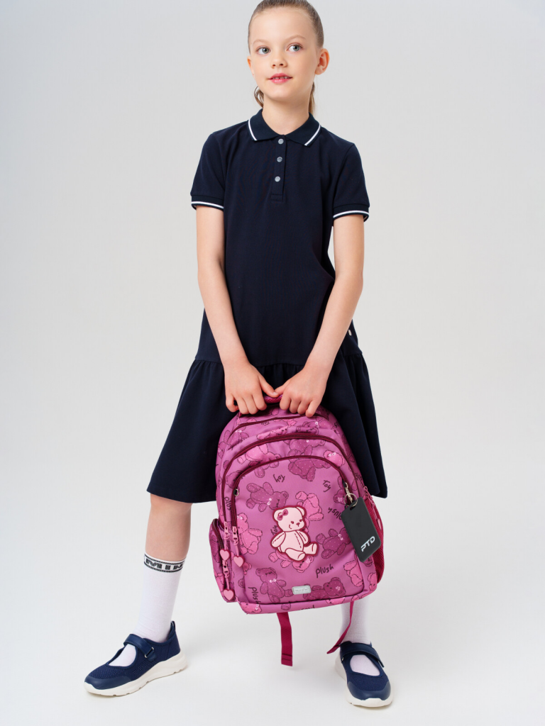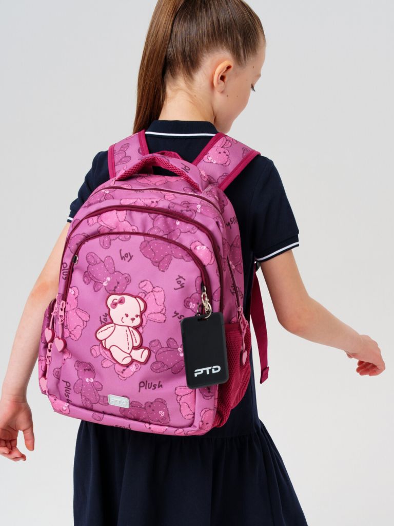 Трехсекционный рюкзак с ортопедической спинкой для девочки школьницы. Конструкция ортопедической вентилируемой спинки обеспечивает максимальный комфорт и позволяет снизить нагрузку на спину школьников и дошкольников. Широкие мягкие вентилируемые лямки регулируются по высоте, что делает рюкзак идеальным как для первоклассника, так и для детей из средней школы. Спереди лямки можно закрепить на застежку, чтобы они не спадали. Дно имеет уплотнительный вкладыш, который при необходимости можно не использовать. Снизу дна имеются резиновые ножки, чтобы низ рюкзака не пачкался. Рюкзак имеет два основных отделения на молнии один большой карман спереди. Внутри имеется несколько отделений и кармашков для систематизации школьных принадлежностей. По бокам есть карманы: один - сетчатый, второй - на молнии. У рюкзака есть две ручки: одна - мягкая вентилируемая ручка для ношения в руках, вторая маленькая - для того, чтобы рюкзак можно было вешать на вешалку. Модель выполнена из водонепроницаемой ткани. Ранец имеет светоотражающие детали на лямках, по бокам, на переднем отделении, чтобы ребенка было хорошо видно в темноте со всех сторон. В подарок идет пластиковый чехол для пропуска на растягивающейся пружине. Пружина дает возможность спокойно приложить пропуск к турникету не снимая рюкзак. Ранец декорирован милым патчем Мишкой. Рюкзак в школу можно дополнить мешком для обуви и пеналом в том же дизайне. Размер рюкзака: 29*38*19 см. Вес рюкзака: 650 гр