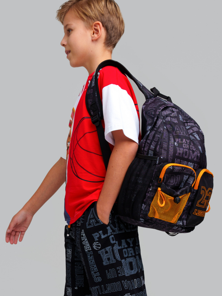 Стильный легкий рюкзак для мальчика-подростка в баскетбольной тематике с принтом. Прямые широкие регулируемые лямки с мягкими вкладками и сетчатым покрытием для улучшения вентиляции. Основной отдел на молнии с защитным клапаном. Спереди два кармана на молнии и один карман из сетки на утяжке, 2 боковых кармана из сетки на резинке. Внутри: отдел для папок, карман на молнии, 2 кармана без замка для телефона. Используется брендированная подкладка. Усиленная спинка и дно. Светоотражающие элементы на плечевых ремнях. Параметры: высота - 40 см, ширина -30 см, глубина - 15 см.