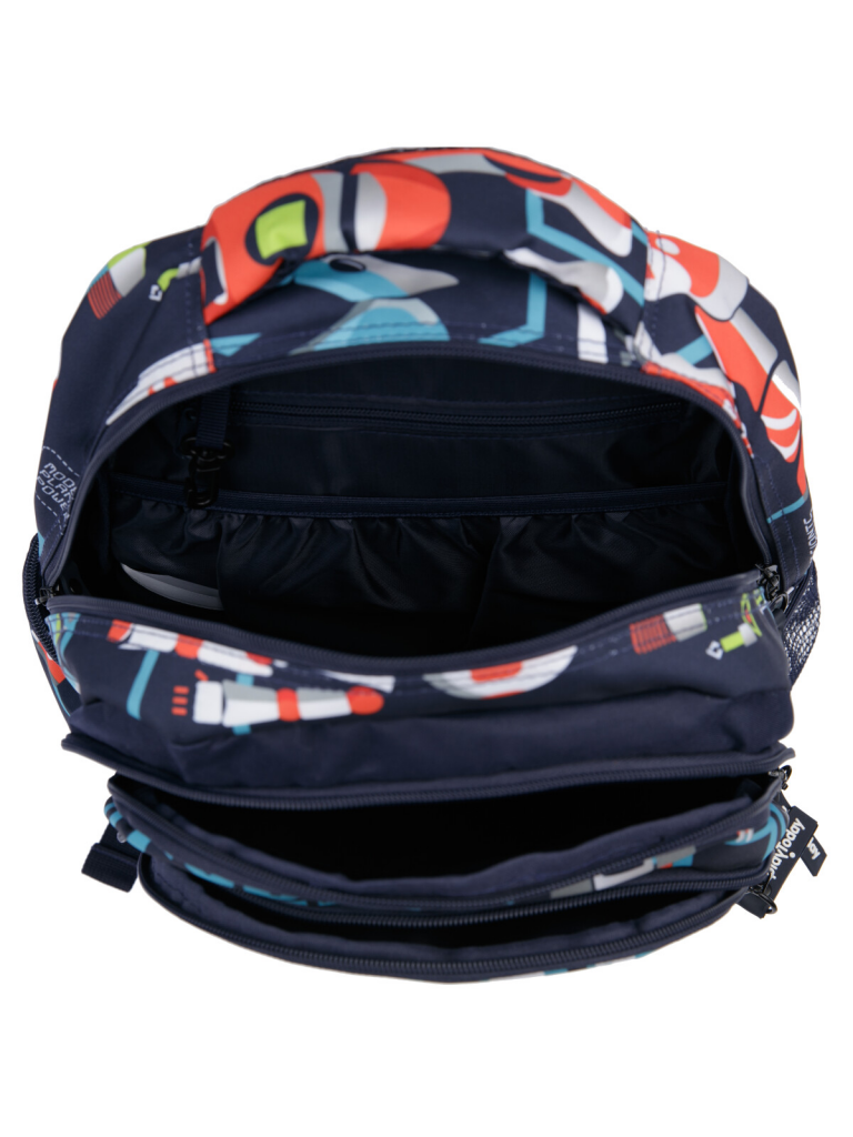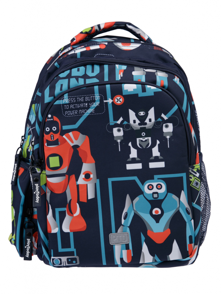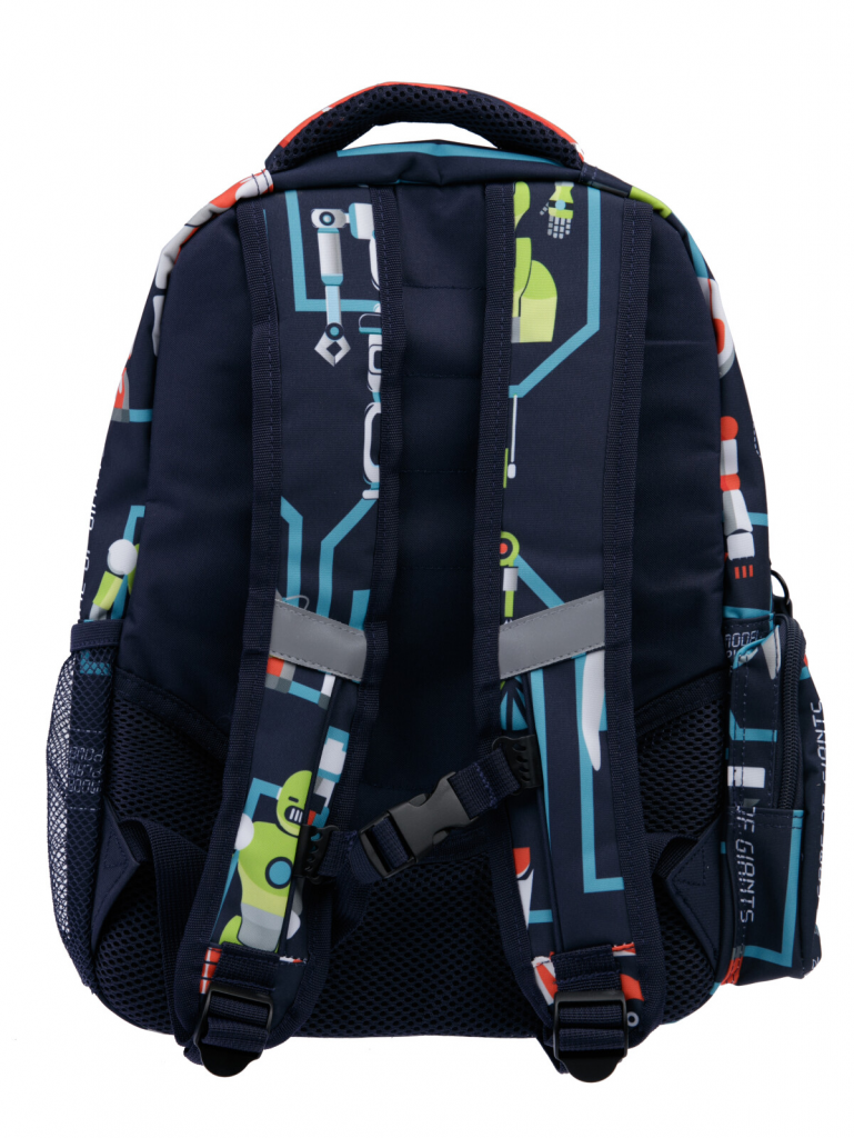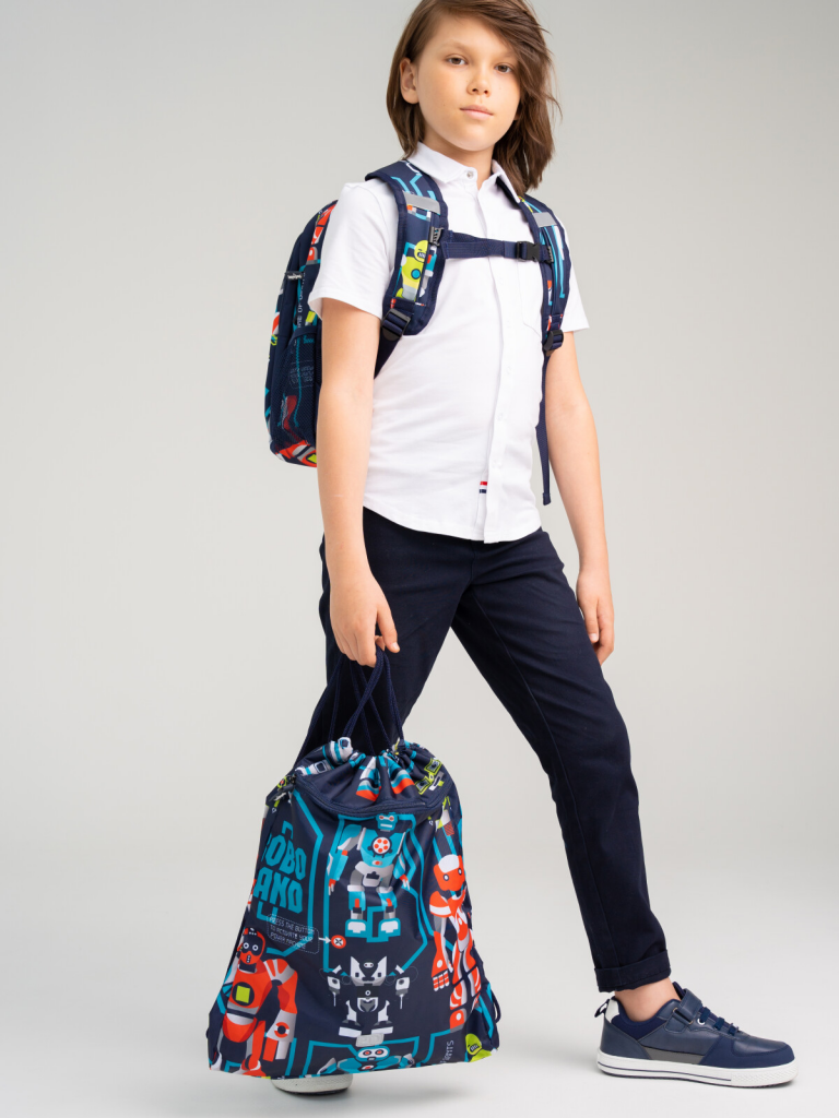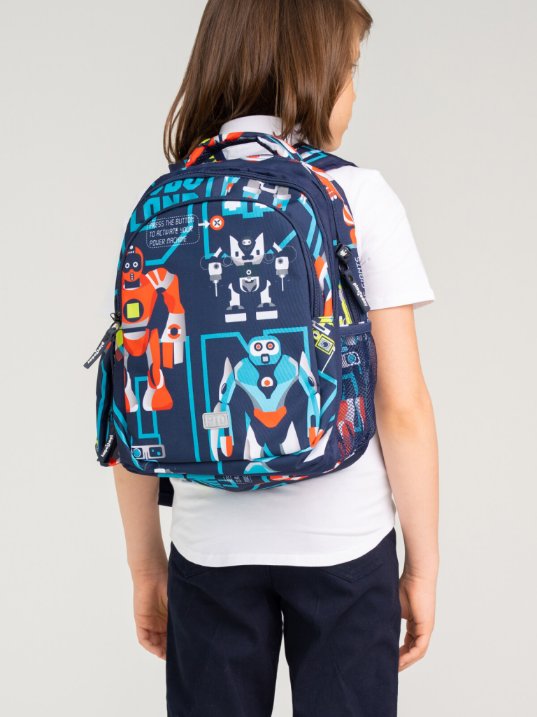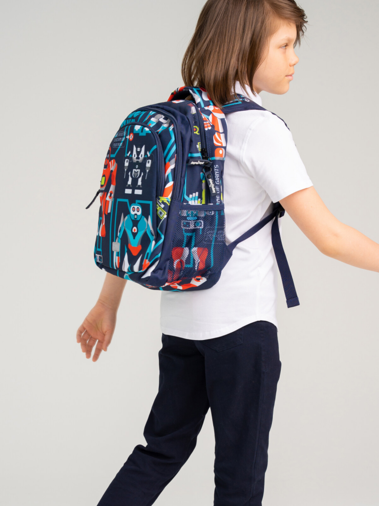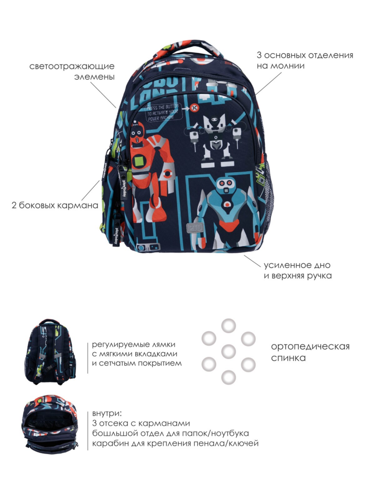Рюкзак текстильный для мальчика. 38*29*19 см. Широкие регулируемые лямки с мягкими вкладками и сетчатым покрытием. Ортопедическая спинка. 3 основных отделения на молнии. 2 боковых кармана: сетчатый и на молнии. Внутри рюкзака: 1 отсек - карман на молнии, открытые карманы для канцелярии. 2 отсек - без карманов, 3 отсек - карман для папок, карман на молнии, 2 кармана без замка, карабин для крепления пенала/ключей. Усиленная спинка, дно и верхняя ручка. Светоотражающие элементы на переднем кармане и плечевых ремнях.