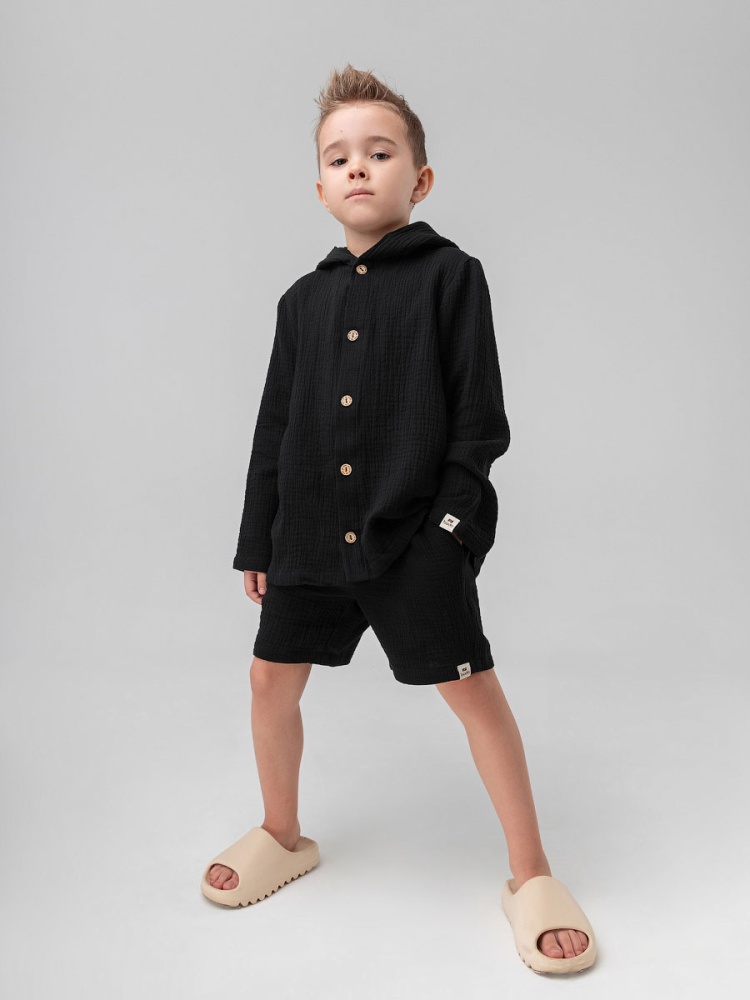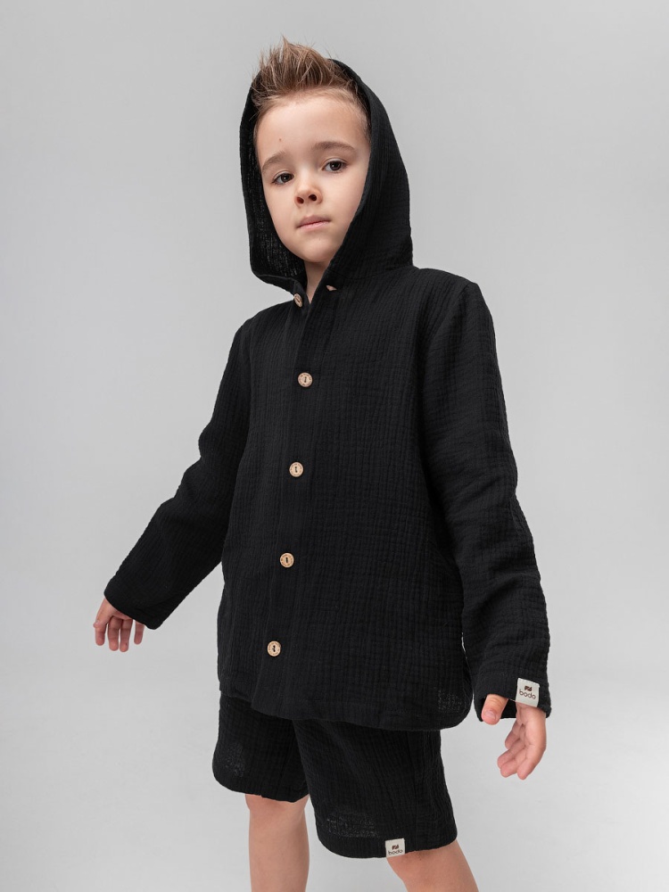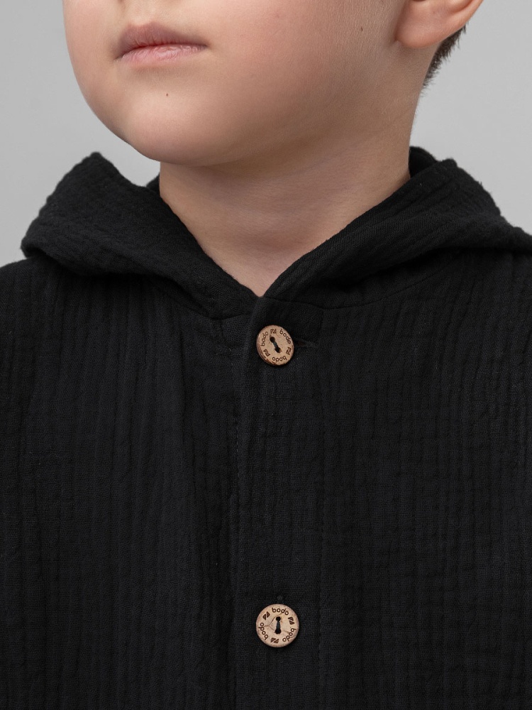 Рубашка для детей дошкольного возраста. Рубашка прямого силуэта, с центральной бортовой застёжкой на пуговицы, с втачными рукавами и капюшоном. Низ прямой. Состав: 100% хлопок