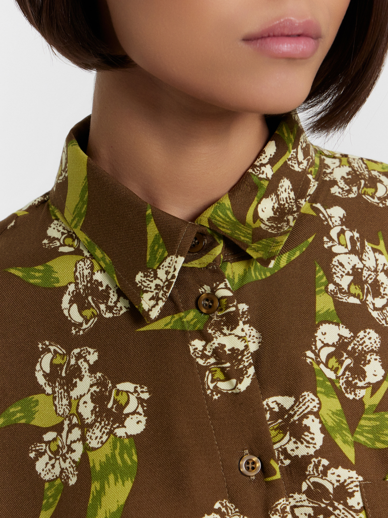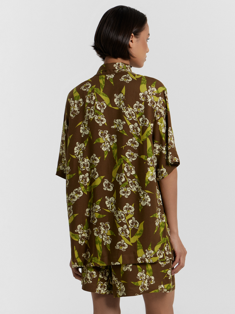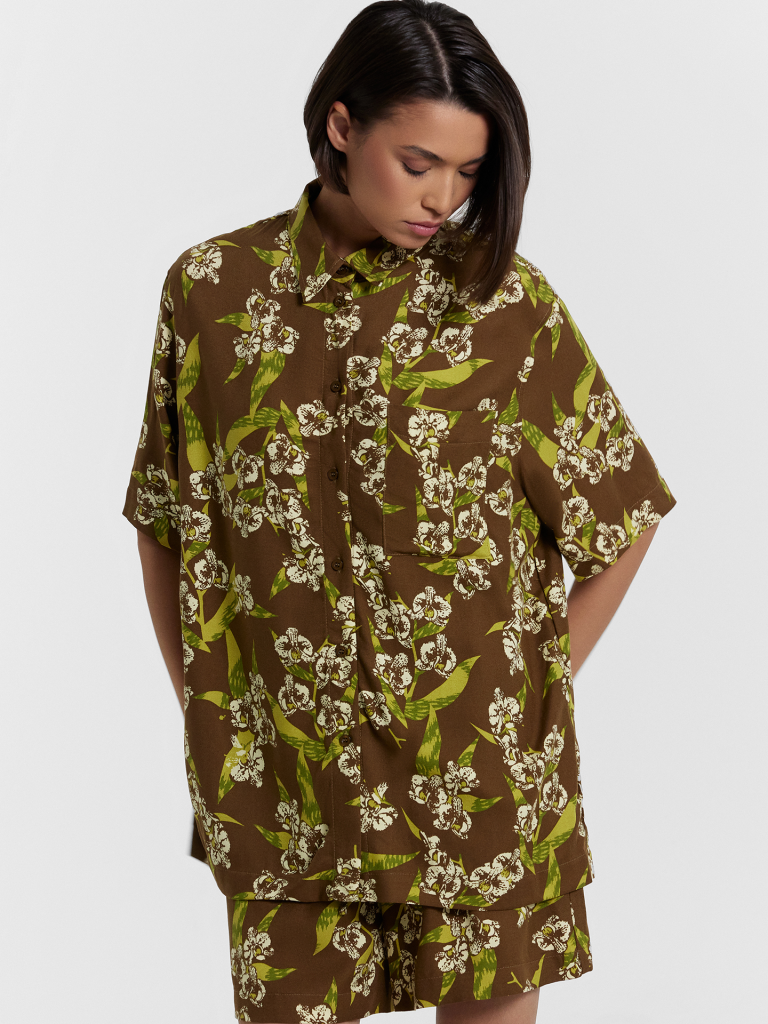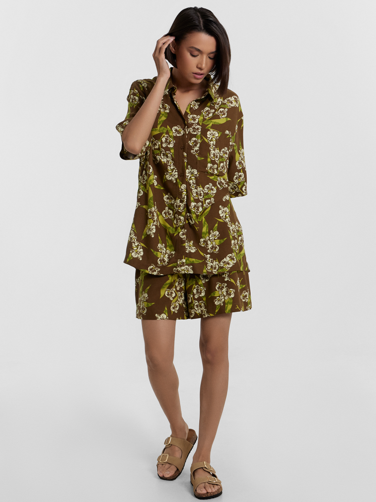 Эта женская рубашка — идеальное воплощение комфорта и стильного минимализма, созданное для расслабленных и элегантных образов. Свободный крой дарит легкость и непринужденность, позволяя чувствовать себя комфортно в течение всего дня. Модель выполнена из вискозы — натурального волокна, которое известно своей мягкостью и отличной воздухопроницаемостью. Оно приятно ощущается на коже, обеспечивая максимальный комфорт даже в жаркую погоду. Кроме того, вискоза отличается высокой прочностью и устойчивостью к износу, что делает рубашку долговечной и практичной. Классический рубашечный воротник и центральная застёжка на пуговицы подчеркивают строгую элегантность, а накладной карман слева на груди добавляет функциональности. Короткие рукава со спущенной линией плеча делают модель еще более расслабленной и удобной в движении, создавая стильный акцент. Эта рубашка станет универсальным элементом вашего гардероба, идеально сочетающимся с шортами, брюками или юбками. Завершите образ подходящими шортами из той же коллекции для создания гармоничного и легкого комплекта!