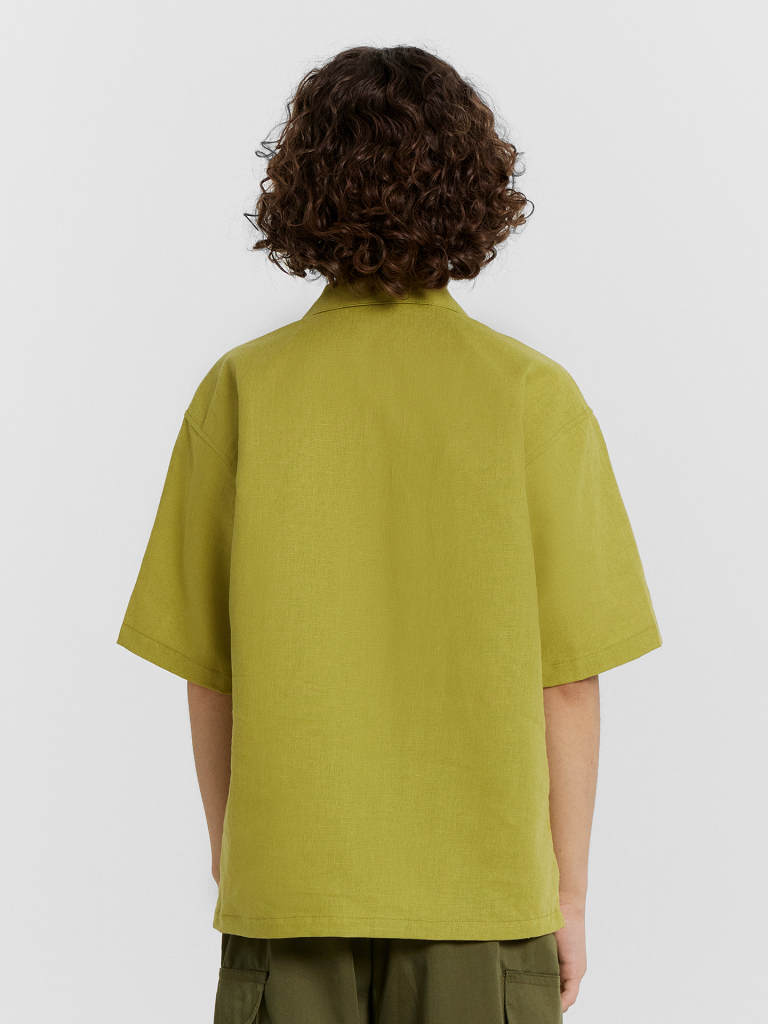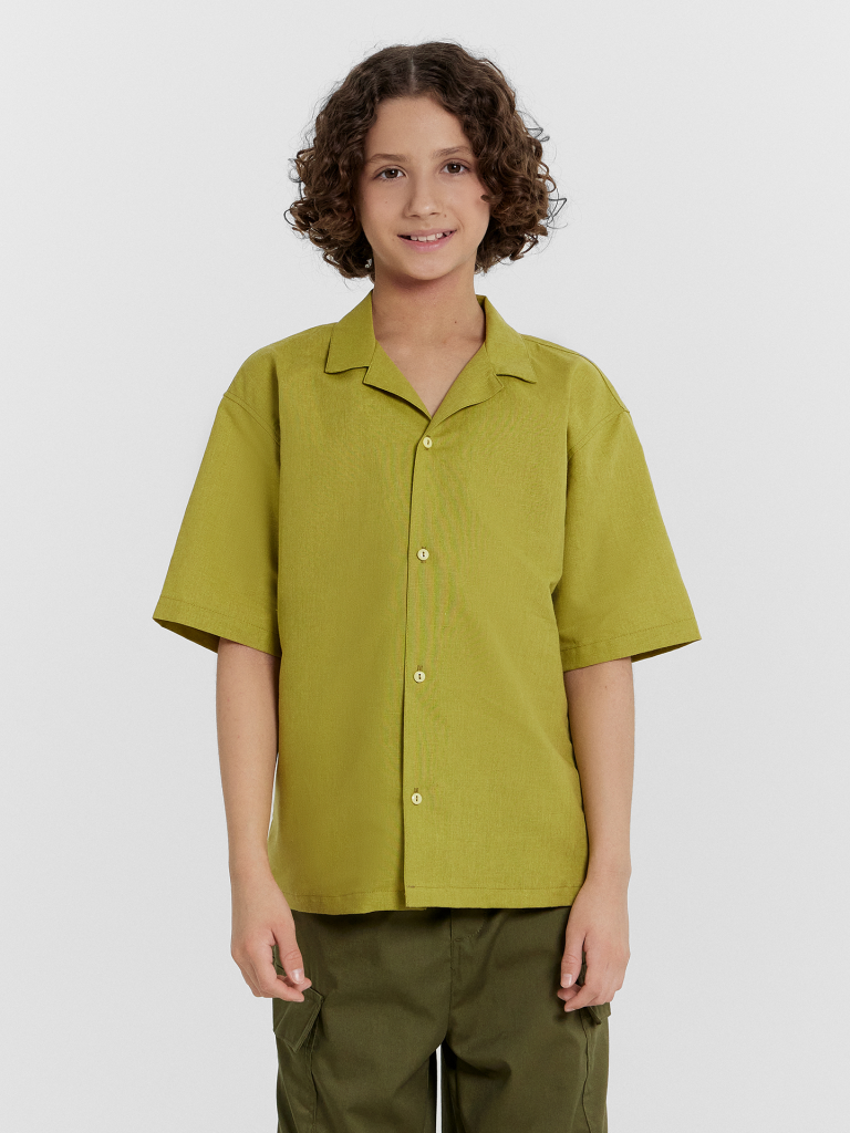 Сорочка верхняя для мальчиков прямого силуэта с воротником. По переду обработана застежка на пуговицы d=10mm и петли. Рукава короткие, втачные, слегка спущены. Нижние срезы изделия и рукавов обработаны швом в подгибку.