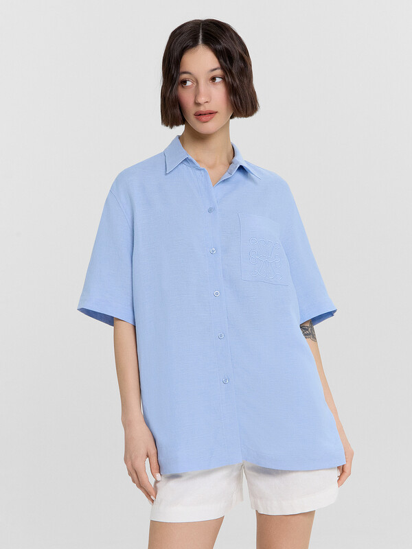 Эта женская рубашка от Mark Formelle — незаменимый элемент базового гардероба, который сочетает элегантность и комфорт. Модель прямого кроя обеспечивает свободную посадку, делая ее универсальной для любого случая. Центральная застежка на пуговицы добавляет классический акцент, а накладной карман на груди — стильную деталь. Классический отложной воротник придает образу сдержанность, а спущенное плечо и углубленная пройма создают расслабленный силуэт. Короткие рукава и прямой низ делают эту рубашку практичным выбором для теплого сезона. Материалы — лен и вискоза — обеспечивают натуральность, воздухопроницаемость и мягкость. Такая модель идеально подойдет для повседневных образов, офисного стиля или неформальных встреч, добавляя нотку естественной элегантности в любой наряд. Совершенный баланс комфорта и стильного минимализма!