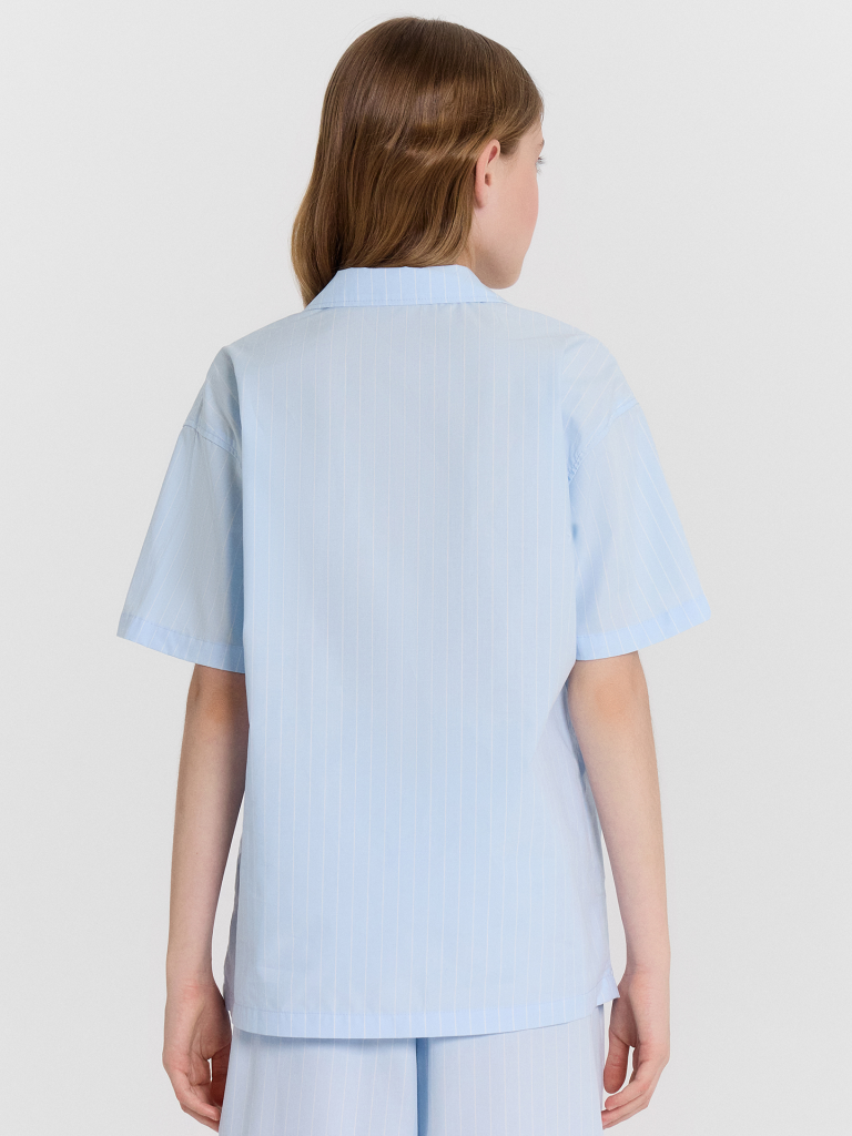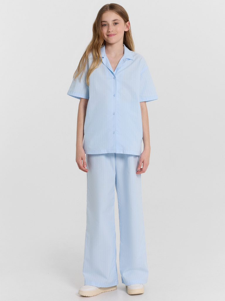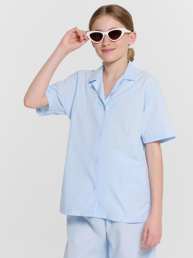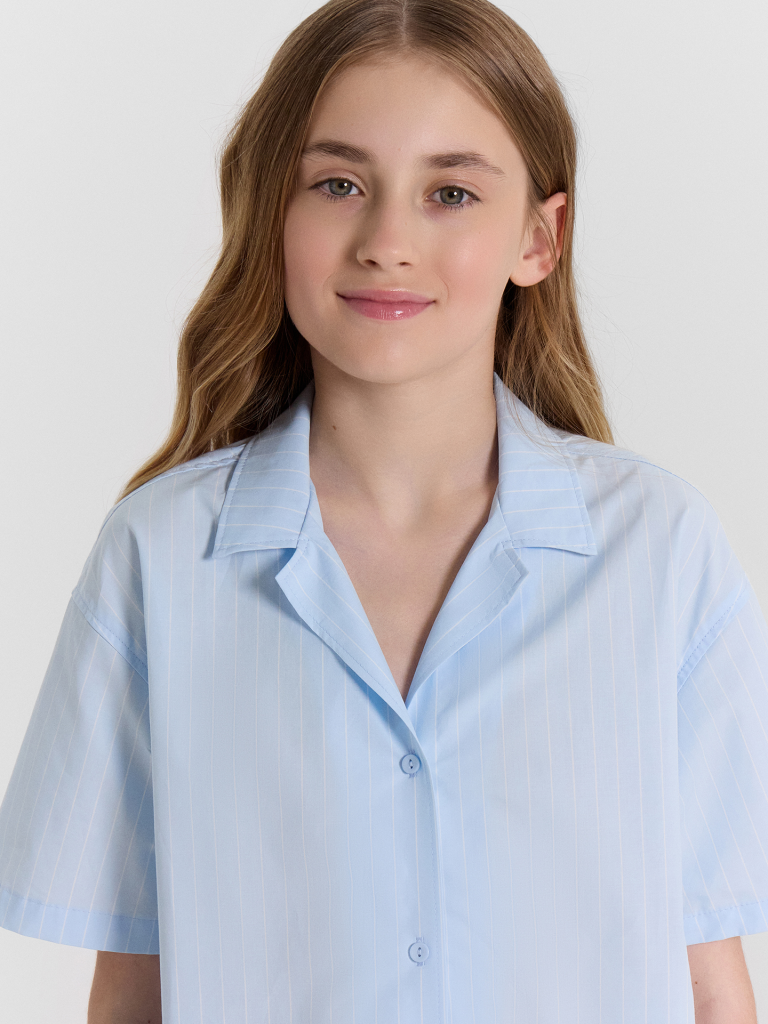 Блузка для девочек. свободного силуэта из ткани. По переду обработана застежка на пуговицы d=10mm и петли. Рукава короткие, втачные, слегка спущены. Нижние срезы изделия и рукавов обработаны швом в подгибку.