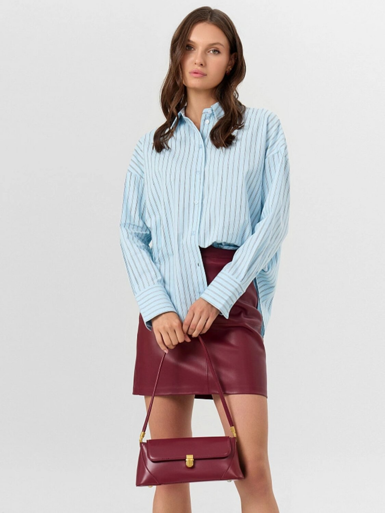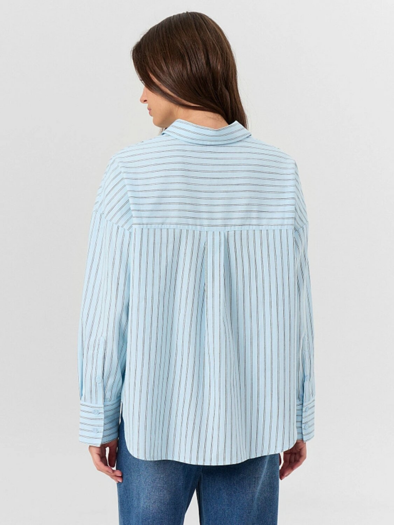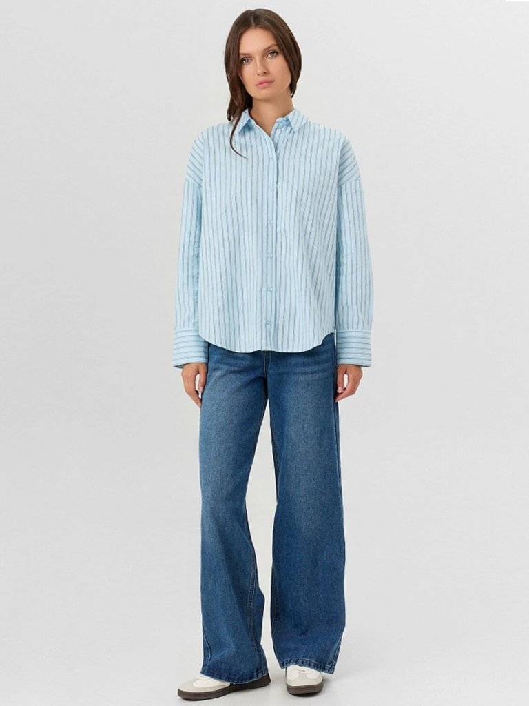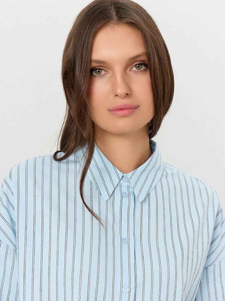 Свободный крой не сковывает движений, а тонкие вертикальные полосы визуально вытягивают силуэт, добавляя образу легкости. Женская рубашка голубого цвета легко сочетается с классическими брюками, джинсами или юбкой, делая её идеальным вариантом для офиса, прогулок или встреч с друзьями. Круглая горловина плавно переходит в отложной воротник, создавая гармоничный и утончённый силуэт.