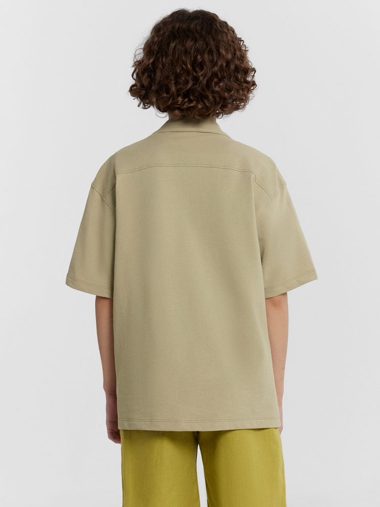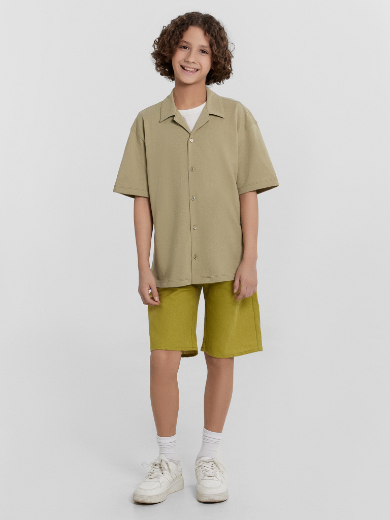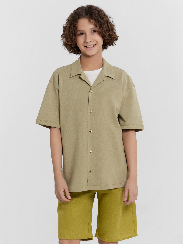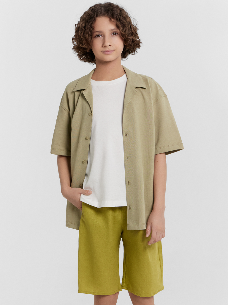 Сорочка верхняя для мальчиков прямого силуэта с воротником. По переду обработана застежка на пуговицы и петли. Диаметр пуговицы 1 см, 4 прокола. Рукава короткие, втачные, слегка спущены. На спине кокетка. Нижние срезы изделия и рукавов обработаны швом в подгибку.