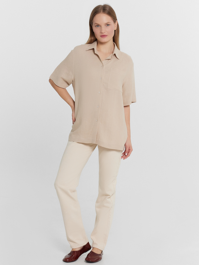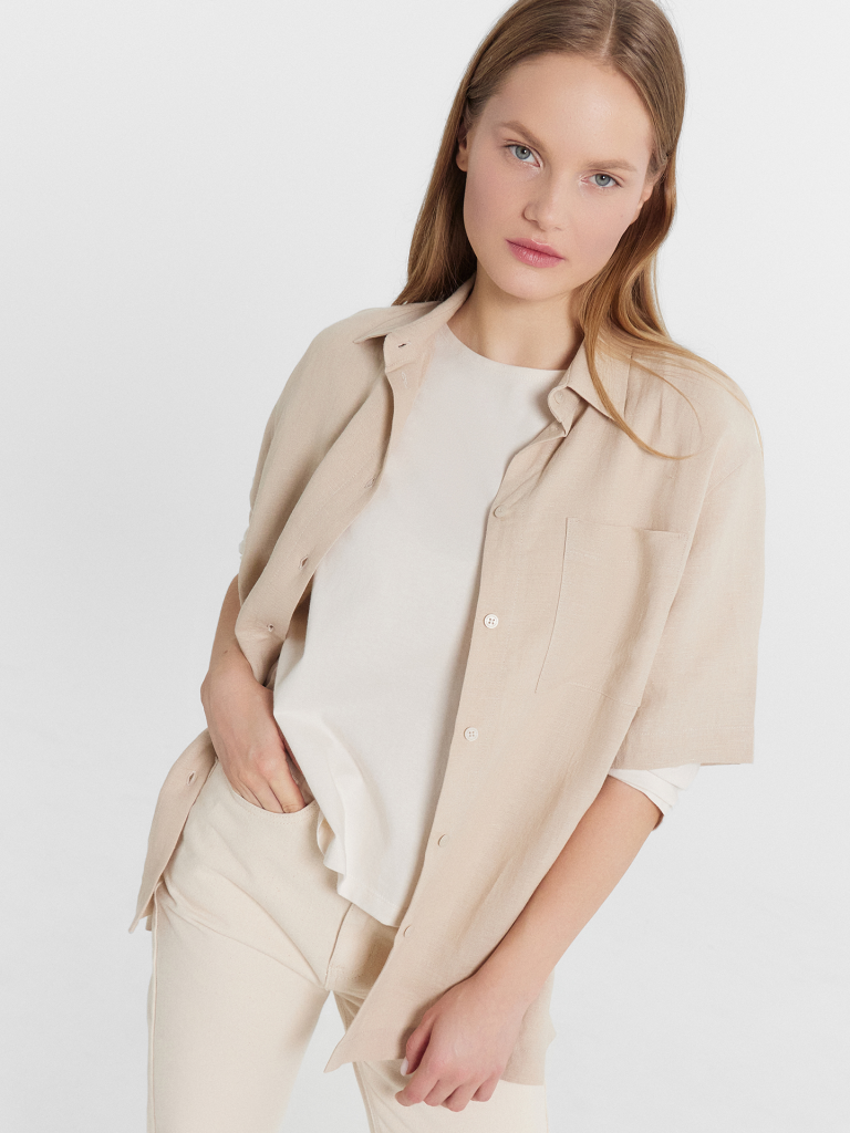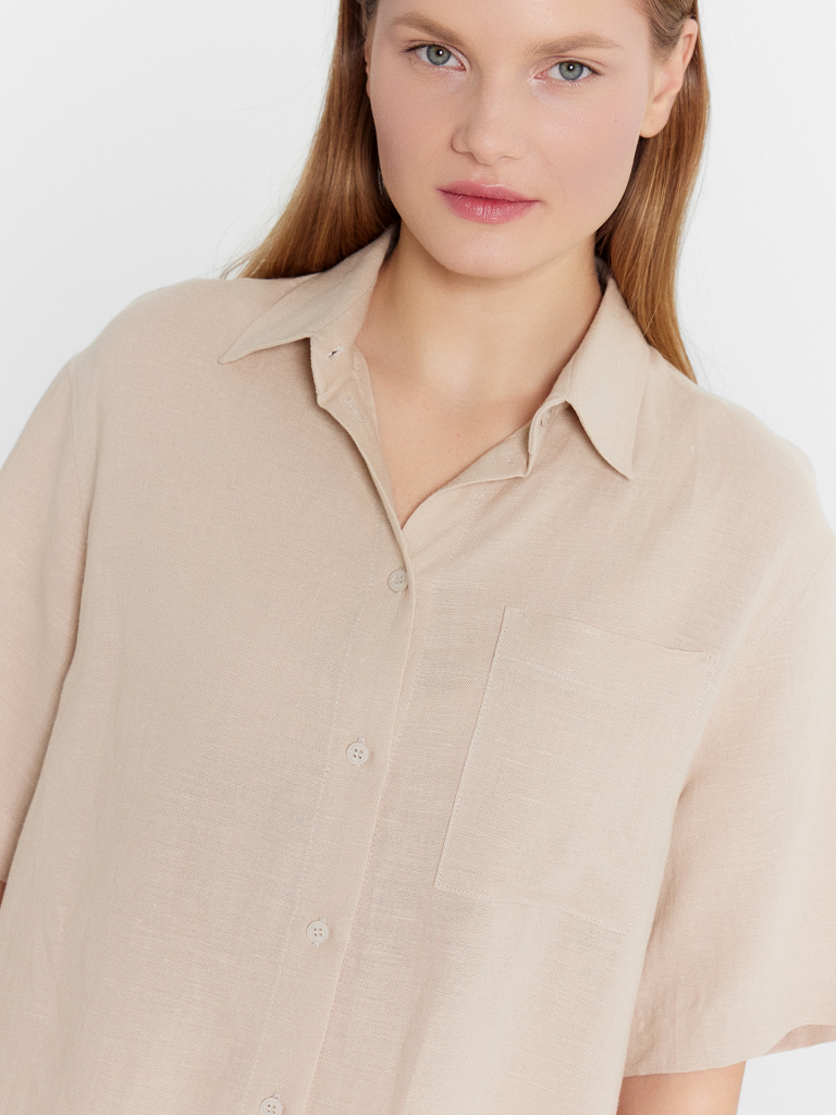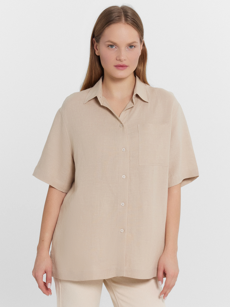 Женская рубашка свободного силуэта выполнена из нежного сочетания вискозы и натурального льна, что придает ей особые преимущества. Вискоза обеспечивает мягкость и приятное ощущение на коже, а также обладает отличной воздухопроницаемостью, что помогает поддерживать комфортную температуру тела. Натуральный лён, в свою очередь, добавляет прочности и долговечности изделию, а также обладает гипоаллергенными свойствами. Модель оснащена застежкой на пуговицы и накладным карманом слева на груди. Короткие рукава со спущенной линией плеча и свободный крой придают этой рубашке стильный и современный вид, делая её отличным выбором для повседневного гардероба.