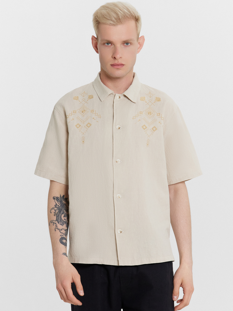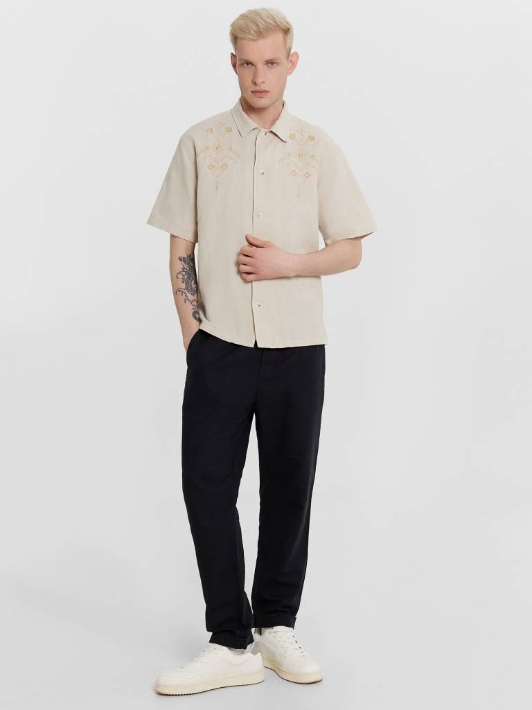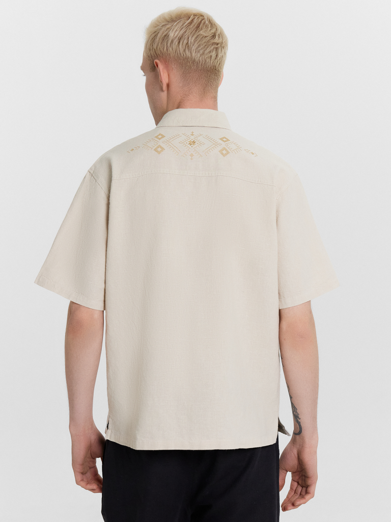 Мужская рубашка из льняной коллекции Mark Formelle — стильное и универсальное решение для тех, кто ценит комфорт и классический дизайн. Прямой, свободный силуэт обеспечивает удобную посадку и свободу движений, делая модель идеальным выбором для повседневной носки и непринужденных образов. Короткие рукава позволяют чувствовать себя комфортно в теплую погоду, а центральная застежка на петли и пуговицы добавляет практичности и элегантности в общий дизайн. Функциональный накладной карман на груди — удобный акцент, который делает рубашку еще более практичной. Спинка с кокеткой подчеркивает аккуратный крой, обеспечивая дополнительный комфорт и улучшенную посадку по фигуре. Разрезы по низу боковых швов придают модели легкость, а обработка нижних срезов и рукавов швом вподгибку делает изделие аккуратным и долговечным. Рубашка выполнена из натуральных материалов — сочетание льна и хлопка дарит приятные тактильные ощущения, обеспечивает отличную воздухопроницаемость и комфорт в течение всего дня. Идеальный вариант для тех, кто ищет сочетание практичности, стиля и качества в мужском гардеробе!