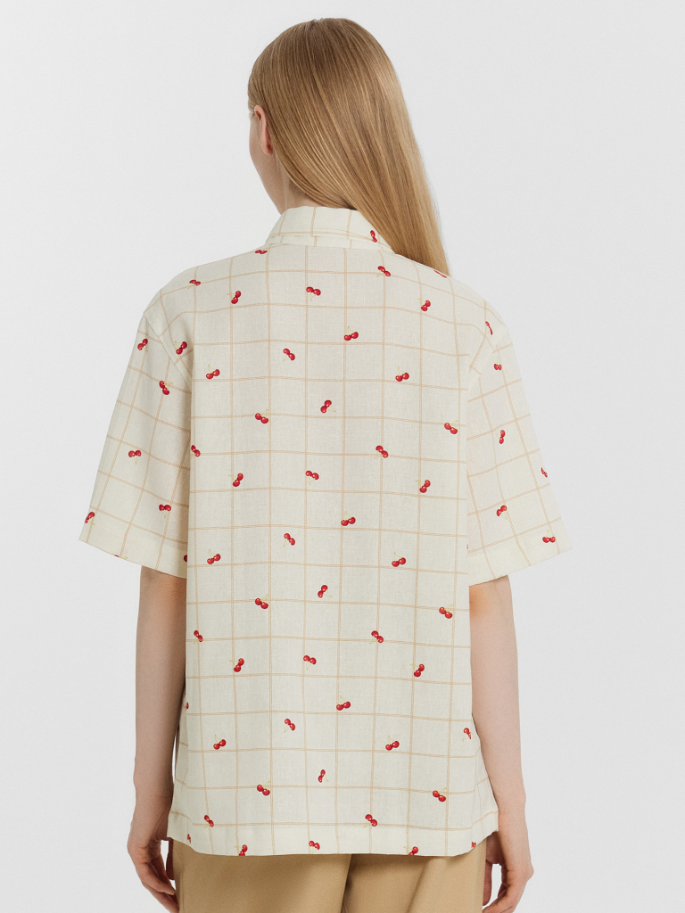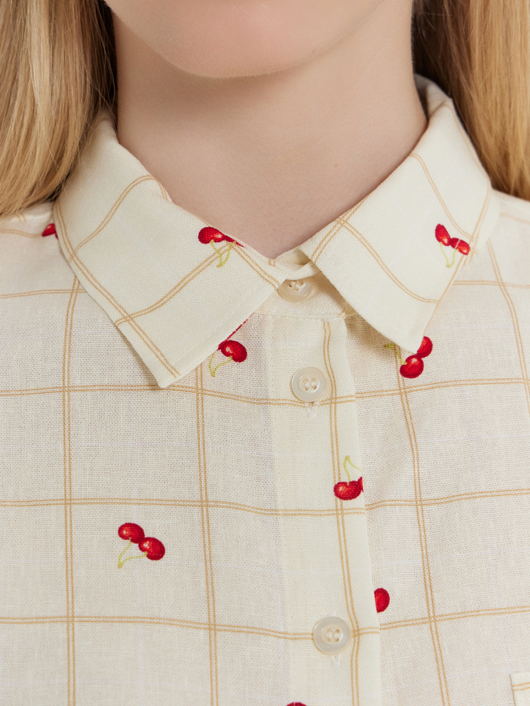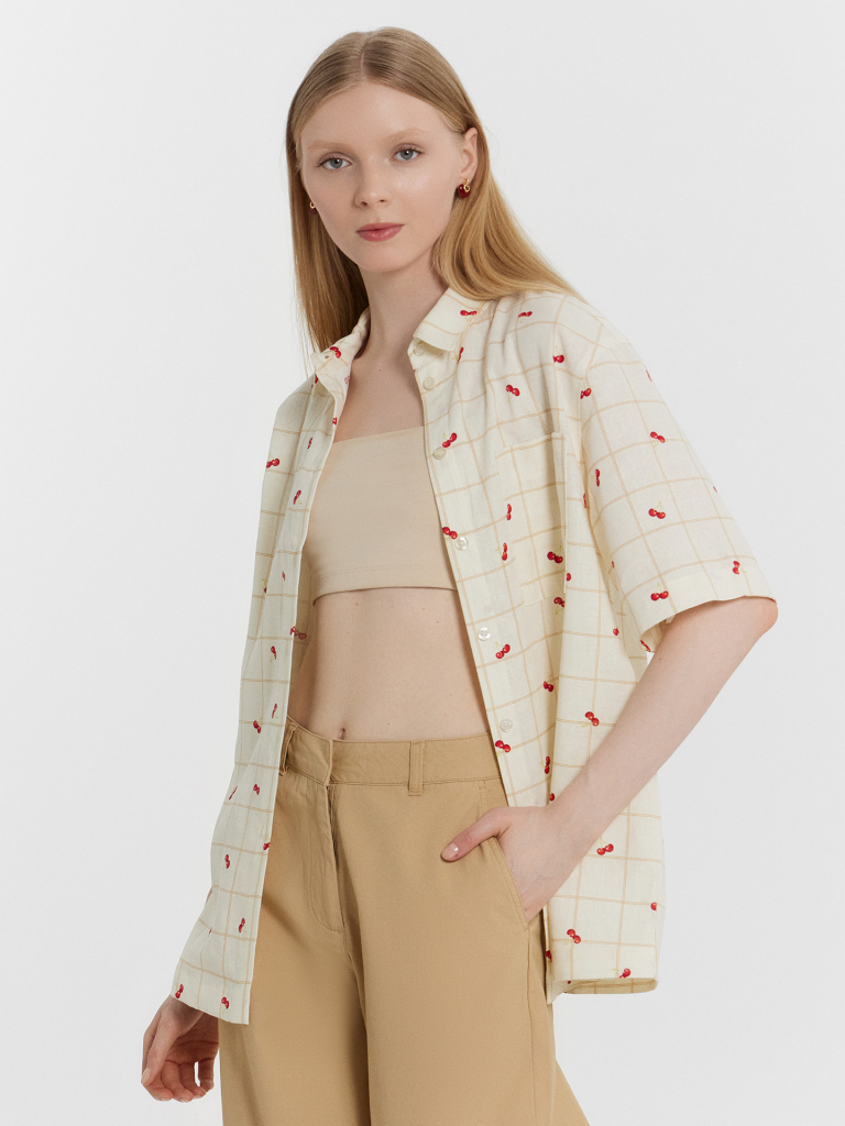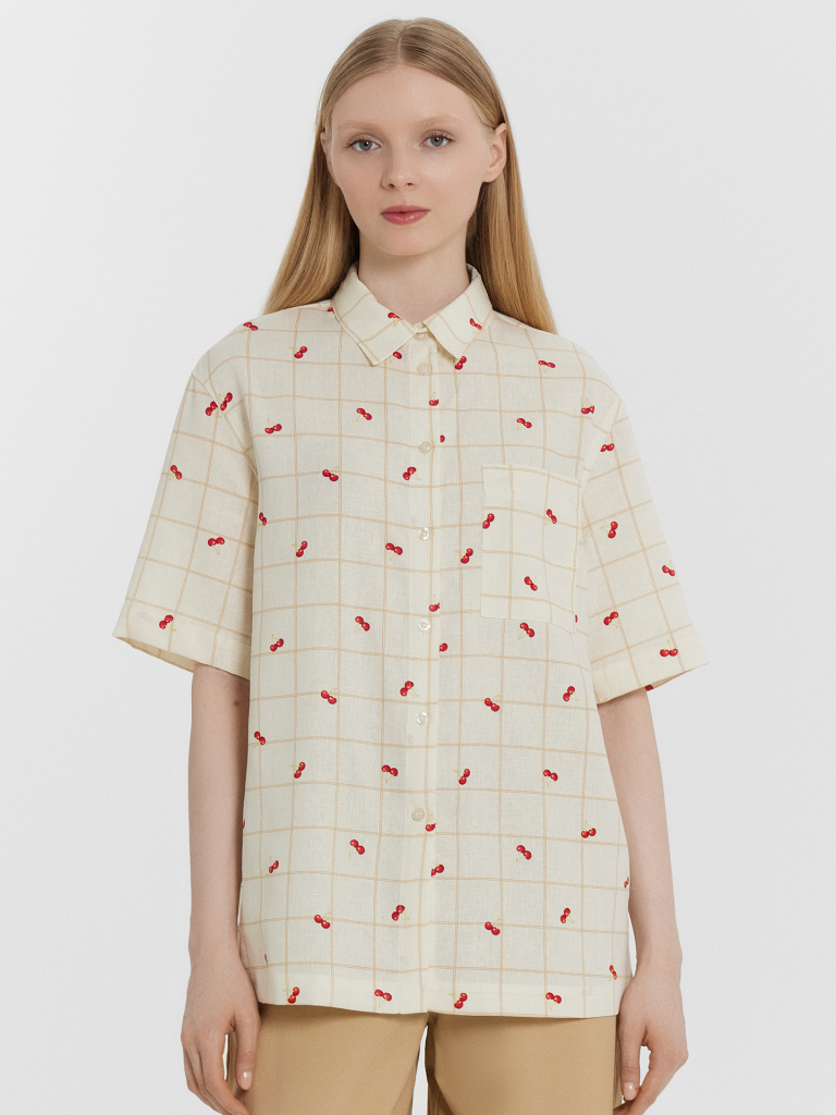 Блузка женская свободного силуэта из ткани. Блузка с цельнокроеной планкой и центральной застежкой на пуговицы. На левой детали переда накладной карман. Горловина круглой формы с рубашечным воротником. Плечо спущено, пройма углублена. Рукав втачной, короткий. Низ рубашки прямой.