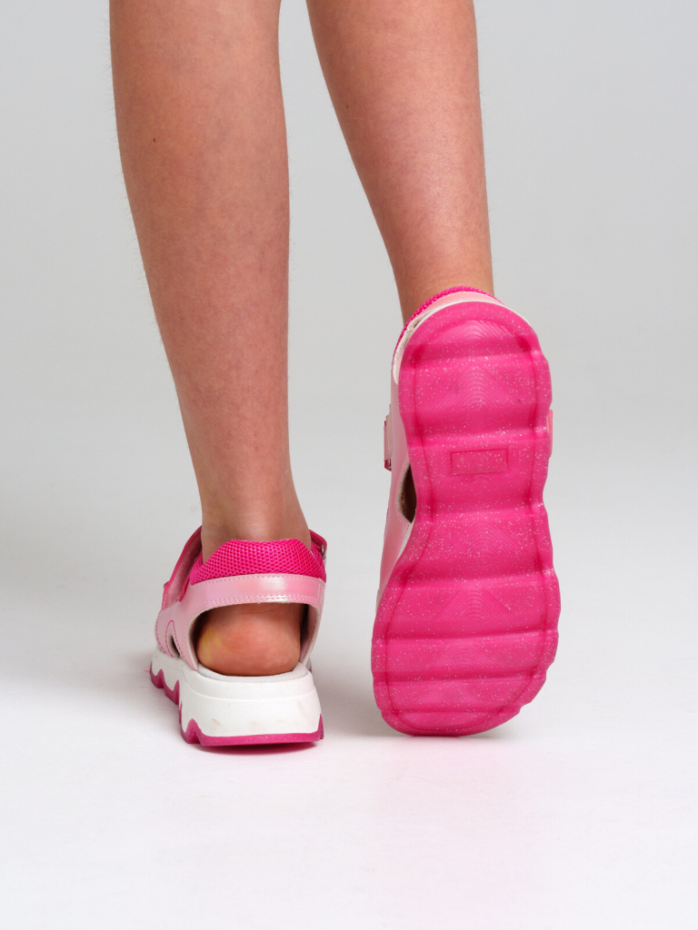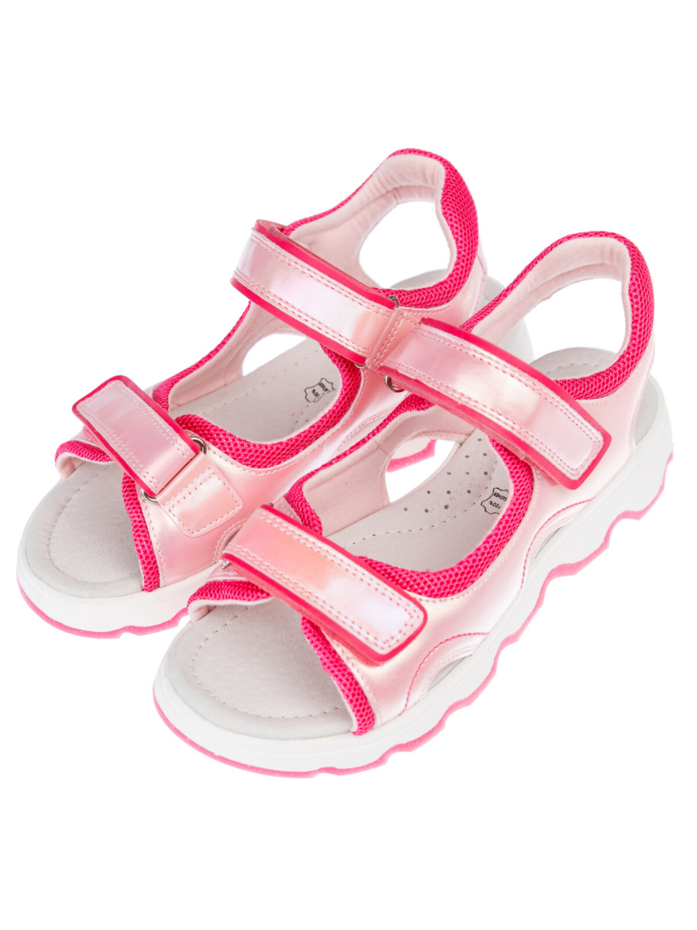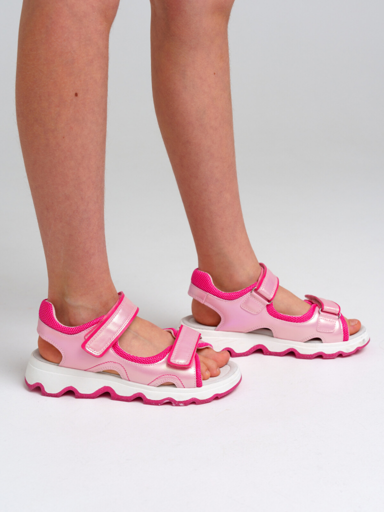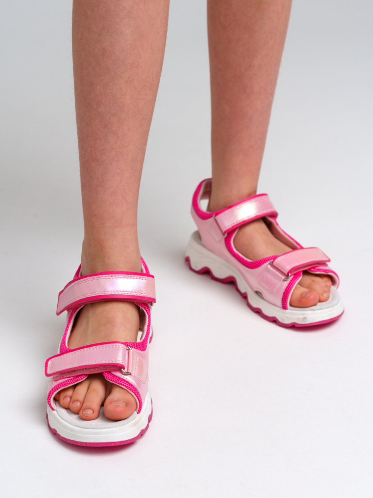 Сандалии из перламутровой искусственной кожи. Удобные ремни с липучками позволяют регулировать объем. Подкладка выполнена из текстиля с высоким содержанием хлопка. Стелька выполнены из натуральной кожи и имеет анатомический элемент для поддержания свода стопы. Наличие мягкого канта сзади создает дополнительный комфорт в носке. Подошва из терморезины очень гибкая, легкая и не скользит.