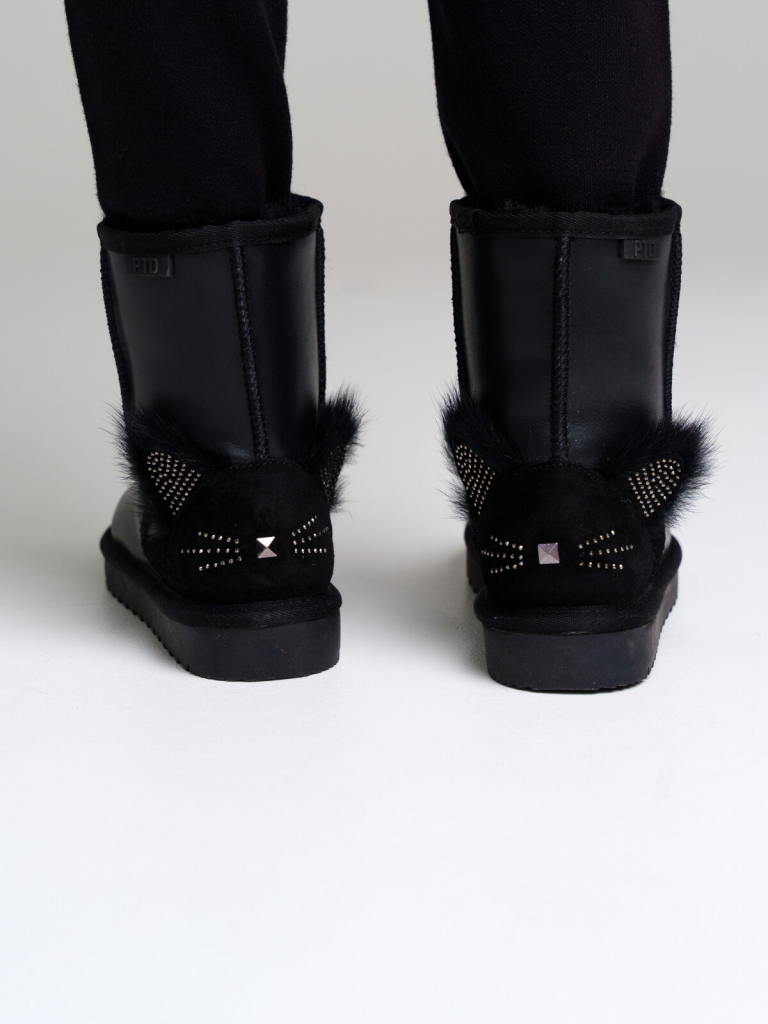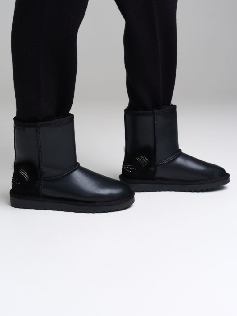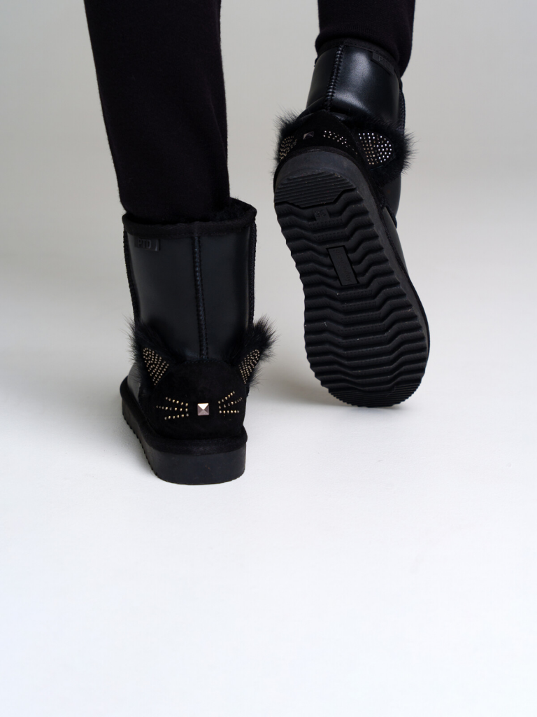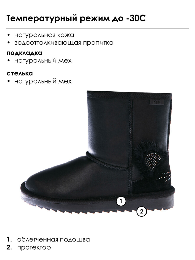 Верх выполнен из натуральной кожи с покрытием - защита от влаги. Подкладка и стелька из 100% натурального меха увеличенной плотности. Облегченная подошва с противоскользящим протектором. Удобная форма колодки. Температурный режим от 0°С до - 30°С.