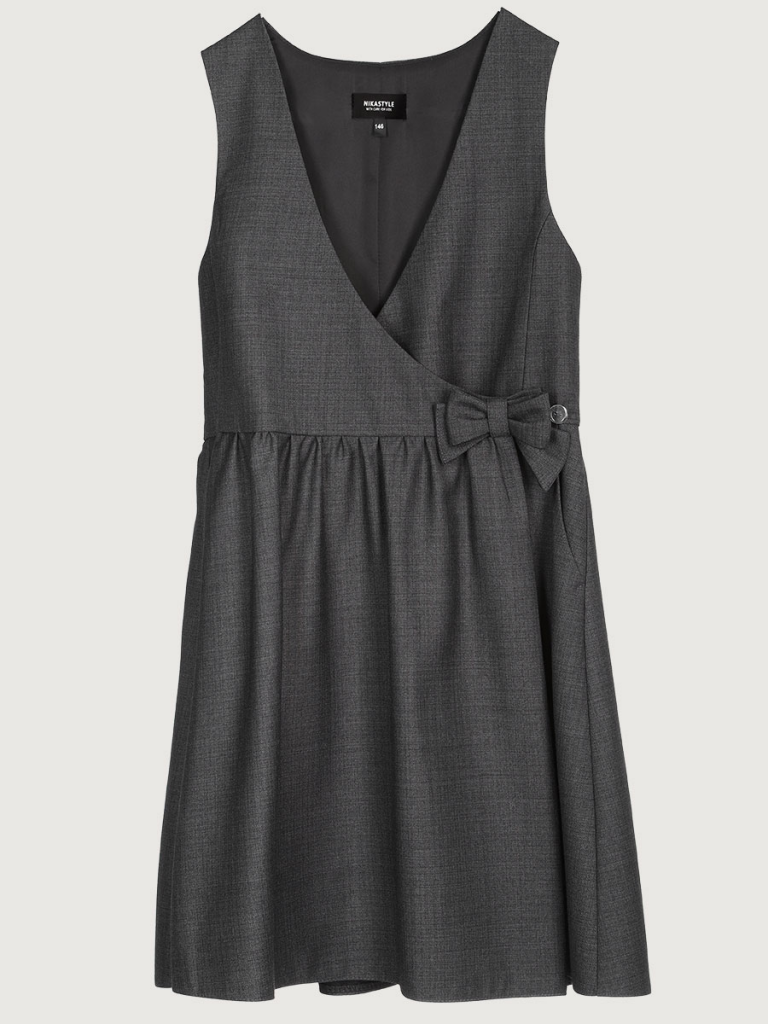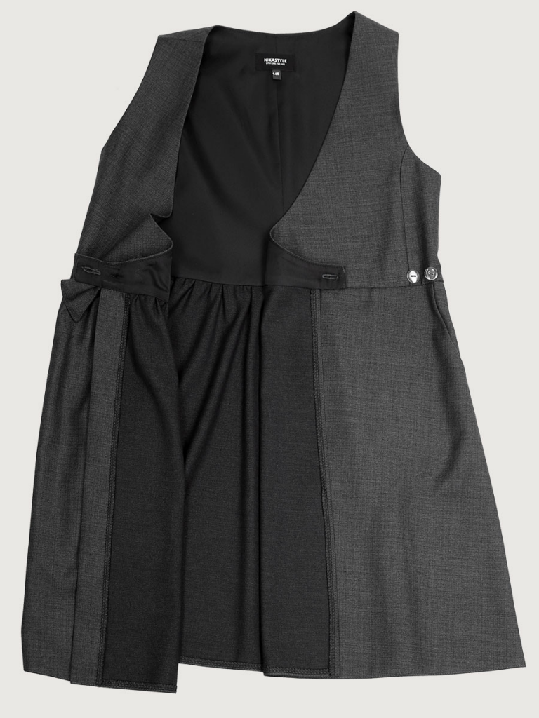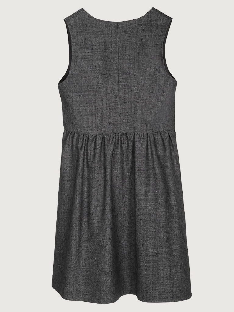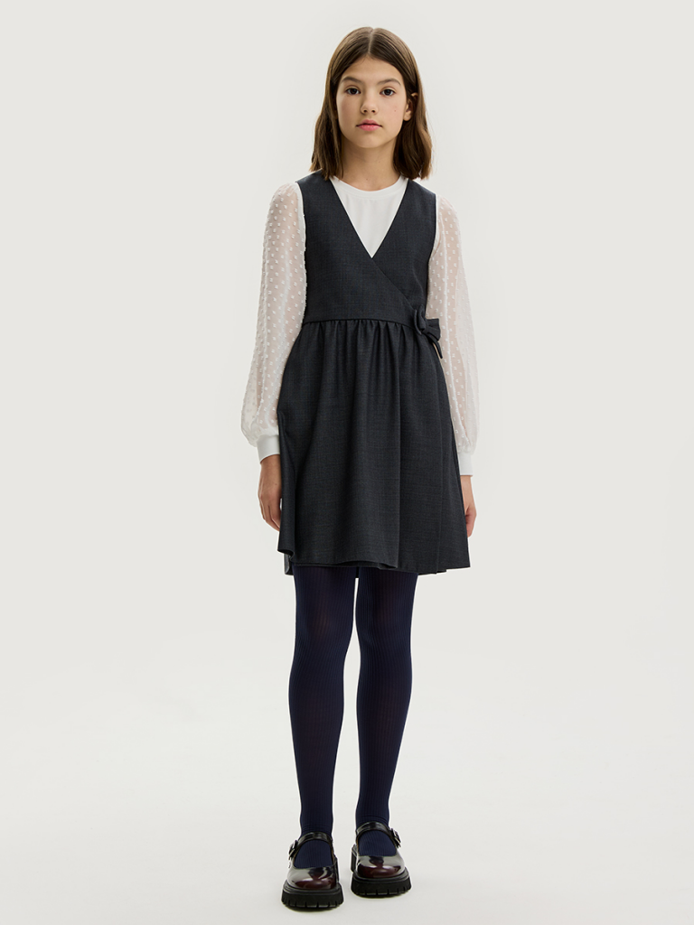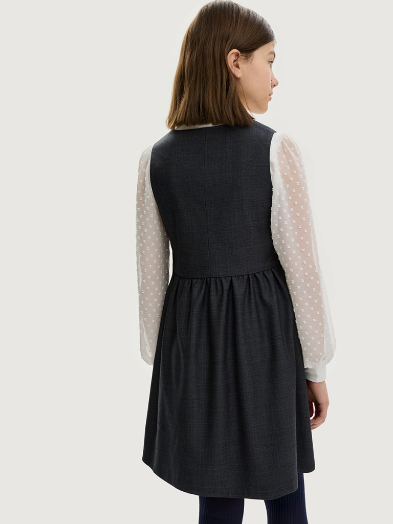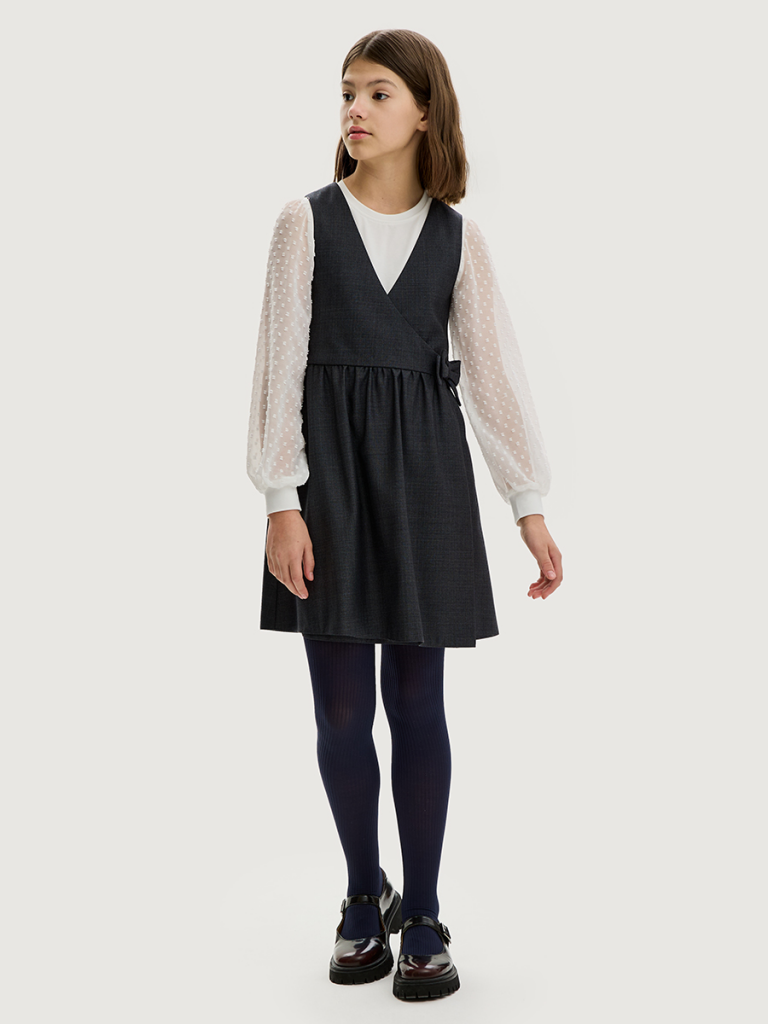 Школьный сарафан для девочки прилегающего силуэта с регулировкой объема по талии на дополнительную пуговицу. Выполнен из прочной, качественной костюмной ткани с содержанием вискозы, обеспечивает комфорт на весь день. Передняя половинка с широким регулируемым запахом. Вырез лифа V-образный глубокий. Линия талии немного завышена. Юбка отрезная на мелкой сборочке.