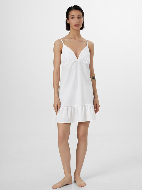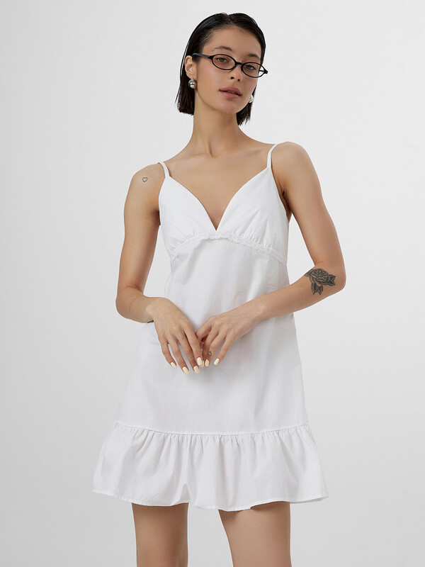 Сарафан женский А-силуэта, укорочённый, с отрезными чашками. Под грудью кружевная тесьма Antik Dantel 8844 (18% EL, 82% PA, 2,7см). Чашки с подкладкой из кулирного полотна. Бретели 9мм с регуляторами 10мм. Верхний срез спинки обработан в подгибку с резиной 8RV. Низ обработан отрезной рюшей. Рюша обработана швом в подгибку.
