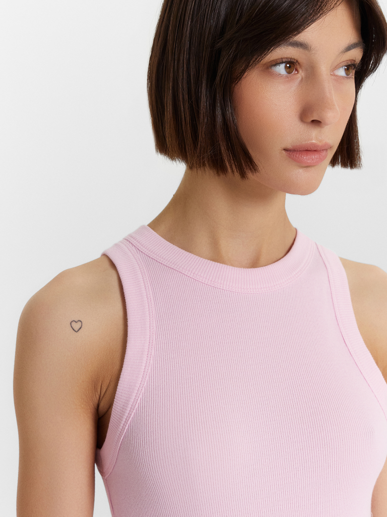 Горловина круглой формы, срезы горловины и проймы окантованы бейками из рибаны.