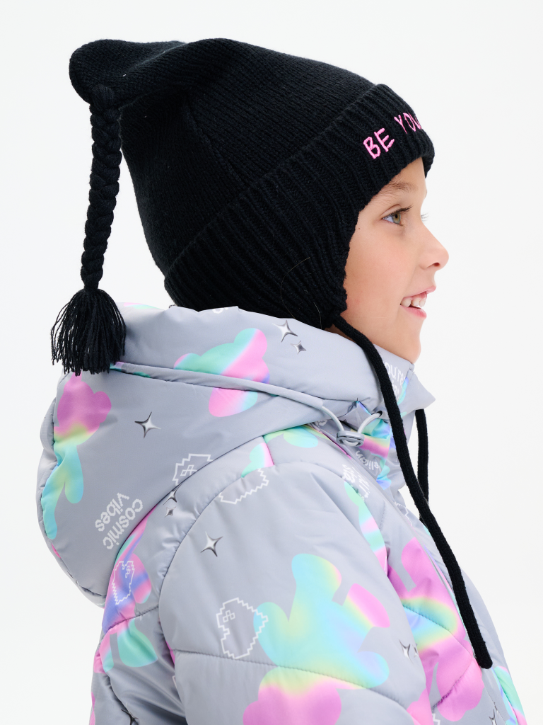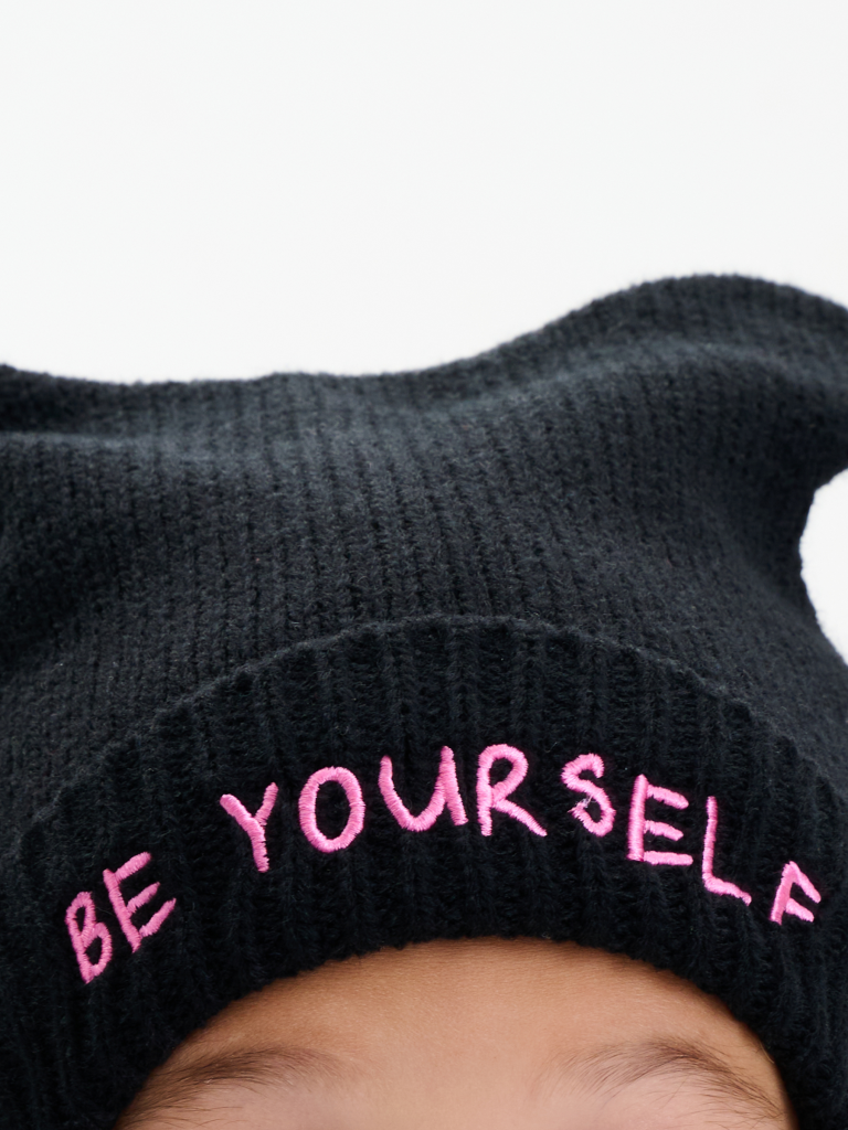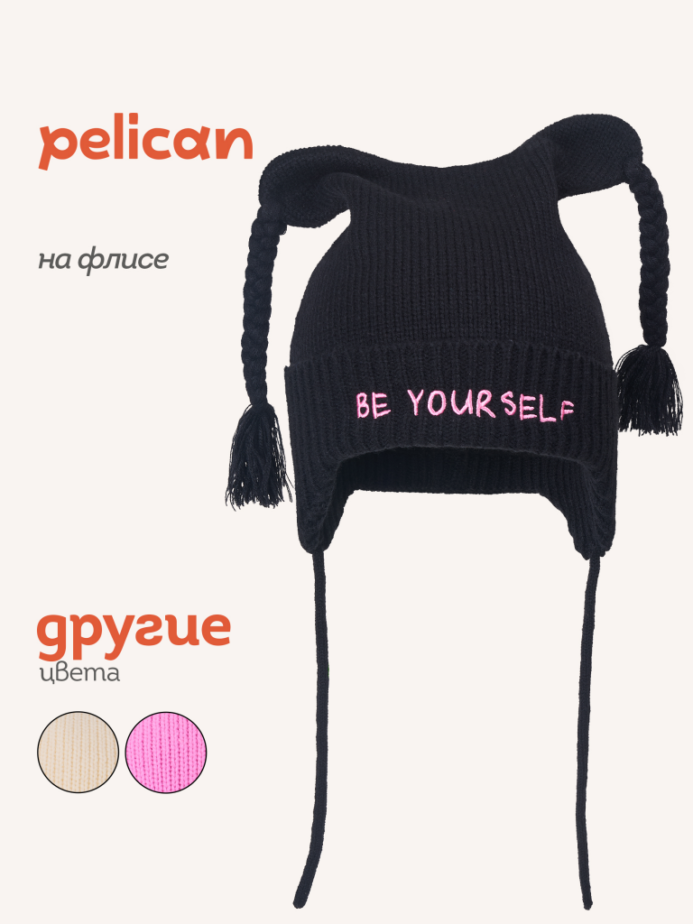 Тёплая и мягкая шапка с завязками на уютном флисовом подкладе — отличный выбор для прохладной погоды. Верхняя часть украшена забавными свисающими ушками с милыми косичками, которые придают модели игривый и неповторимый стиль. Шапка связана плотной, эластичной вязкой с аккуратным отворотом и цельновязанными ушками по низу. Модель отлично закрывает уши и шею, надёжно защищая от ветра и холода. Мягкие завязки обеспечивают комфортную и надежную фиксацию на голове. Особенный акцент — вышивка на отвороте с вдохновляющей надписью «Будь самим собой», которая придаёт образу индивидуальность и настроение.