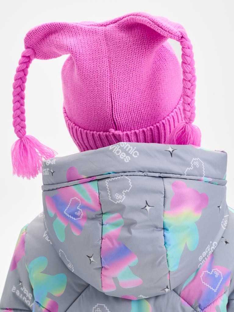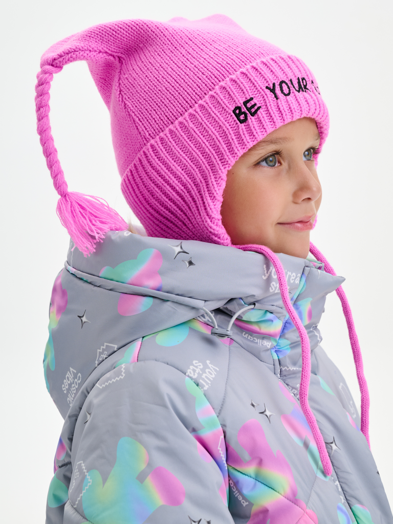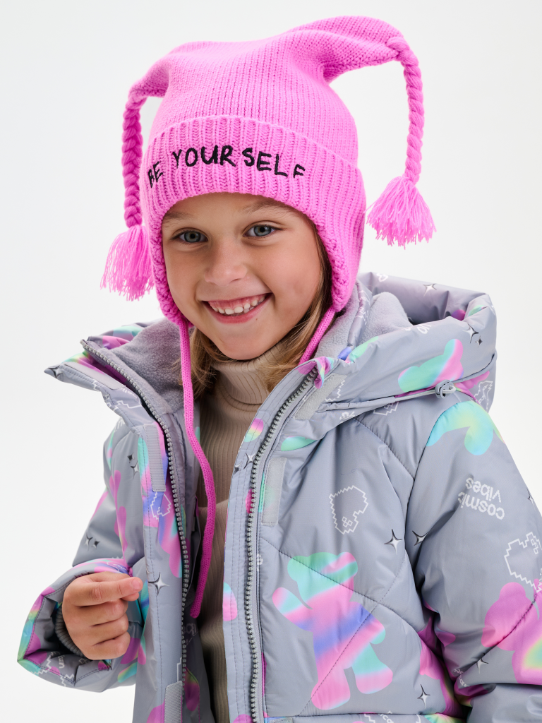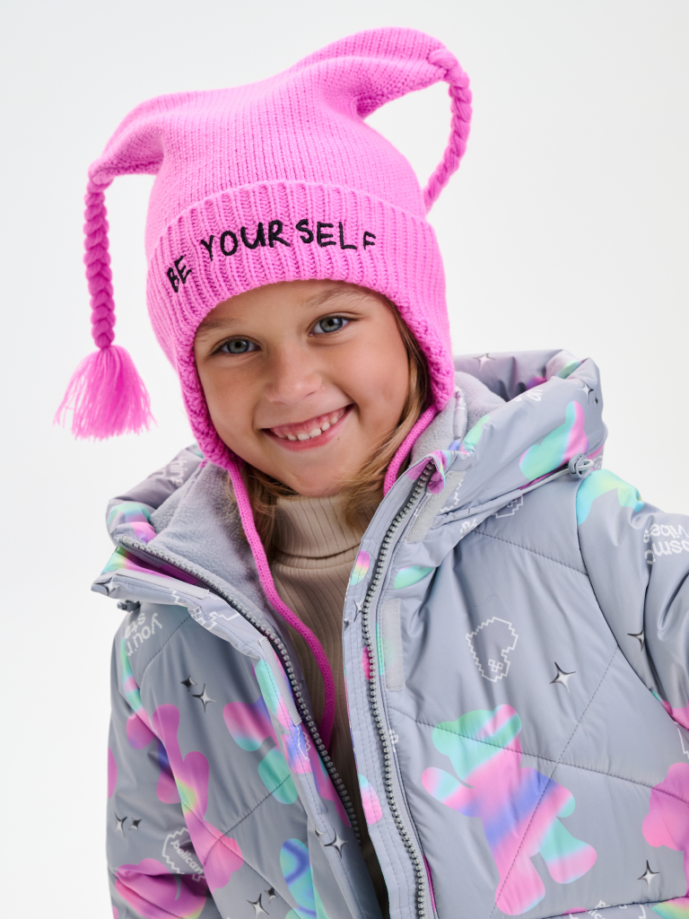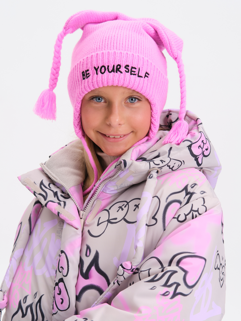 Тёплая и мягкая шапка с завязками на уютном флисовом подкладе — отличный выбор для прохладной погоды. Верхняя часть украшена забавными свисающими ушками с милыми косичками, которые придают модели игривый и неповторимый стиль. Шапка связана плотной, эластичной вязкой с аккуратным отворотом и цельновязанными ушками по низу. Модель отлично закрывает уши и шею, надёжно защищая от ветра и холода. Мягкие завязки обеспечивают комфортную и надежную фиксацию на голове. Особенный акцент — вышивка на отвороте с вдохновляющей надписью «Будь самим собой», которая придаёт образу индивидуальность и настроение.