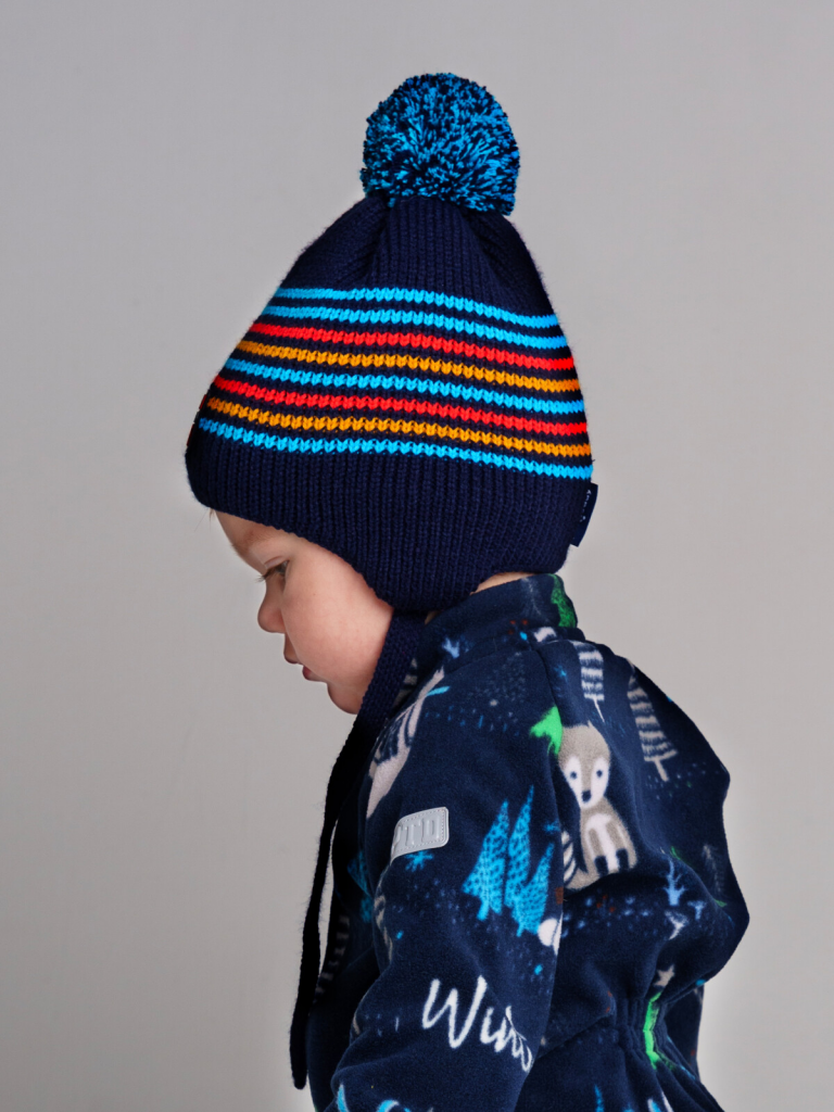 Шапка с завязками из трикотажа плотной вязки. Пряжа из акрила: легкая, теплая, гипоаллергенная. Шапка утеплена синтепоном. Подкладка из мягкого трикотажа с высоким содержанием хлопка 95%.
