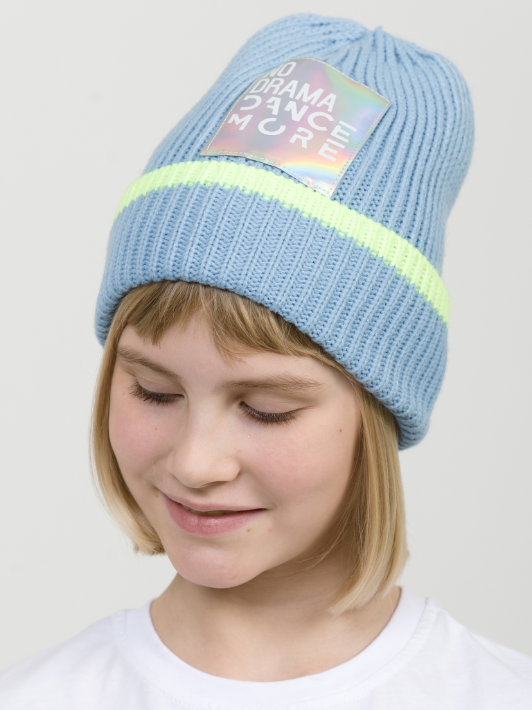 Мягкая одинарная шапка вязкой 1х1. Декор голограммная нашивка с текстом. Перевод Не драматизируй, а больше танцуй. Шапка слегка вытянута вверх, конической формы.
