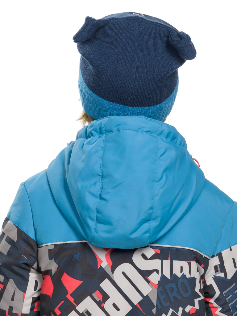 Шапка для мальчиков. Двойная вязка, без отворота. Оригинальная шапка с ушами и аппликацией в форме маски.