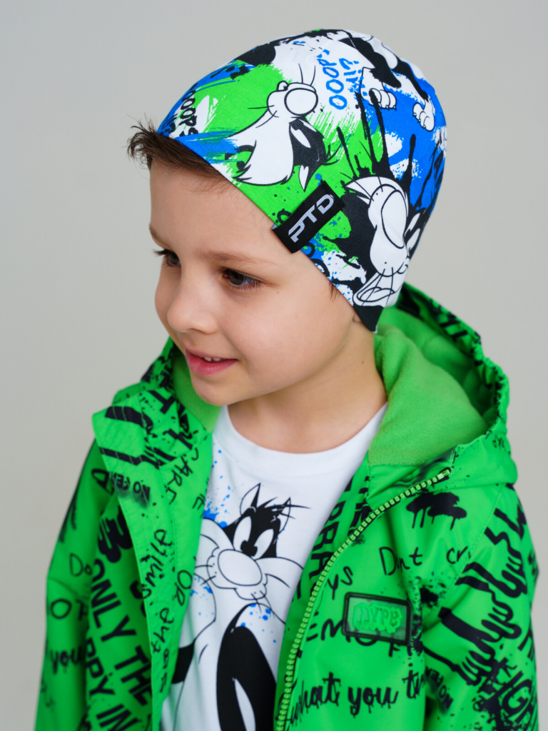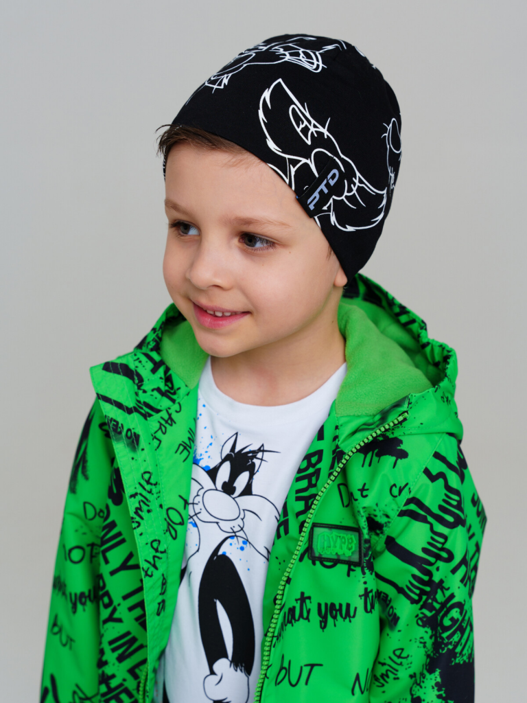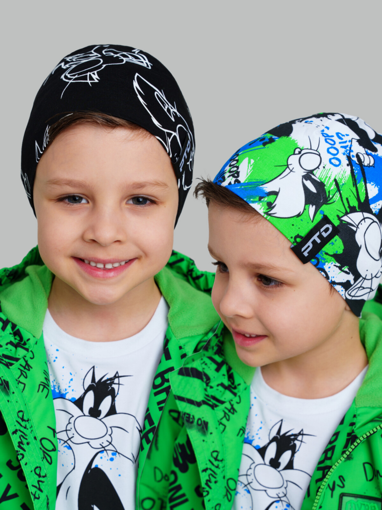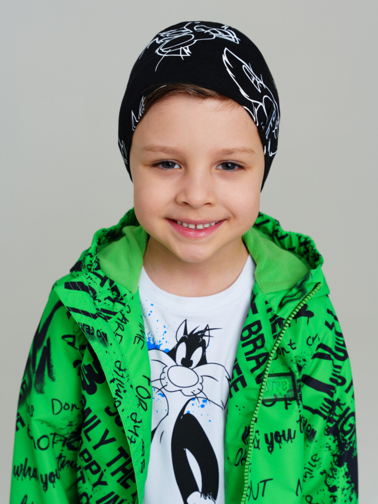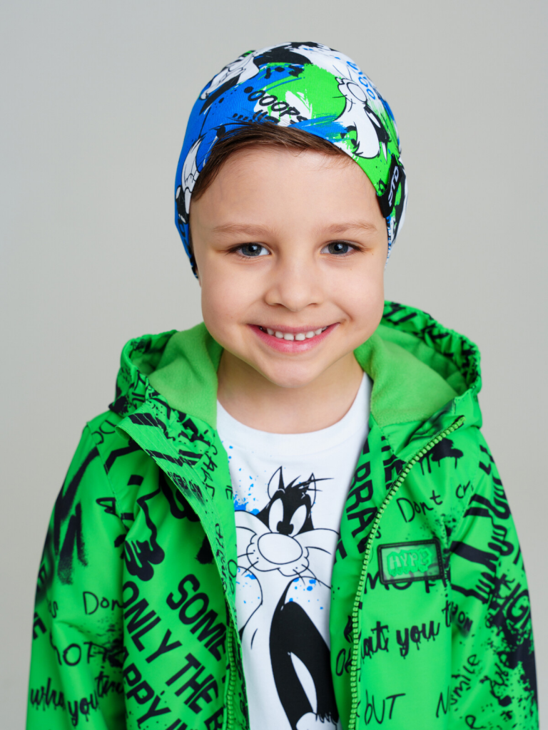 Детская шапка из качественного и приятного на ощупь трикотажа джерси. Модель с высоким содержанием хлопка 95%. Благодаря наличию эластана в составе ткани изделие проще в уходе и держит форму.