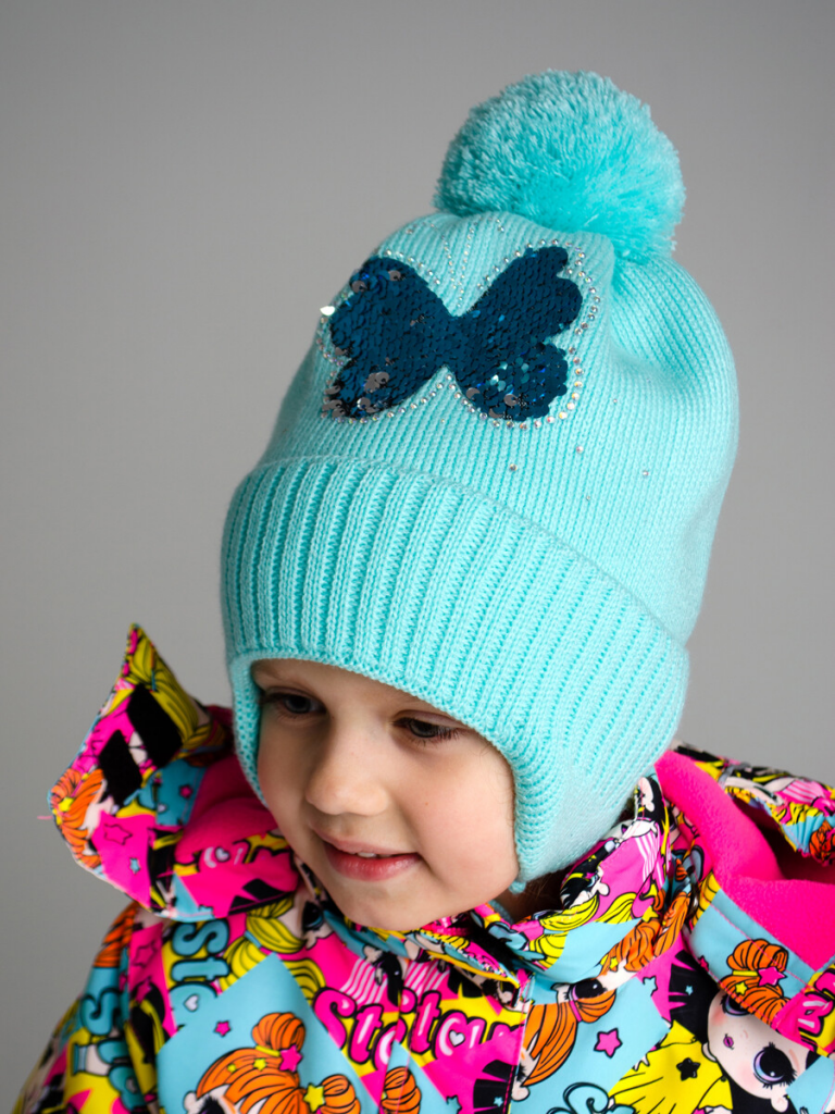 Шапка с отворотом из вязаного трикотажа. Пряжа из акрила: легкая, теплая, гипоаллергенная. Утеплена синтепоном. Подкладка из мягкого трикотажа с высоким содержанием хлопка. Завязки можно использовать при необходимости.