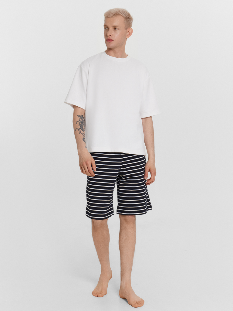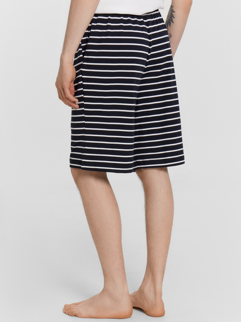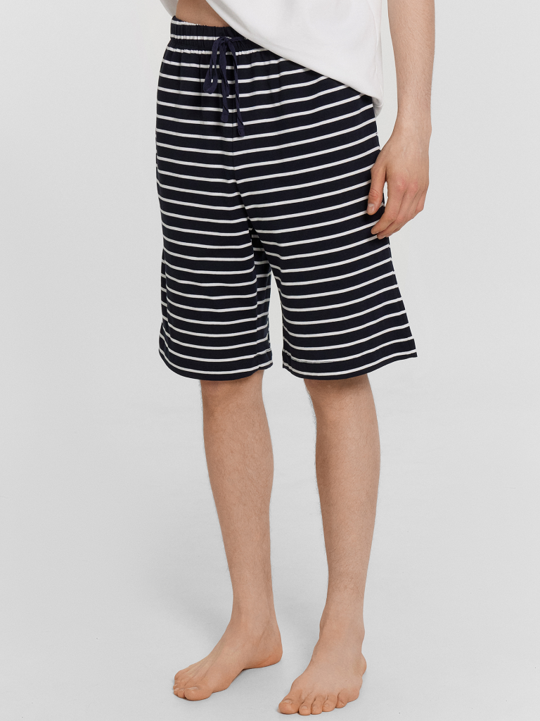 Шорты прямые, свободные. Пояс цельнокроеный с эластичной тесьмой внутри. С внешней стороны пояса пробиты петли и втянута хб тесьма.В боковых швах обработаны карманы, подкладка кармана из основного полотна. Нижние срезы брюк выполнены швом вподгибку на 2-игольной плоскошовной машине.