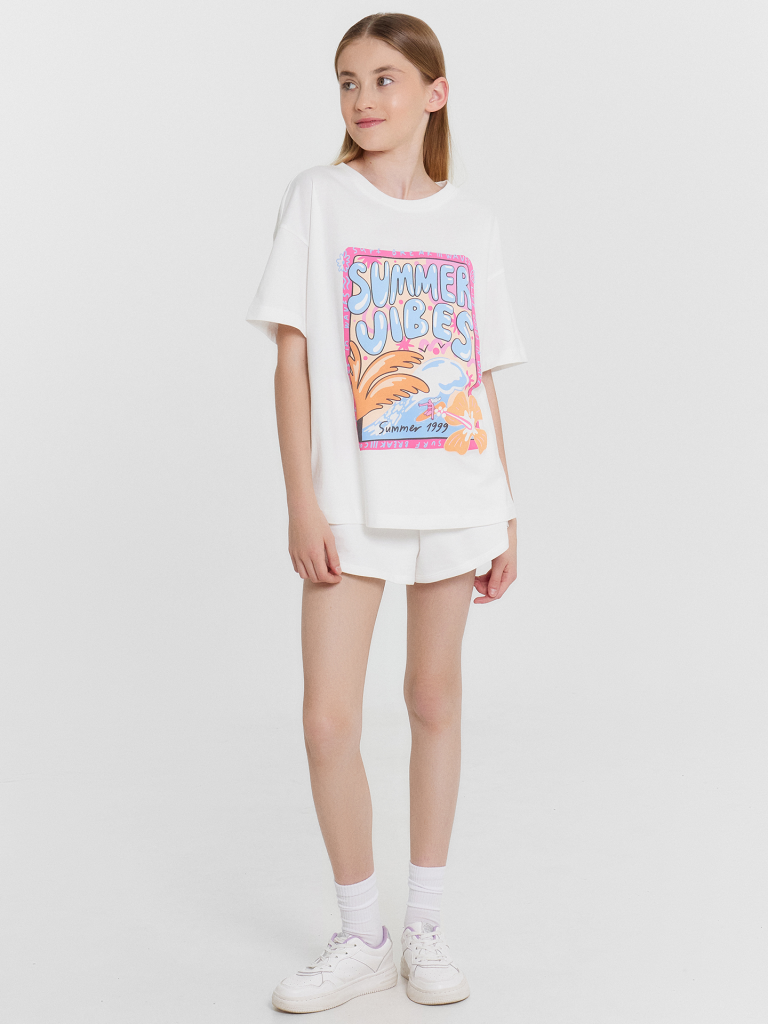 Шорты для девочек. Шорты укороченные, с высокой посадкой. Пояс цельнокроеный с эластичной тесьмой внутри. Снаружи пробиты петли и втянут шнур 8PXС-2. В боковых швах кант из трикотажного кулирного полотна. Нижние срезы шорт обработаны швом в подгибку.