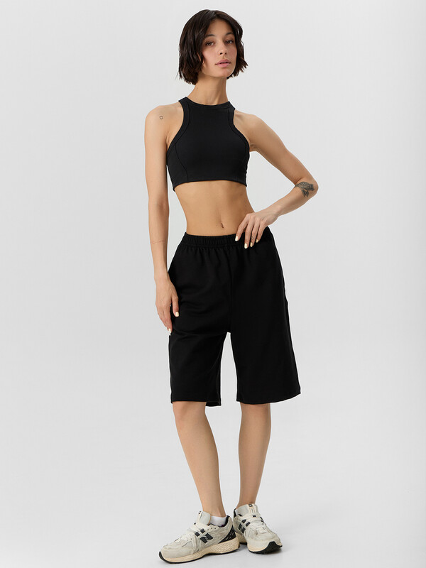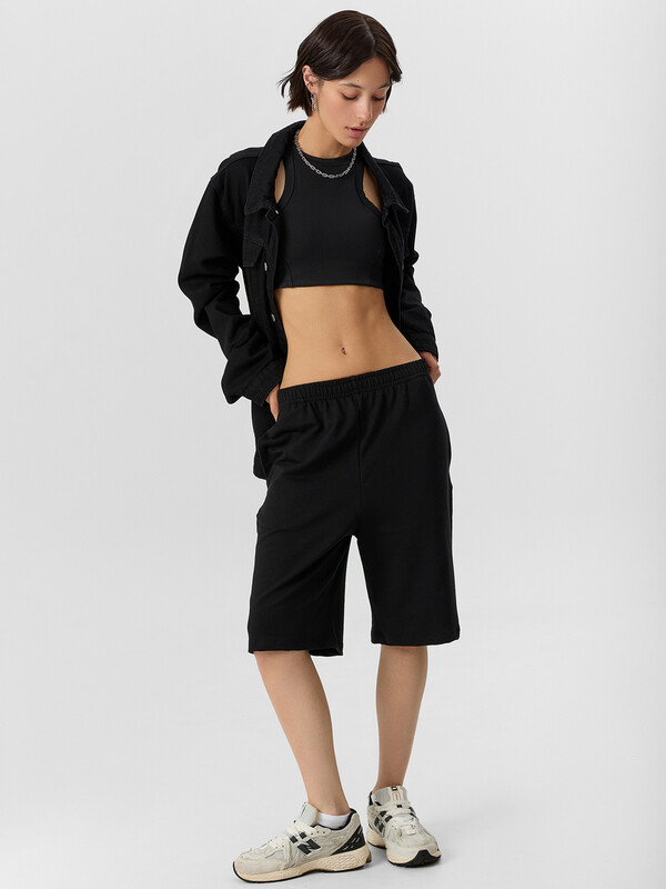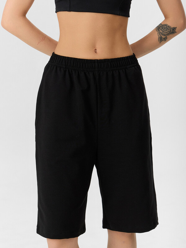 Стильные шорты свободного силуэта из трикотажного футера. Длина чуть выше колена. Высокая посадка на талии. Удобные боковые карманы. Внутри пояса – эластичная резинка. Ничего лишнего!
