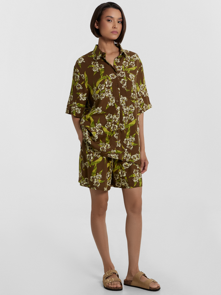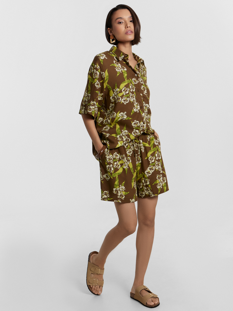Эти женские шорты свободного силуэта — стильный и удобный вариант для повседневных образов. Благодаря эластичному поясу на кулиске, модель обеспечивает комфортную посадку, а боковые карманы добавляют практичности. Легкое расширение к низу создает расслабленный силуэт, а длина выше колена делает шорты универсальными для различных сочетаний. Изделие выполнено из вискозы — материала, который отличается мягкостью, воздухопроницаемостью и приятными тактильными свойствами. Дополните эти шорты подходящей рубашкой из этой же коллекции, чтобы создать гармоничный и стильный образ для жарких летних дней!