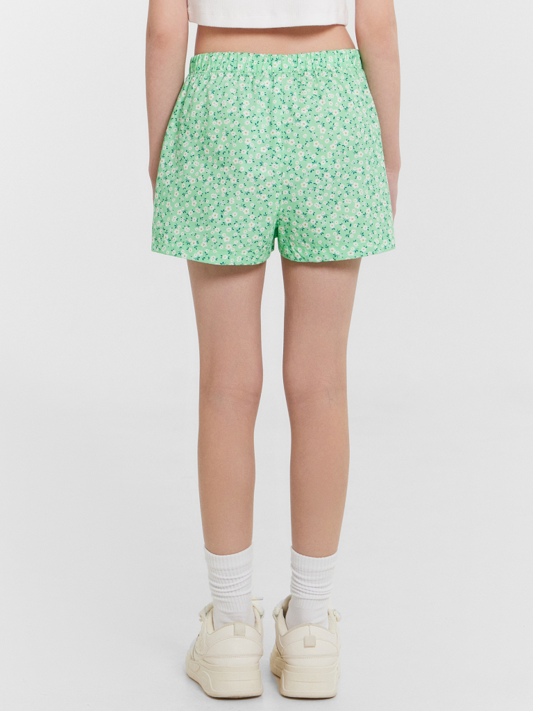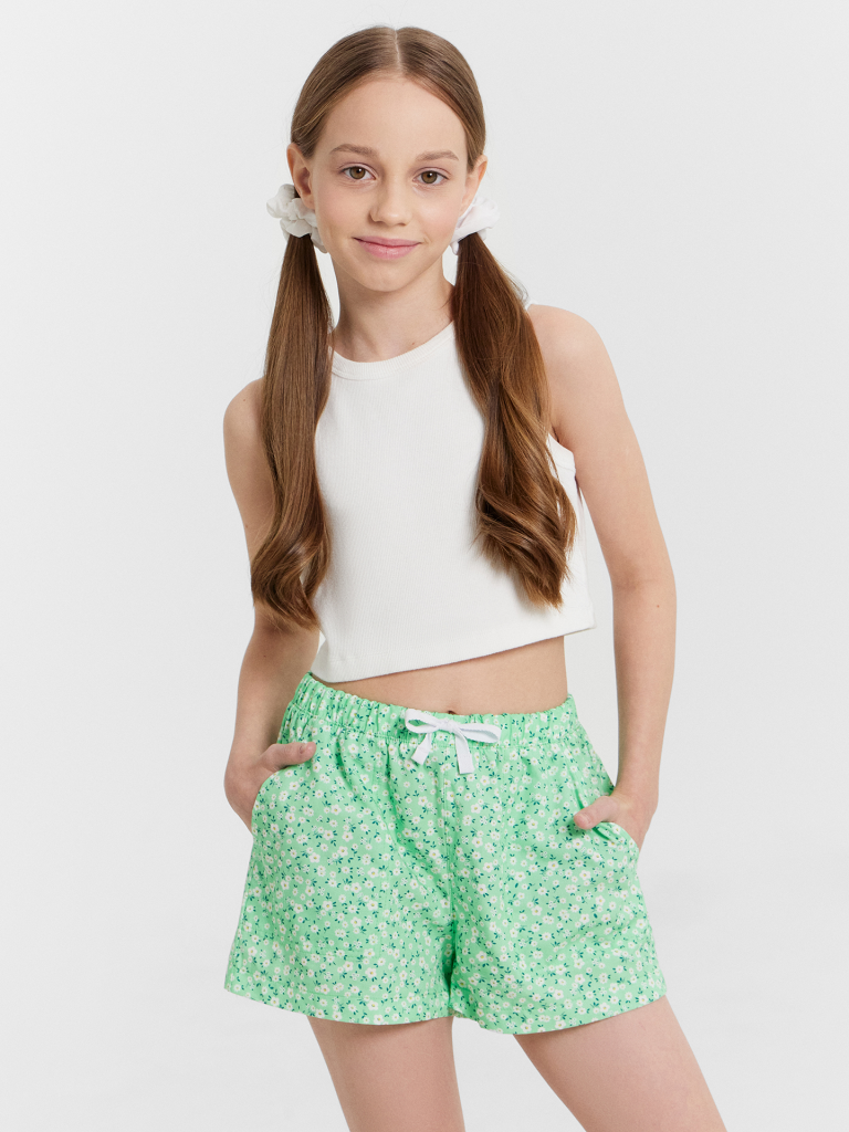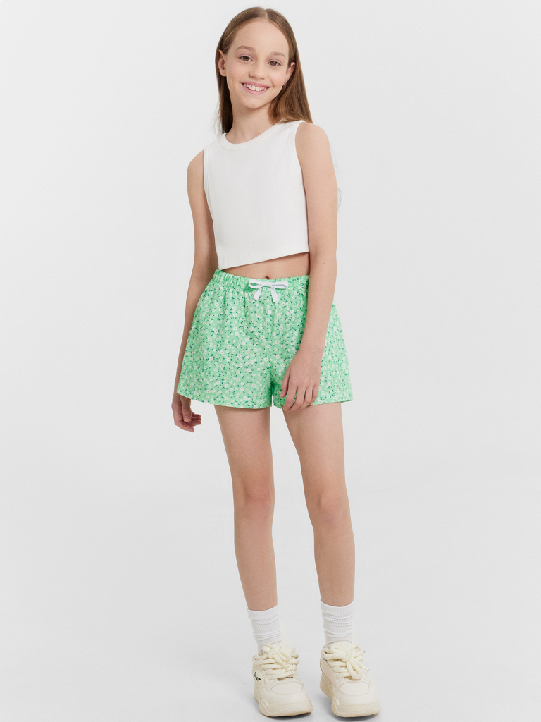 Стильные мини-шорты из текстильного полотна. В поясе – эластичная тесьма, на центральной части пояса – бантик. Есть боковые карманы. Лаконичные и комфортные шорты!