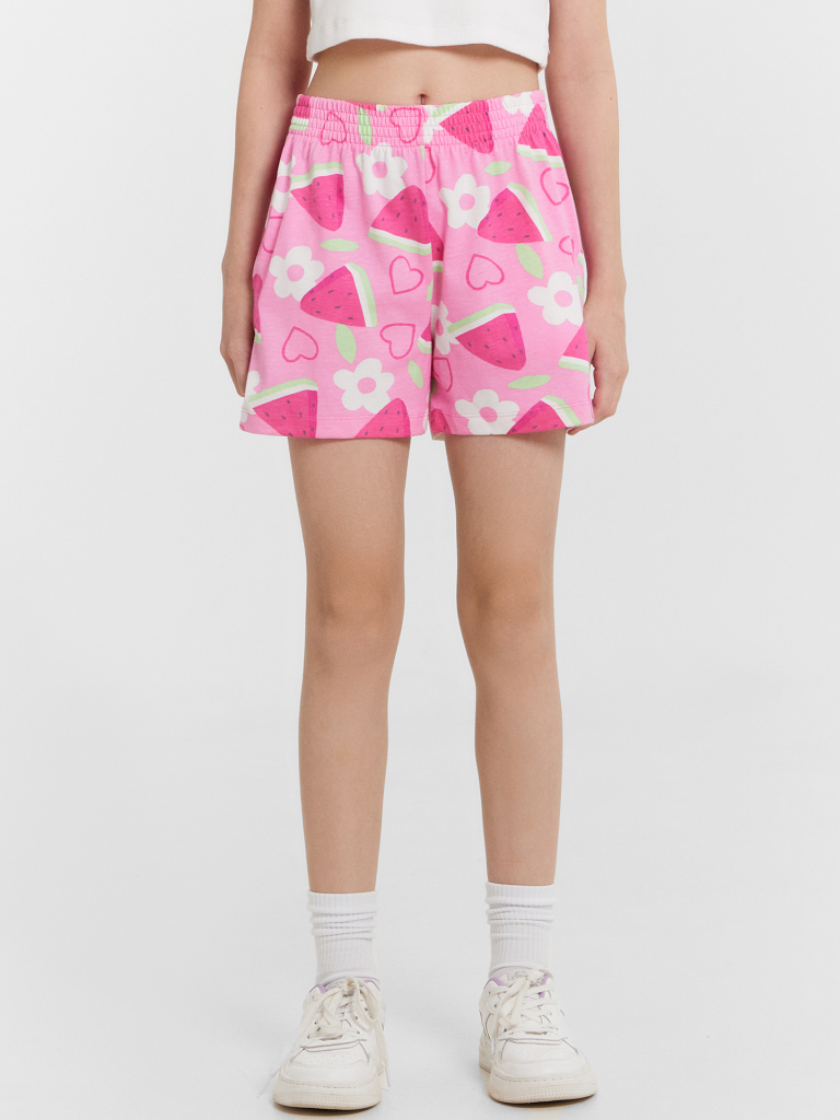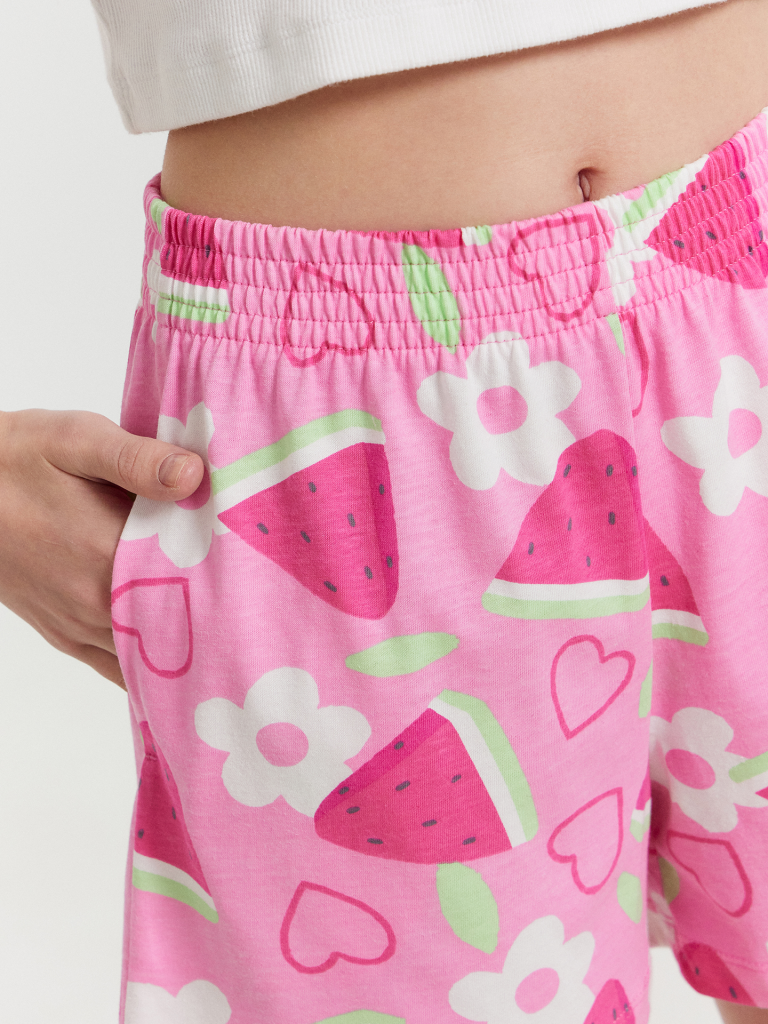 Стильные шорты из трикотажной кулирки. Линия талии классическая. В поясе – трикотажная резинка. Есть боковые карманы. Отличный повседневный вариант!