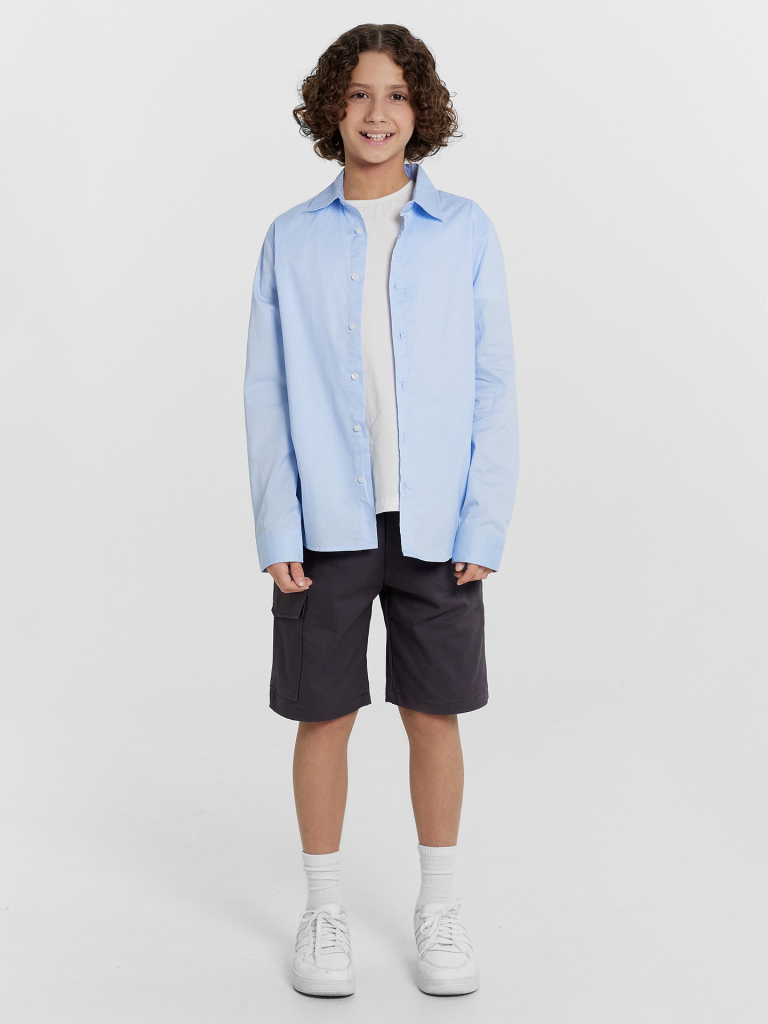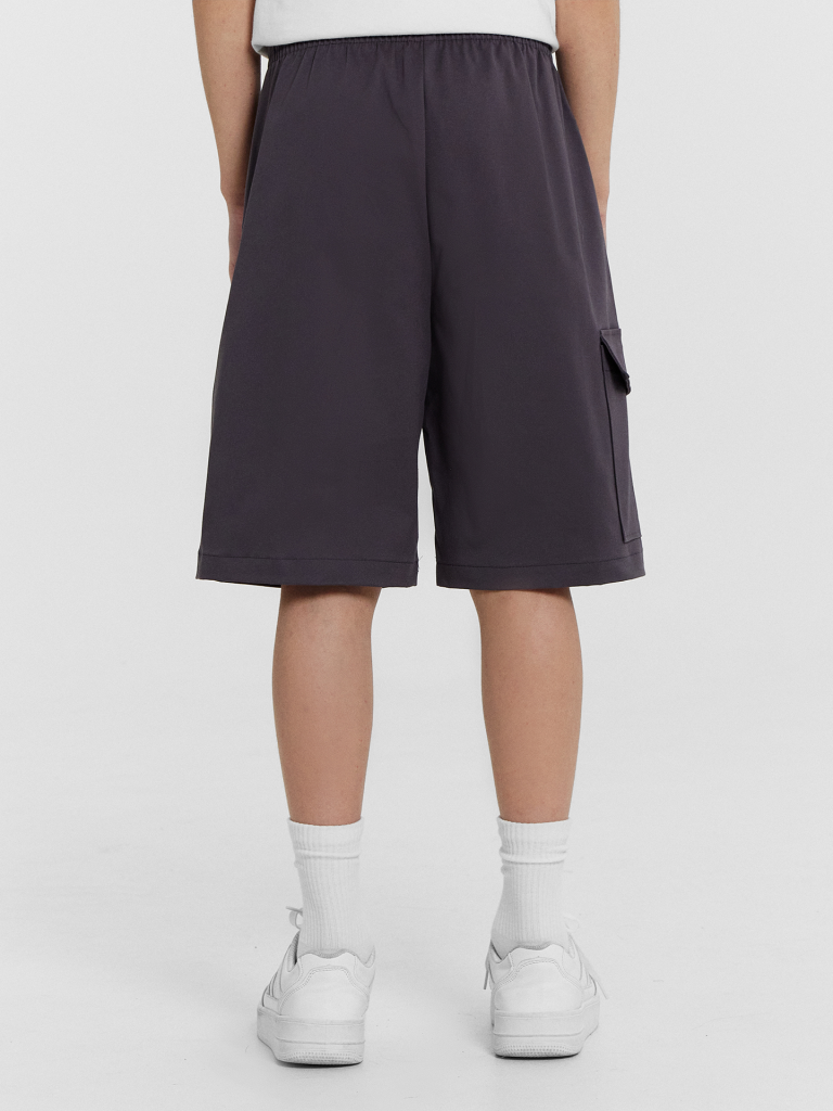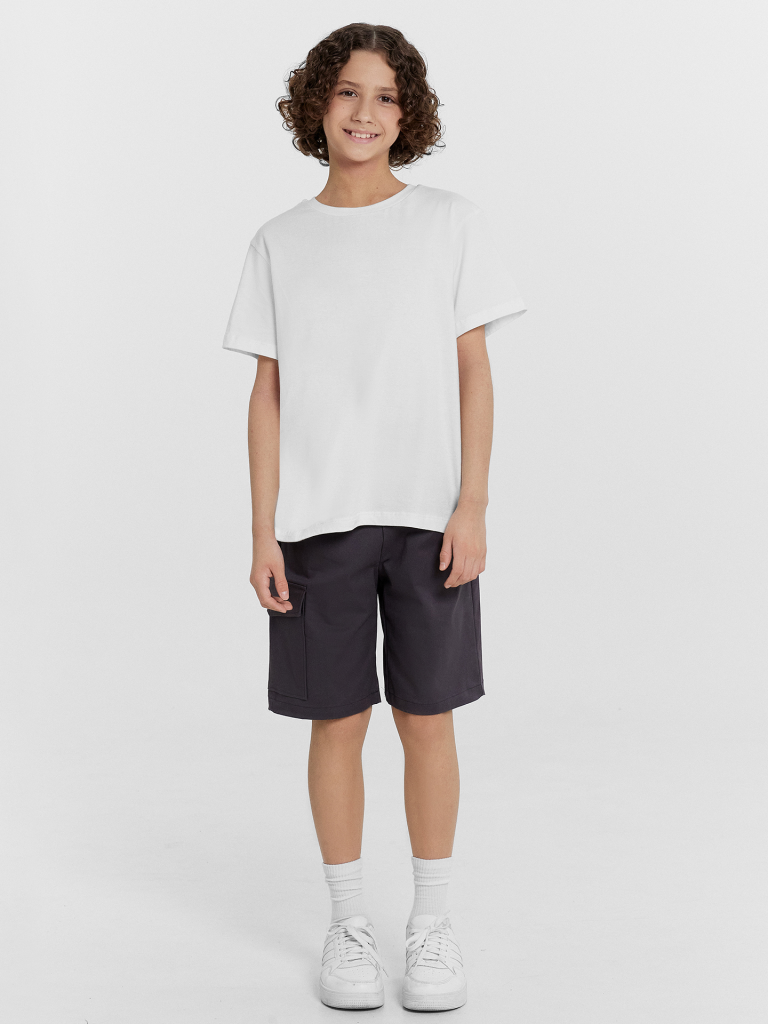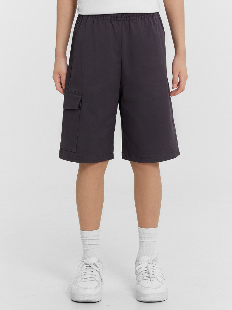 Шорты карго прямого силуэта из текстильного полотна. Посадка средняя. Длина выше колена. Пояс цельнокроеный с эластичной тесьмой и шнуром внутри. По поясу выполнены три декоративные строчки. На передних деталях брюк настрочен один карман с клапаном, обработаны карманы с наклонным входом от боковых швов. Низ изделия обработан швом в подгибку.