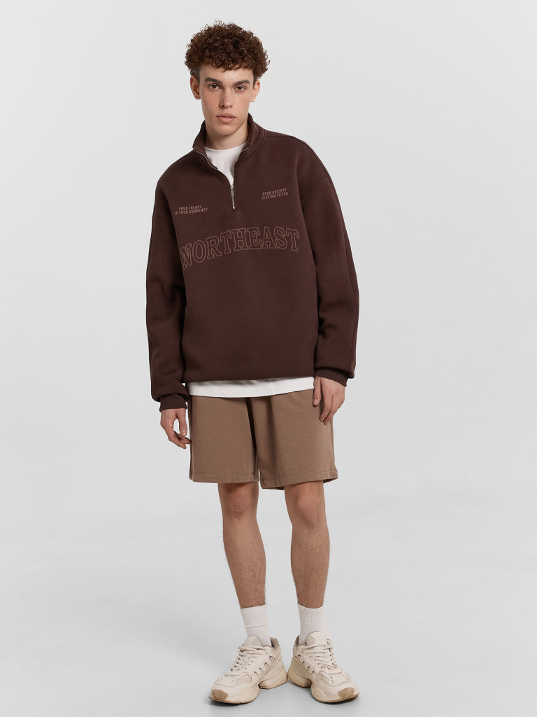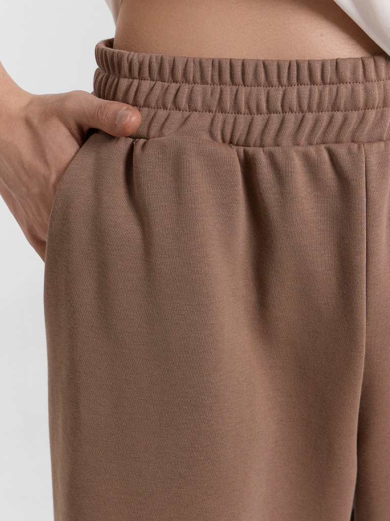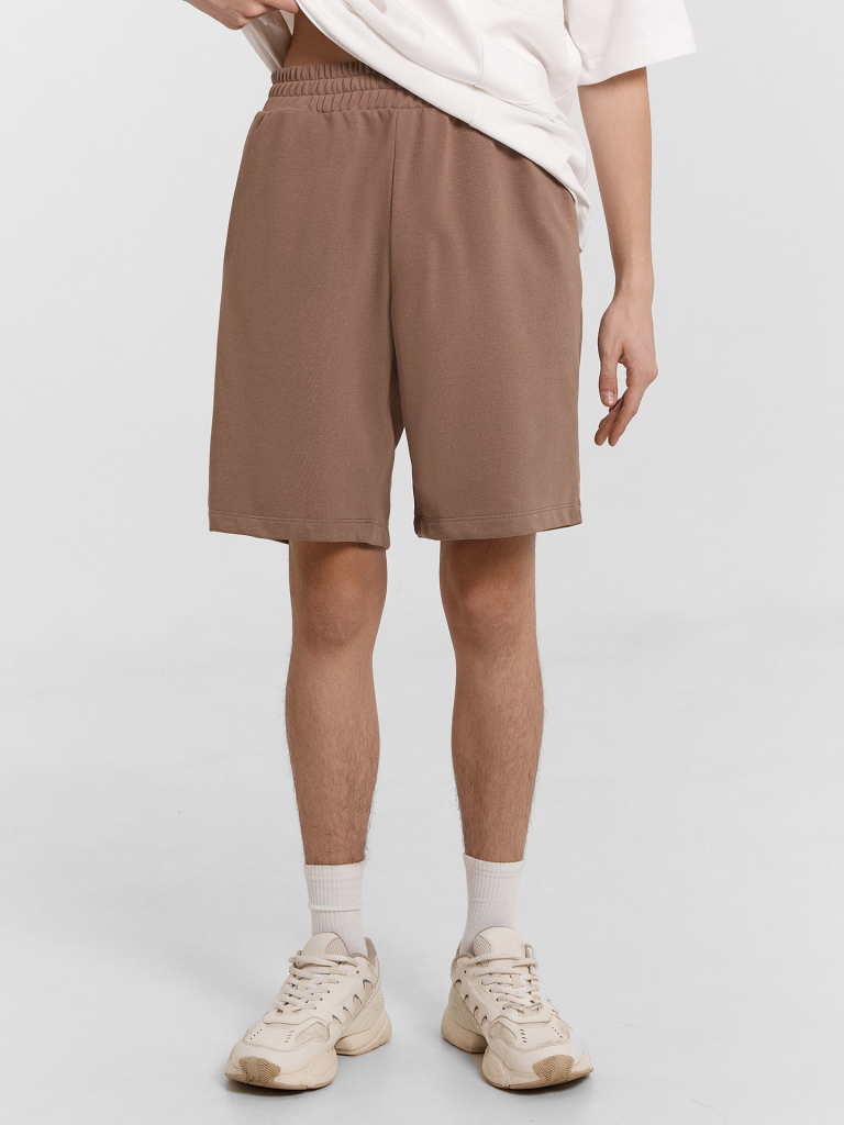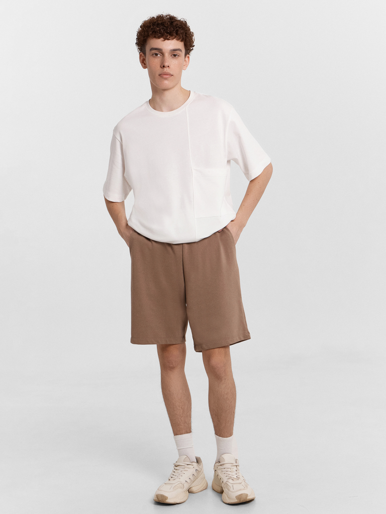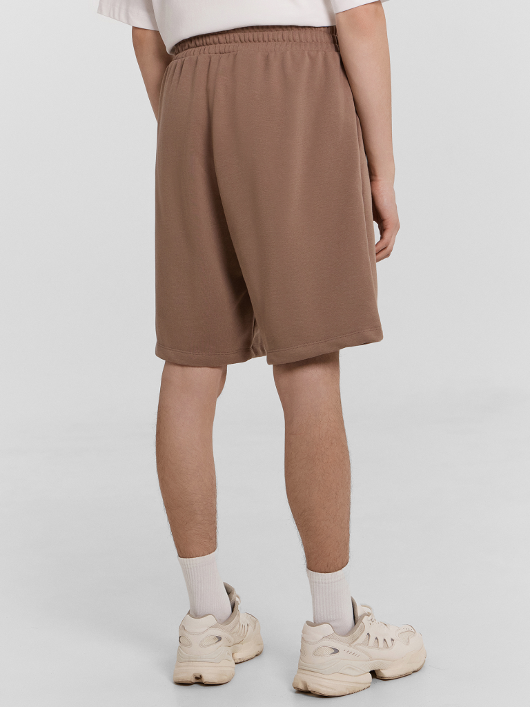 Шорты мужские прямого силуэта из трикотажного полотна футер. Пояс отрезной из основного полотна с эластичной тесьмой внутри. По поясу проложены отделочные строчки. По внутренней части пояса втавлен кругловязаный шнур. В боковых швах обработаны карманы с отрезным бочком, подкладка карманов кулирка.