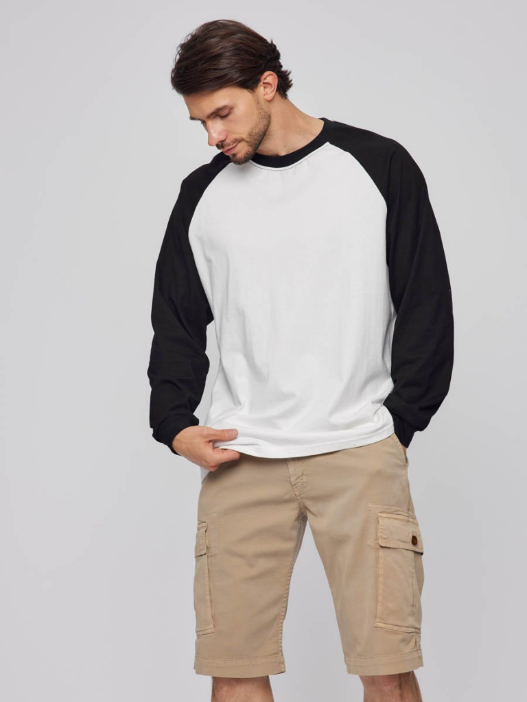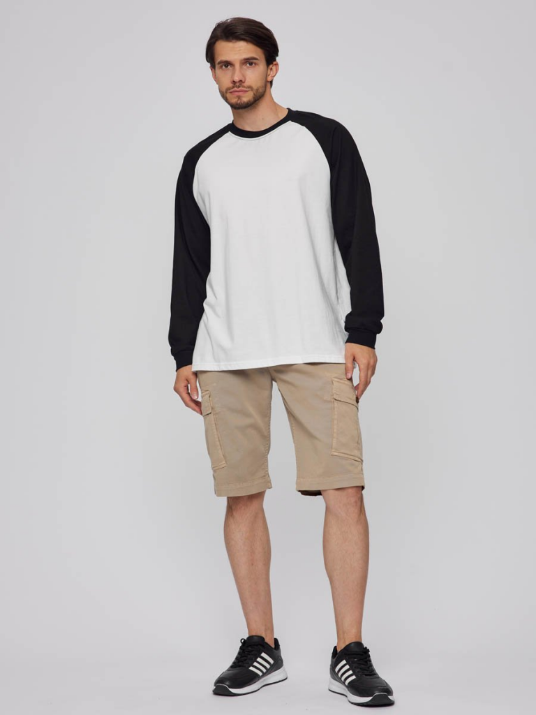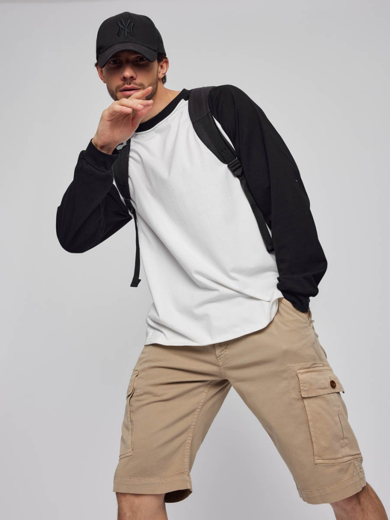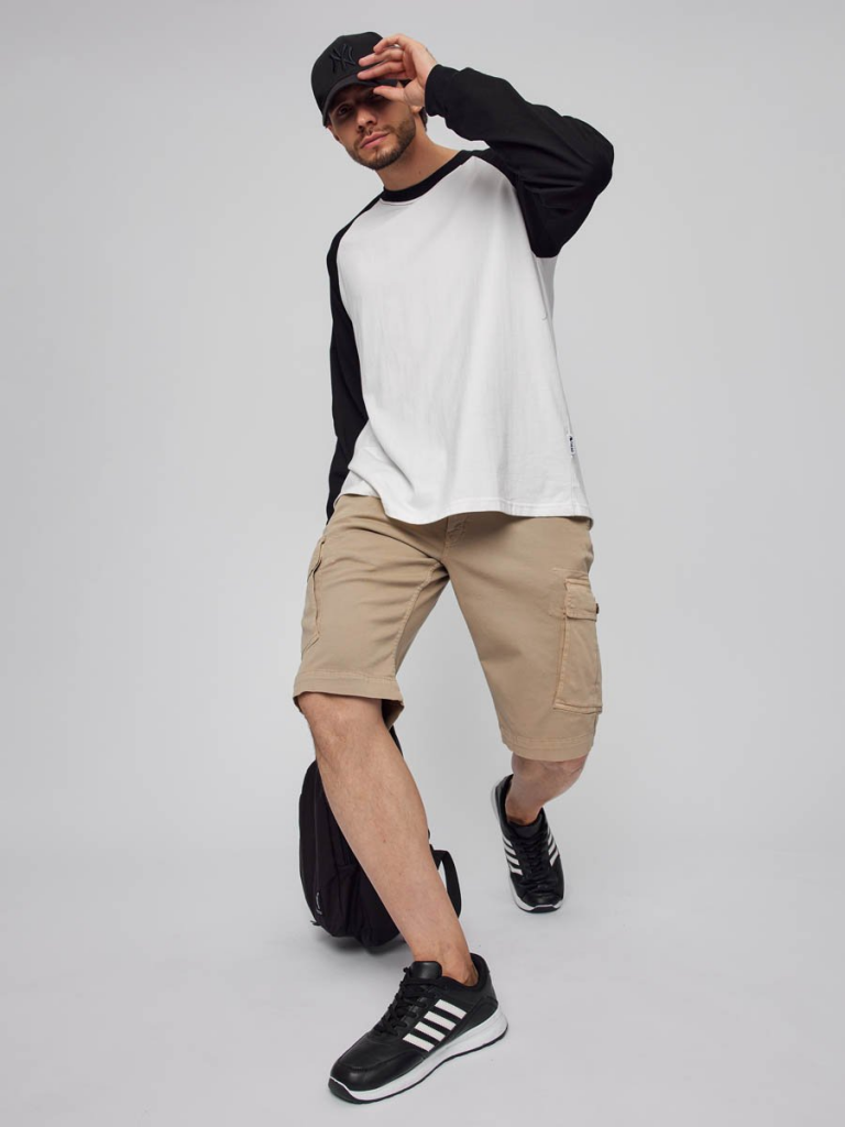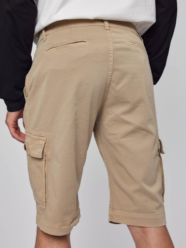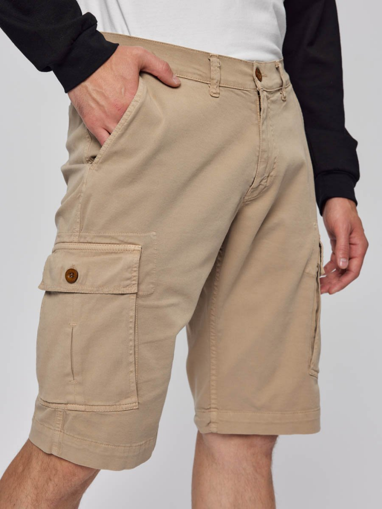 Мужские шорты-карго. Посадка Comfort fit (свободные по бедру), средняя посадка по талии спереди и высокая сзади, прямые к низу. Застежка на молнии. Шорты имеют боковые косые карманы, по бокам накладные карманы с клапаном застегивающиеся на пуговицу, сзади имитация прорезных карманов. Выполнены из слабоэластичной плотной ткани gabardine stretch. Крашение Garment dayed, т. е. покрашены в готовом виде после пошива.