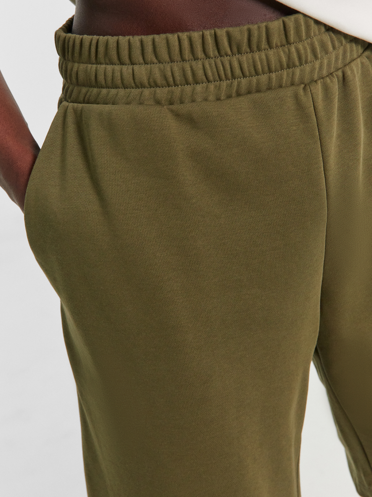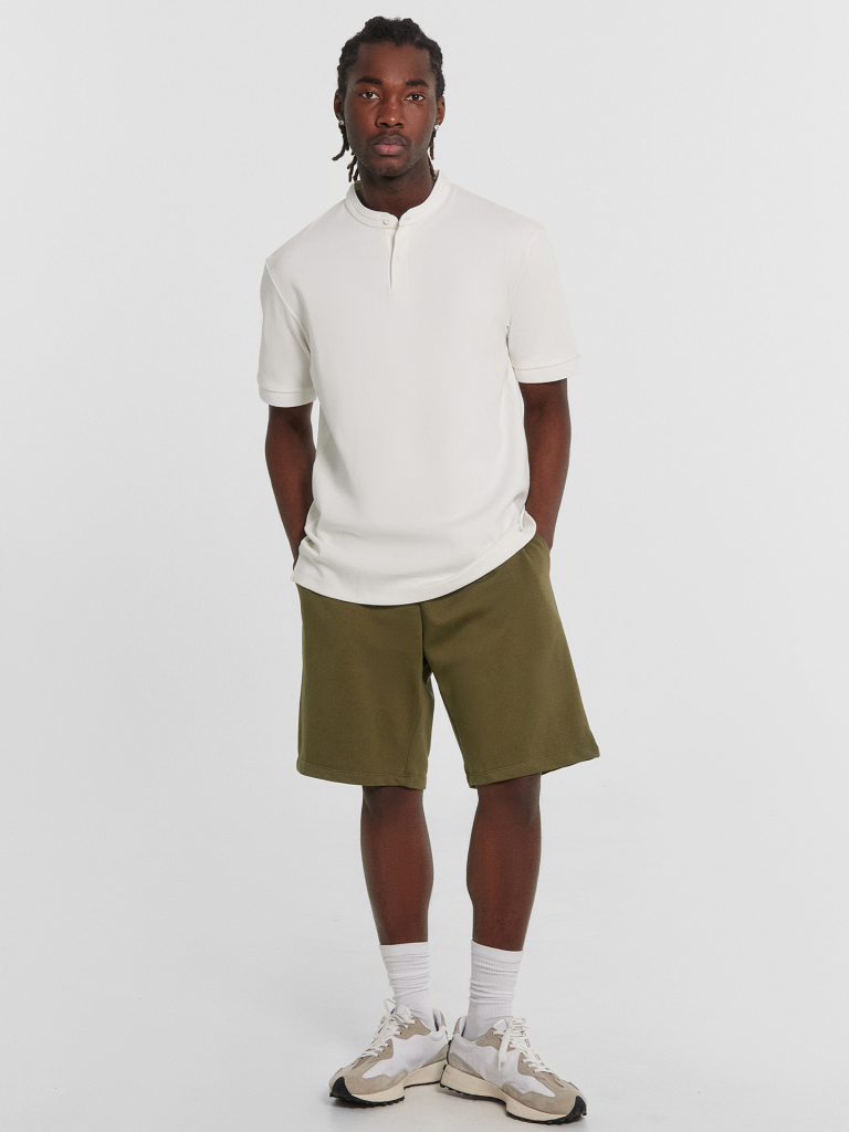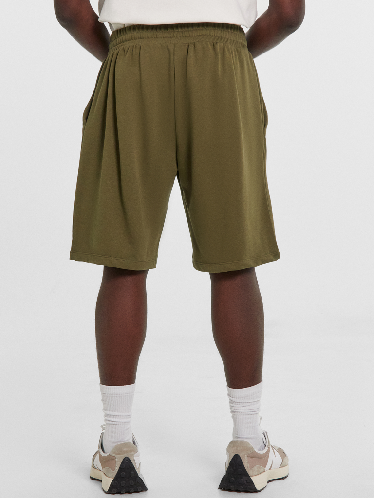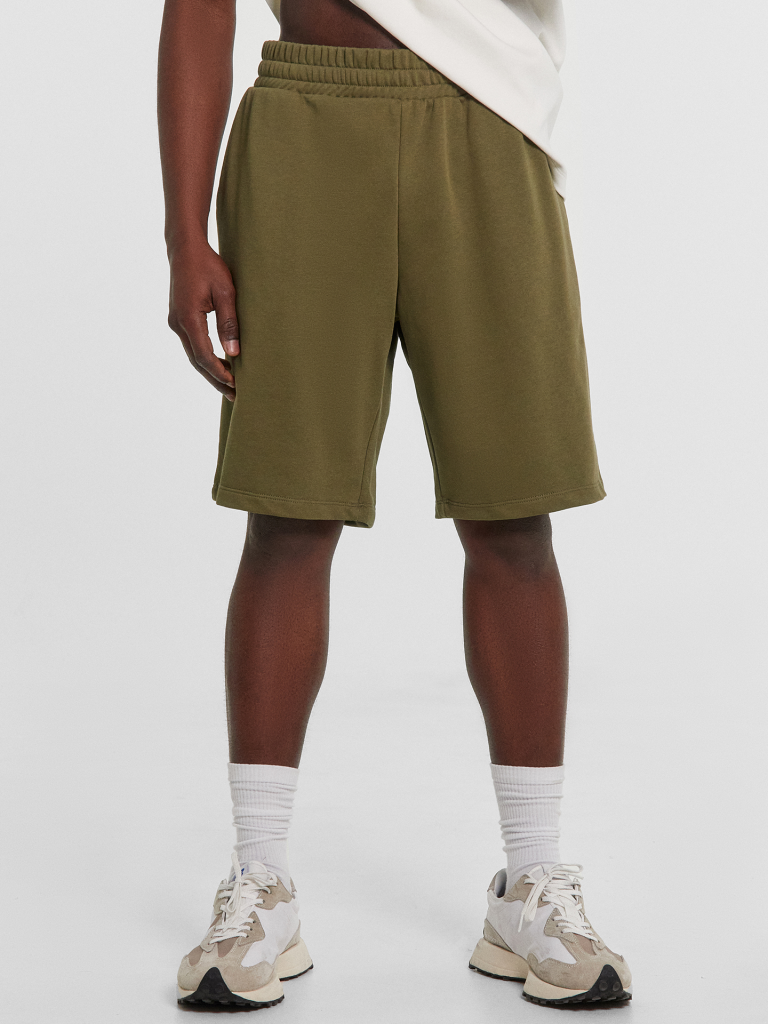 Шорты мужские прямого силуэта из трикотажного полотна футер. Пояс отрезной из основного полотна с эластичной тесьмой внутри. По поясу проложены отделочные строчки. По внутренней части пояса втавлен кругловязаный шнур. В боковых швах обработаны карманы с отрезным бочком, подкладка карманов кулирка.