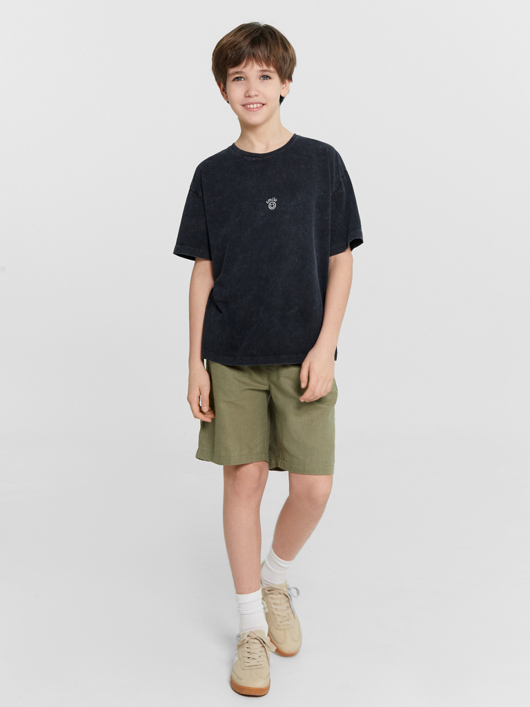 Шорты прямого силуэта. Посадка средняя. Пояс цельнокроеный с эластичной тесьмой внутри. Шов сидения шорт распошит. На поясе пробиты петли, заправлен шнур из основного полотна. По переду имитация гульфика, обработаны карманы с наклонным входом от боковых швов. Низ шорт