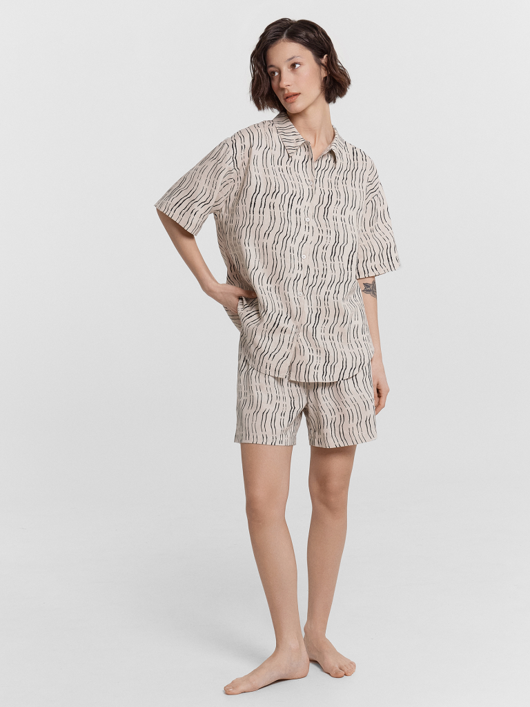 Эти женские домашние шорты — удобный и стильный элемент гардероба! Модель свободного силуэта гарантирует комфорт и непринужденность, идеально подходя для расслабленных домашних образов. Эластичный пояс гарантирует легкую посадку и удобство, а обработка низа шорт швом в подгибку добавляет аккуратности и долговечности. Шорты выполнены из сочетания натурального льна и района — материалов, которые прекрасно дополняют друг друга. Лен обеспечивает легкость, воздухопроницаемость и свежесть даже в жаркие дни, а район добавляет мягкость, эластичность и приятную текстуру, что делает шорты особенно комфортными. Сочетайте эту модель с рубашкой из этой же коллекции бренда для создания гармоничного и стильного комплекта, который будет радовать вас как дома, так и в моменты отдыха. Рекомендуем!