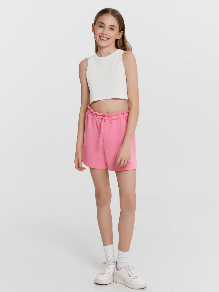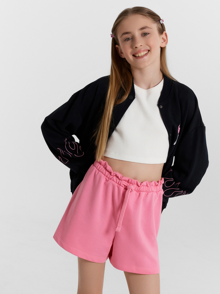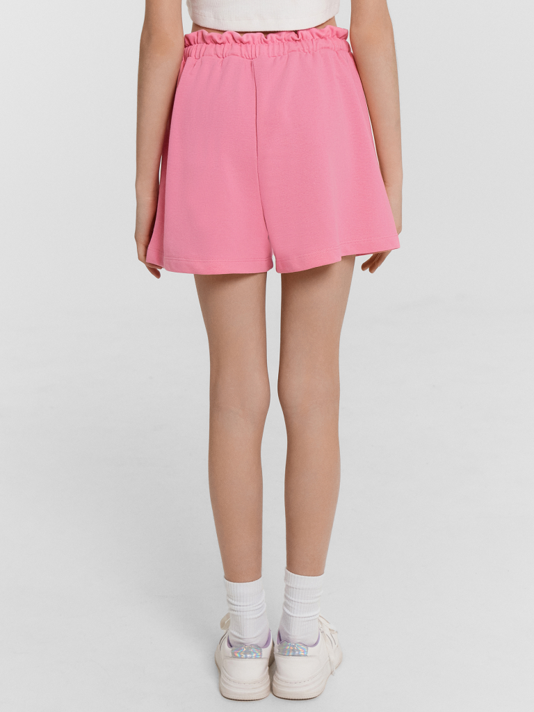 Свободные шорты для девочек — это стильное и удобное решение для активного дня. Модель выполнена из мягкого и практичного трикотажного футера, который обеспечивает комфорт и воздухопроницаемость. Пояс с внутренней эластичной тесьмой и регулировочным шнурком-завязкой позволяет идеально настроить посадку, добавляя удобства в носке. Шорты отлично сочетаются с топами и футболками, что делает их универсальной частью гардероба для прогулок, игр и отдыха. Практичный и модный выбор для маленьких модниц!