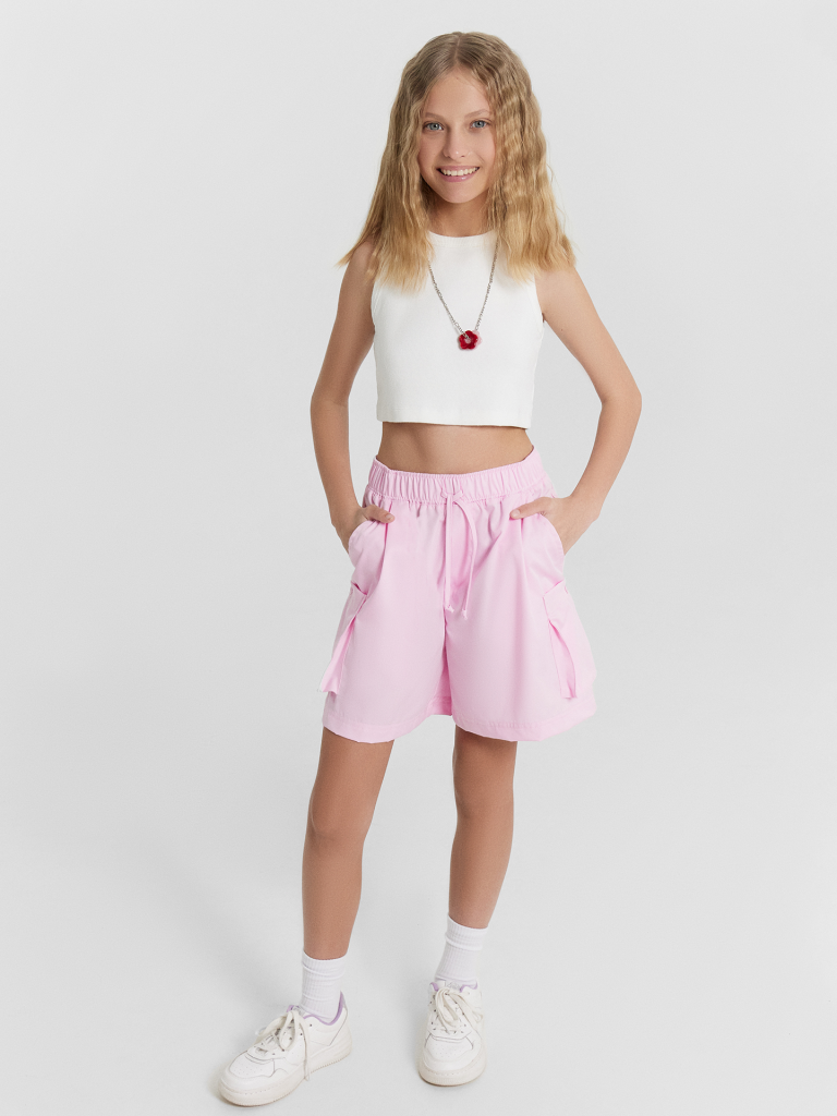 Эти шорты для девочек — удобное и стильное решение для повседневных образов и активного отдыха. Модель оснащена эластичным поясом на кулиске, который обеспечивает комфортную посадку и удобство при движении. Такая конструкция позволяет легко адаптироваться к фигуре, не создавая дискомфорта. Особый акцент в дизайне — клапаны на боковых деталях, имитирующие карманы, придающие шортам стильный вид и добавляющие оригинальности в повседневный образ. Нижний край обработан швом вподгибку, что делает изделие аккуратным и долговечным, предотвращая преждевременное изнашивание. Шорты выполнены из смесового хлопка — материала, который сочетает мягкость натуральных волокон с прочностью и устойчивостью к деформации. Это обеспечивает удобство, воздухопроницаемость и практичность в повседневной носке. Отличный выбор для прогулок, игр и активного отдыха, который гармонично сочетается с различными топами и футболками, создавая легкие и стильные образы!