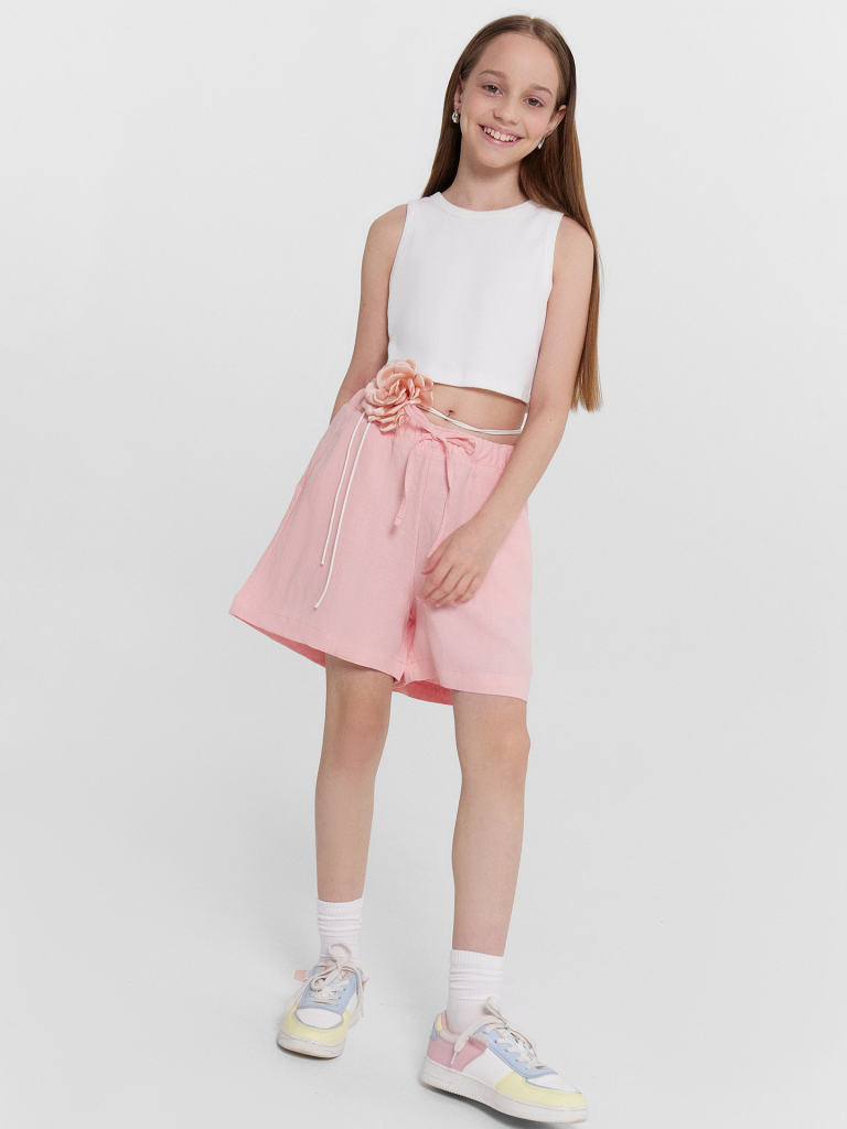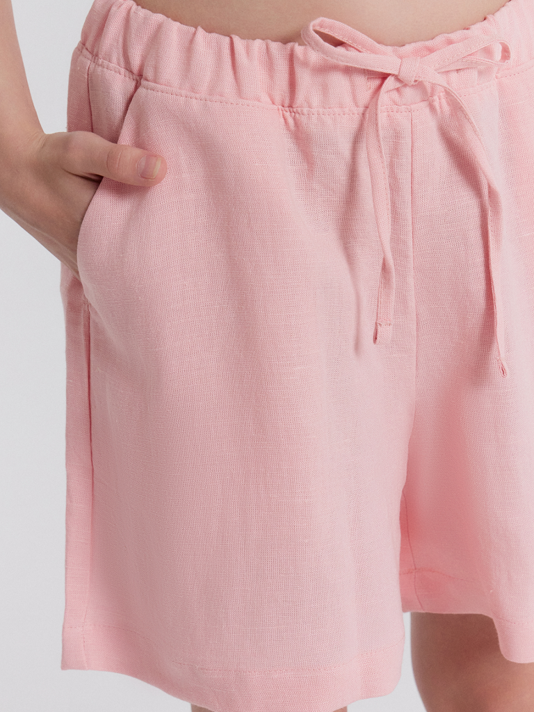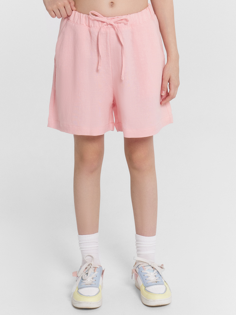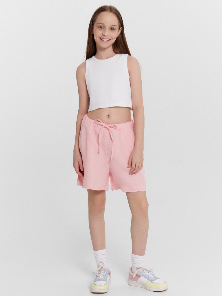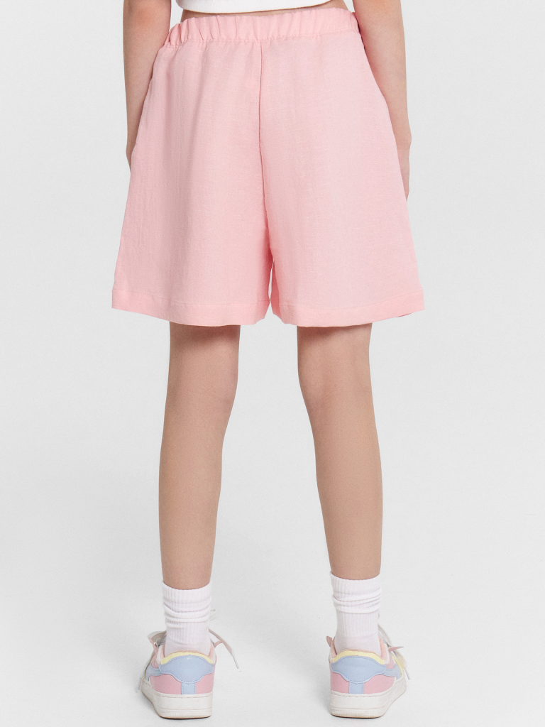 Шорты для девочек свободного силуэта, которые обеспечат комфорт и стиль в любой ситуации! Модель выполнена из натуральных материалов – льна и вискозы, что обеспечивает превосходную воздухопроницаемость и мягкость. Высокая линия талии и эластичный пояс на кулиске гарантируют удобную и надежную посадку, а свободный крой обеспечивает легкость движений. Длина выше колена придает шортам современный и стильный вид, а обработка низа швом вподгибку добавляет аккуратности и завершенности изделию. Такие шорты идеально подходят для активных игр и повседневных прогулок, сочетая в себе практичность и стильный дизайн. Рекомендуем!