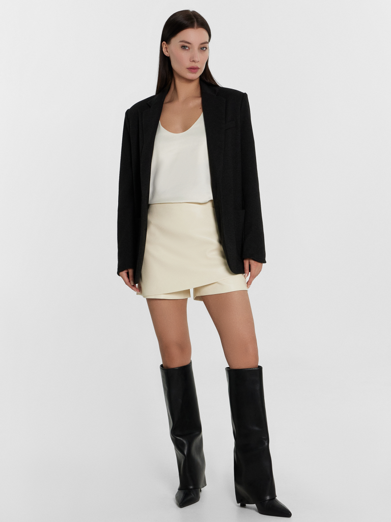 Женские шорты-юбка из искусственной кожи — стильный и практичный элемент вашего гардероба. Эта модель отличается накладной деталью спереди имитирующей юбку, добавляя интересный акцент в образ. Застежка на потайную молнию в боковом шве отвечает за практичность и удобство в использовании. Нижние срезы шорт и накладной детали подклеены, что придает изделию аккуратный и завершенный вид. Изделие выполнено из качественного и износостойкого материала, который долго сохраняет свой внешний вид. Эти шорты-юбка разнообразят ваш гардероб, позволяя создавать стильные и оригинальные образы на любой случай.