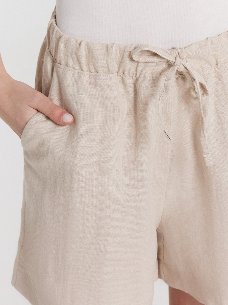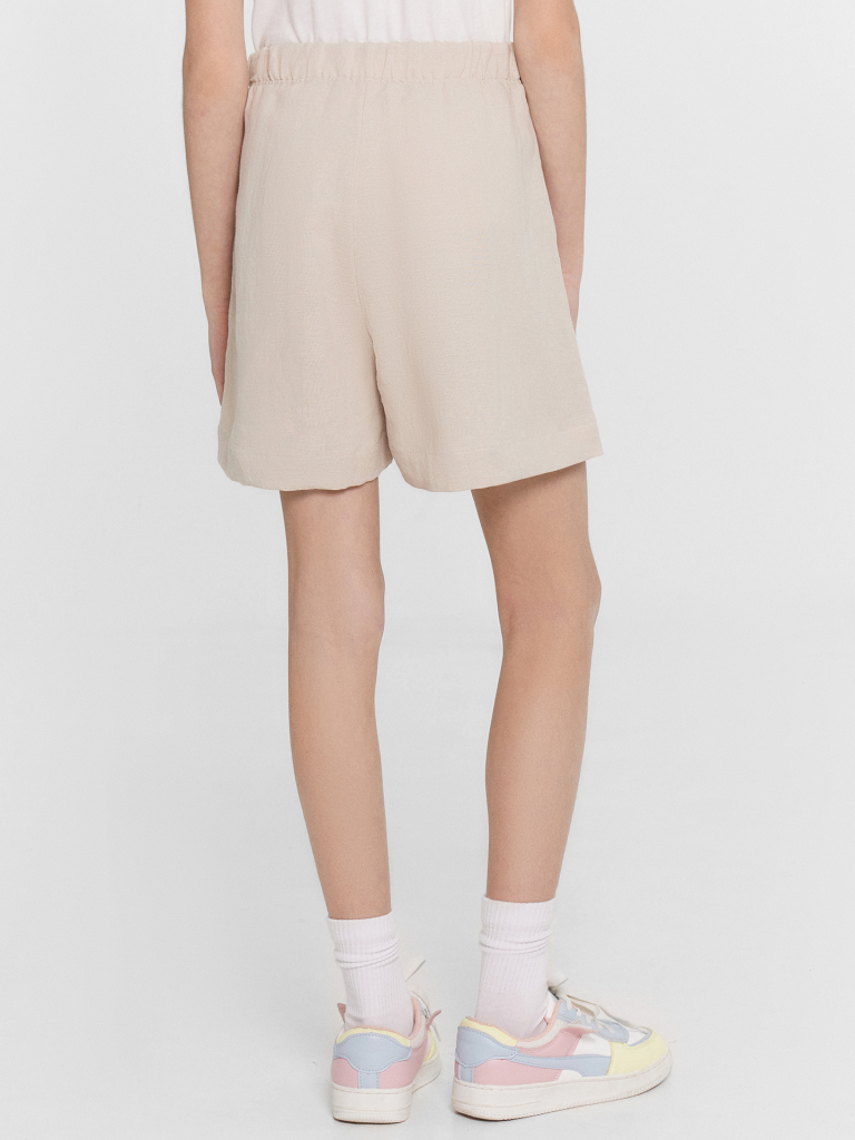 Шорты для девочек свободного силуэта из ткани. Посадка высокая. На детали переда карманы с отрезным бочком. Пояс отрезной с эластичной тесьмой RV40 внутри, на поясе пробиты петли и вставлен шнур из основного полотна. Шов втачивания пояса распошит. Длина выше колена. Низ обработан швом вподгибку с закрытым краем.