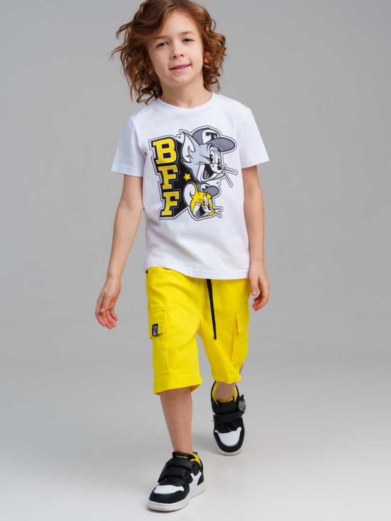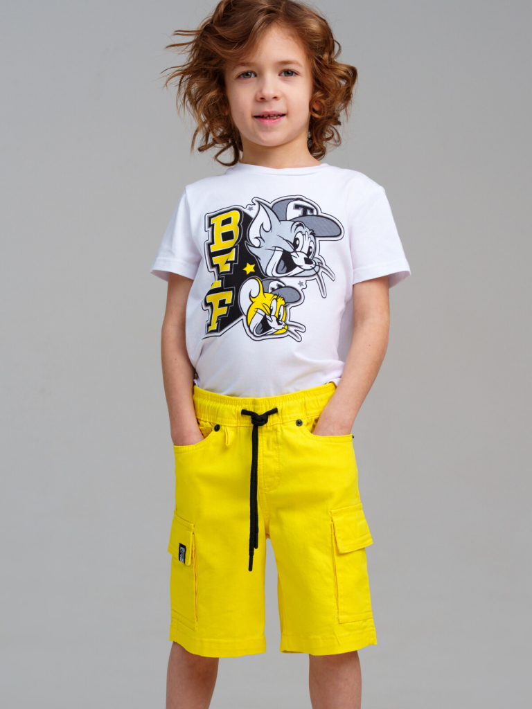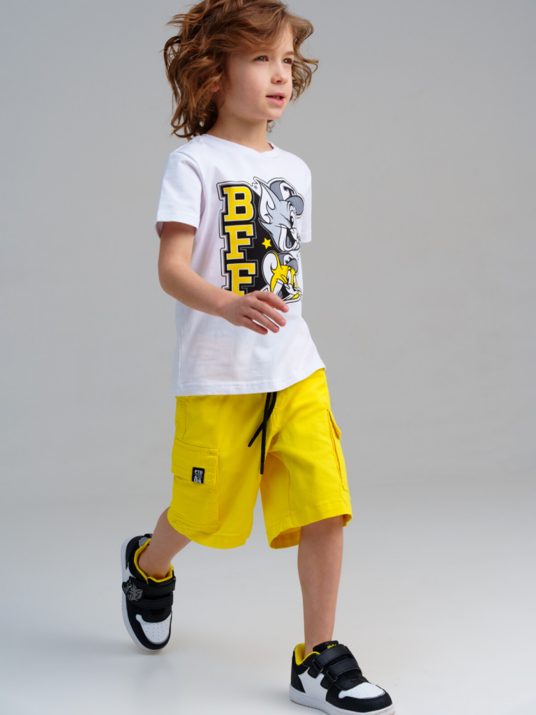 Шорты детские для мальчика. Шорты свободного силуэта на резинке со шнурком. Высокое содержание хлопка 98%. Благодаря наличию эластана в составе ткани изделие держит форму и меньше мнется. Функциональные карманы. Модель выполнена из качественного и плотного текстиля.