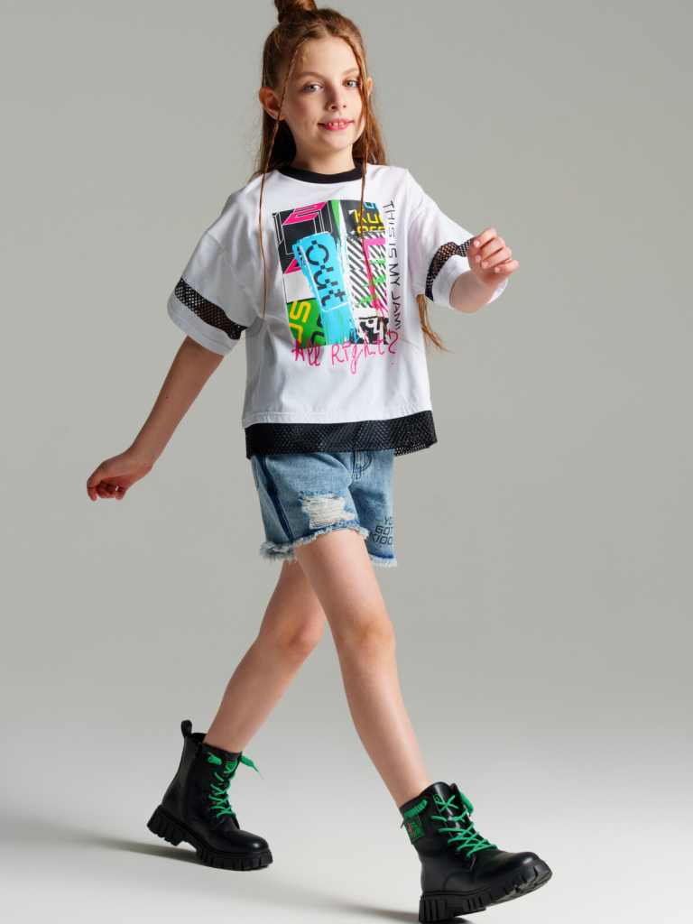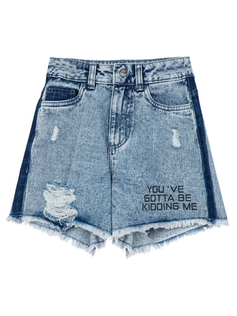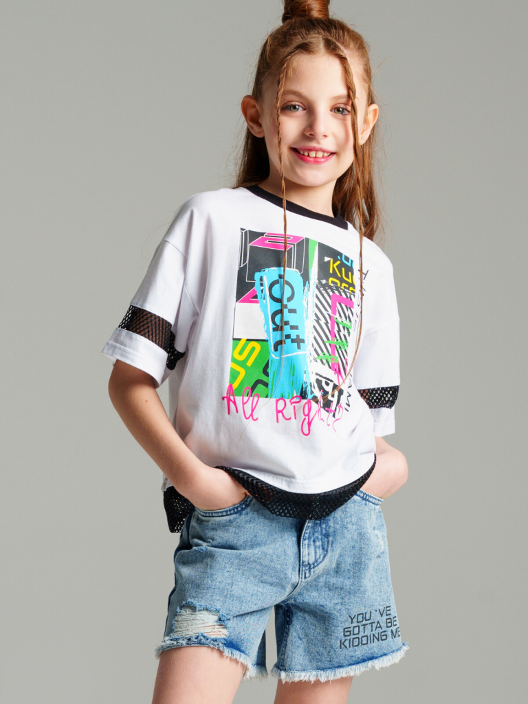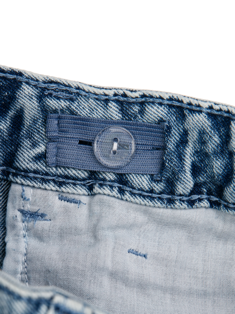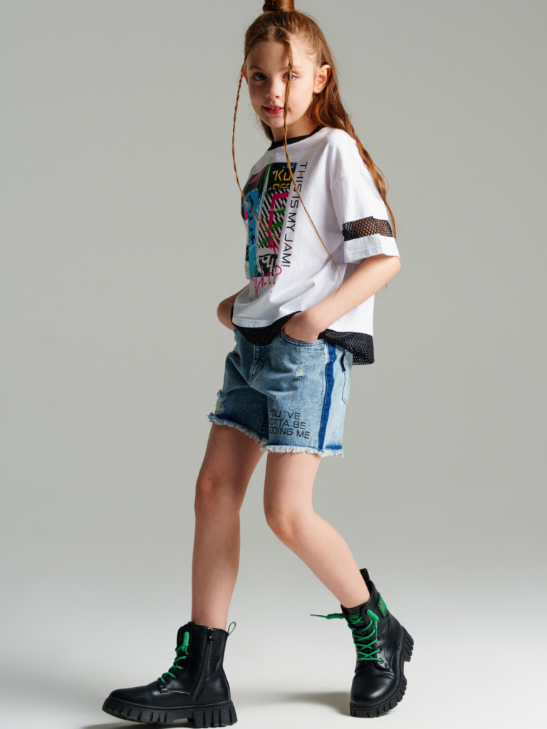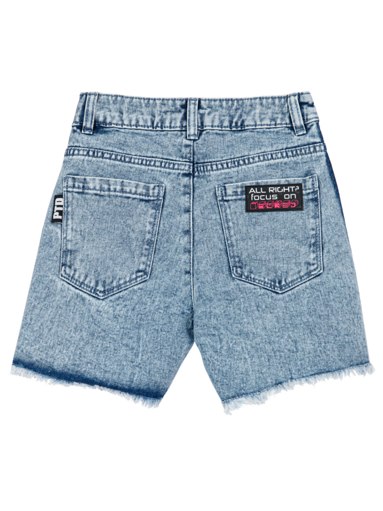 Шорты джинсовые для девочки. Застежка на пуговицу, пояс с внутренней утяжкой. Низ шорт с рваным краем. Модель выполнена из качественного и плотного текстиля.