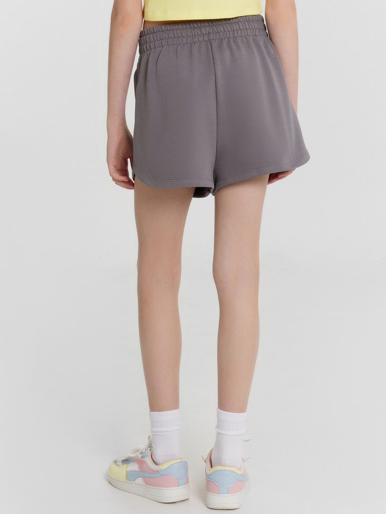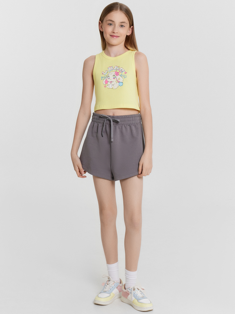 Шорты для девочек. Шорты укороченные, с высокой посадкой. Пояс цельнокроеный с эластичной тесьмой внутри. Снаружи пробиты петли и втянут шнур 8PXС-2. В боковых швах кант из трикотажного кулирного полотна. Нижние срезы шорт обработаны швом в подгибку.