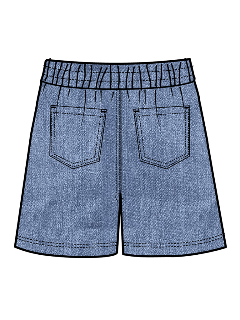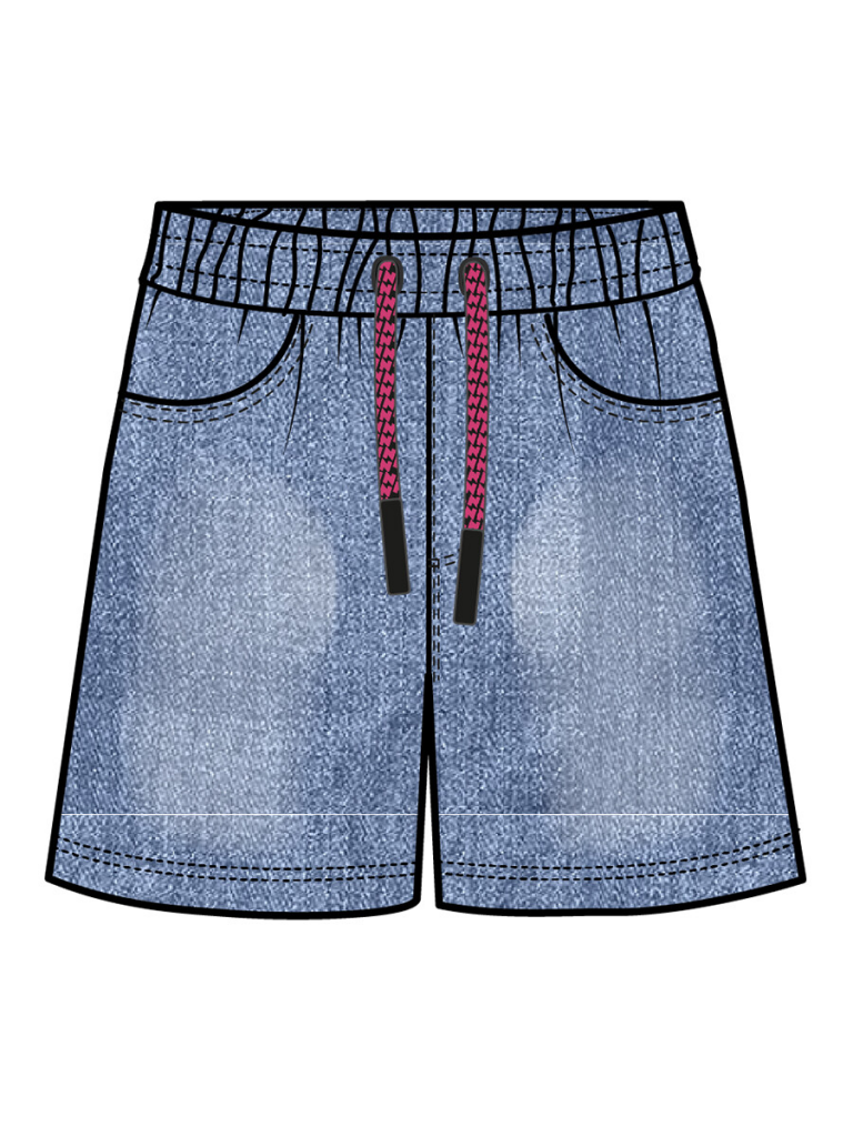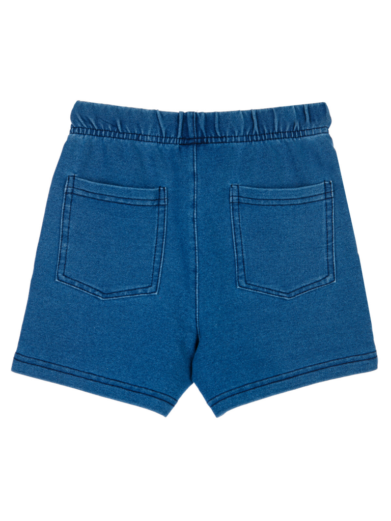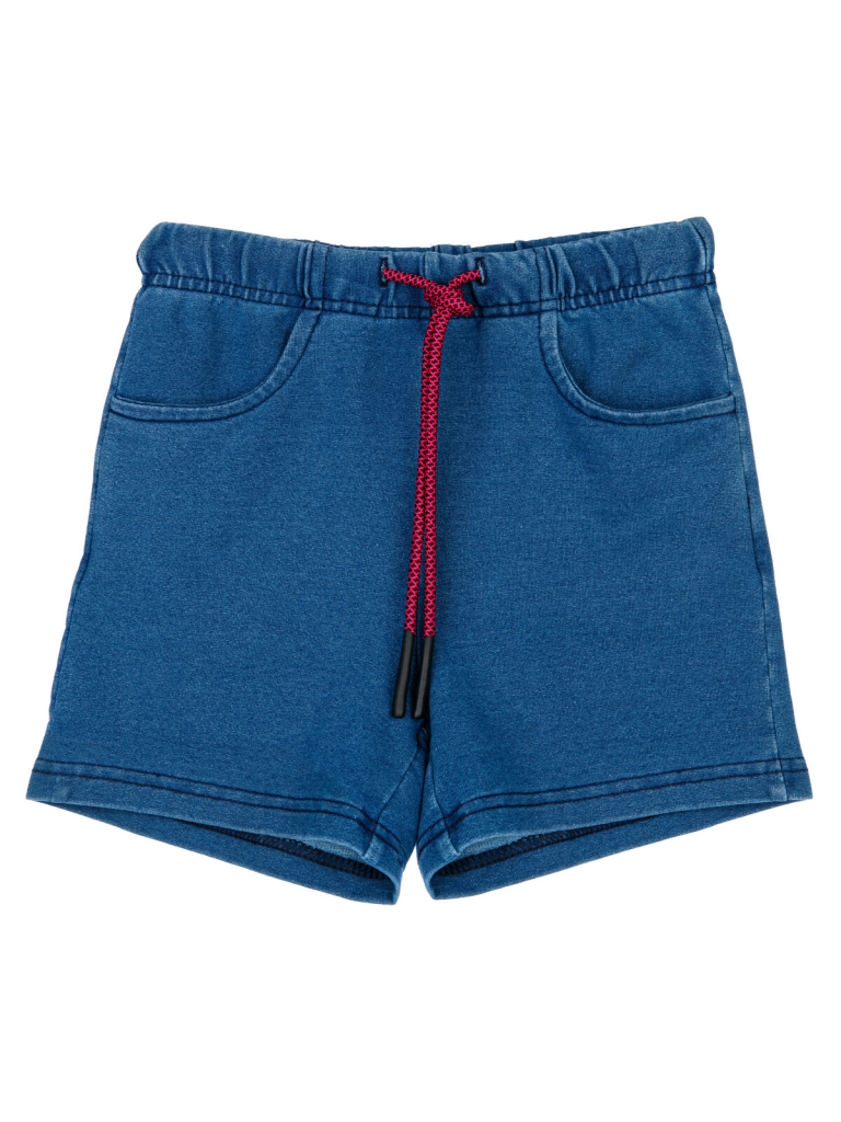 Шорты из качественного футера с имитацией денима. Эластичный пояс со шнурком. Функциональные боковые карманы.