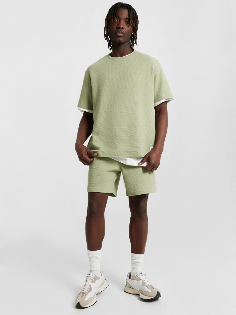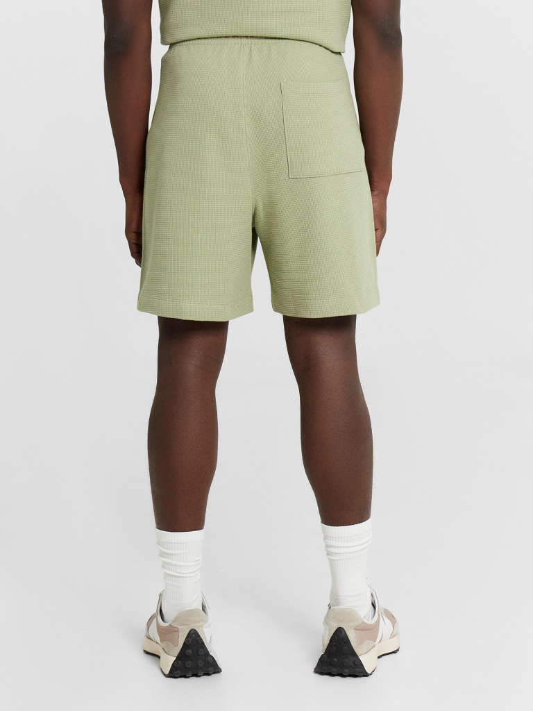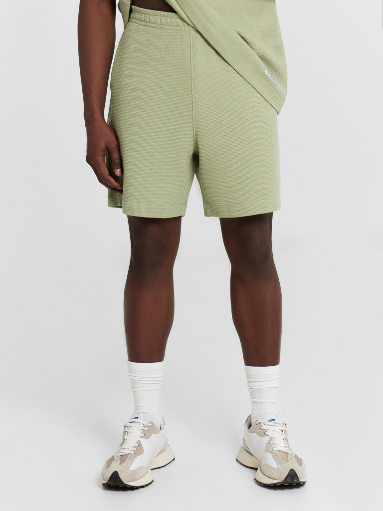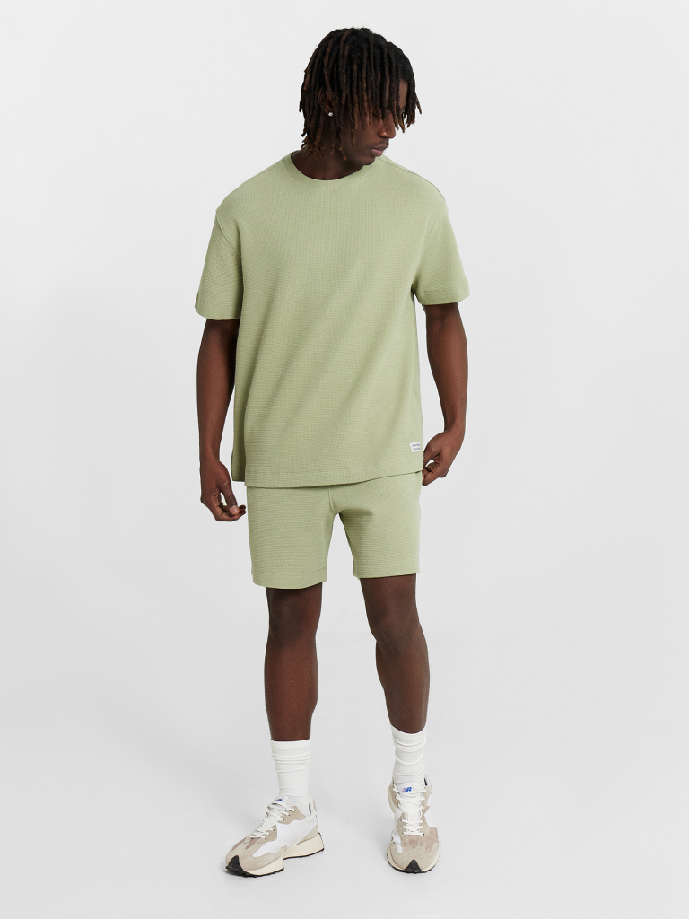 Шорты свободного силуэта. Длиной до колен. Пояс цельнокроёный с эластичной тесьмой внутри. Боковые швы перенесены на деталь переда. В боковых швах обработаны карманы. Подкладка карманов из основного полотна. На правой детали спинки накладной карман. Нижние срезы шорт обработаны швом вподгибку.